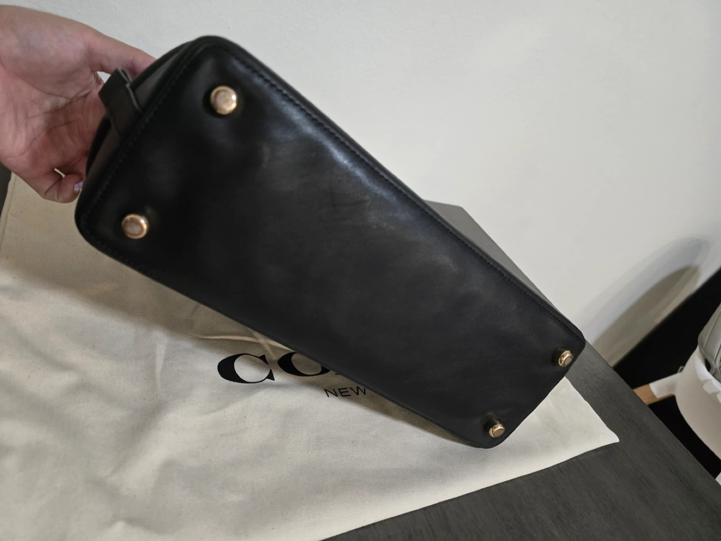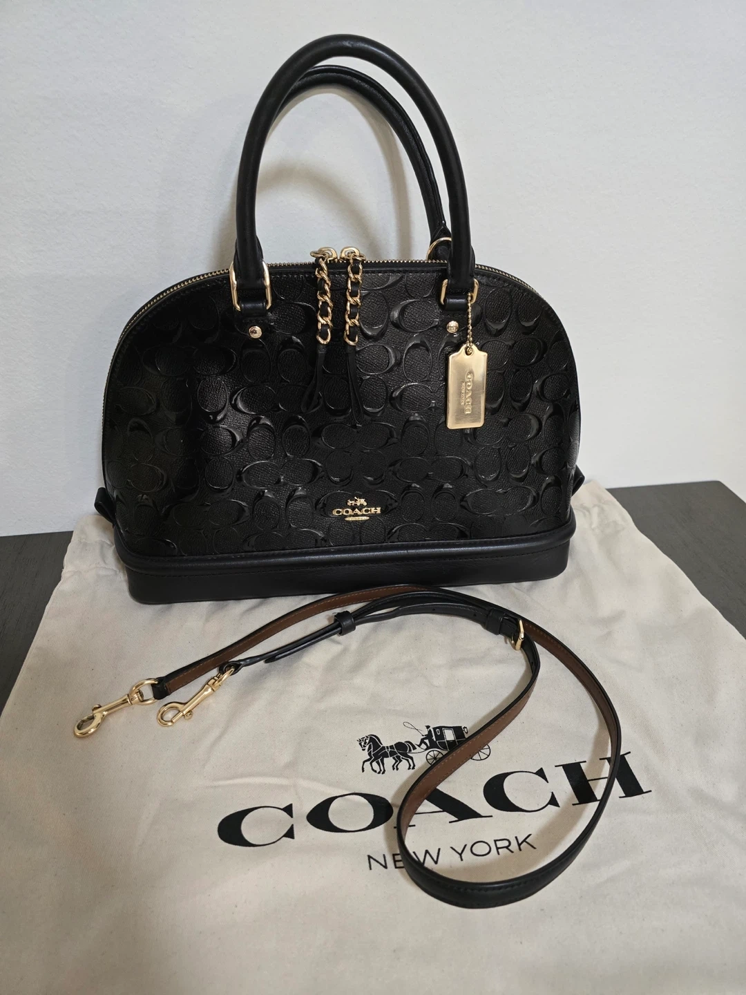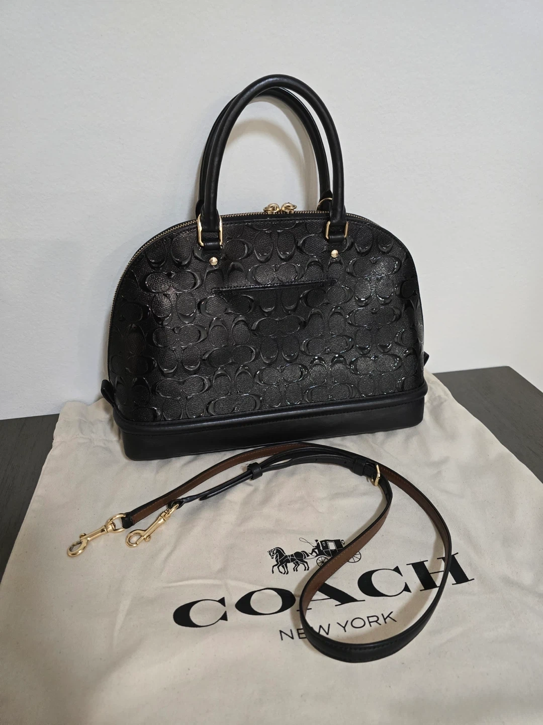 This is a black leather embossed dome satchel handbag by COACH. It's made of leather and comes with a detachable shoulder strap and dust bag. The interior features multiple pockets for organization. This bag's classic dome shape and embossed logo make it a stylish choice for everyday use!