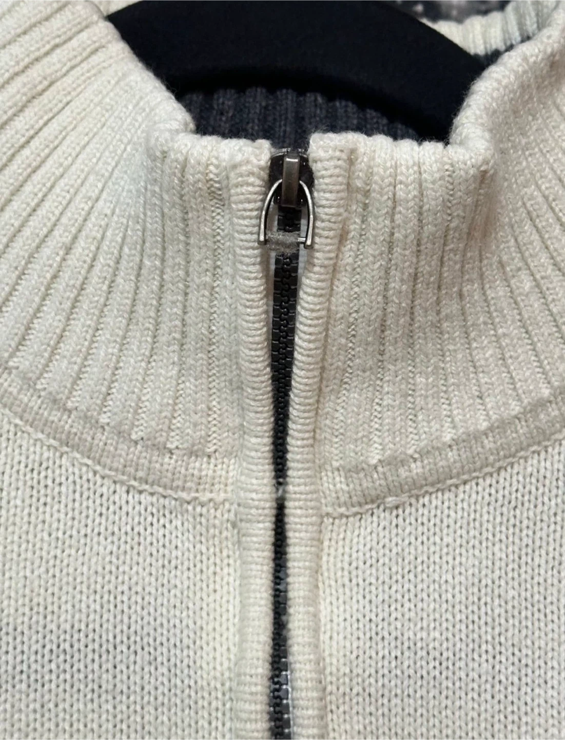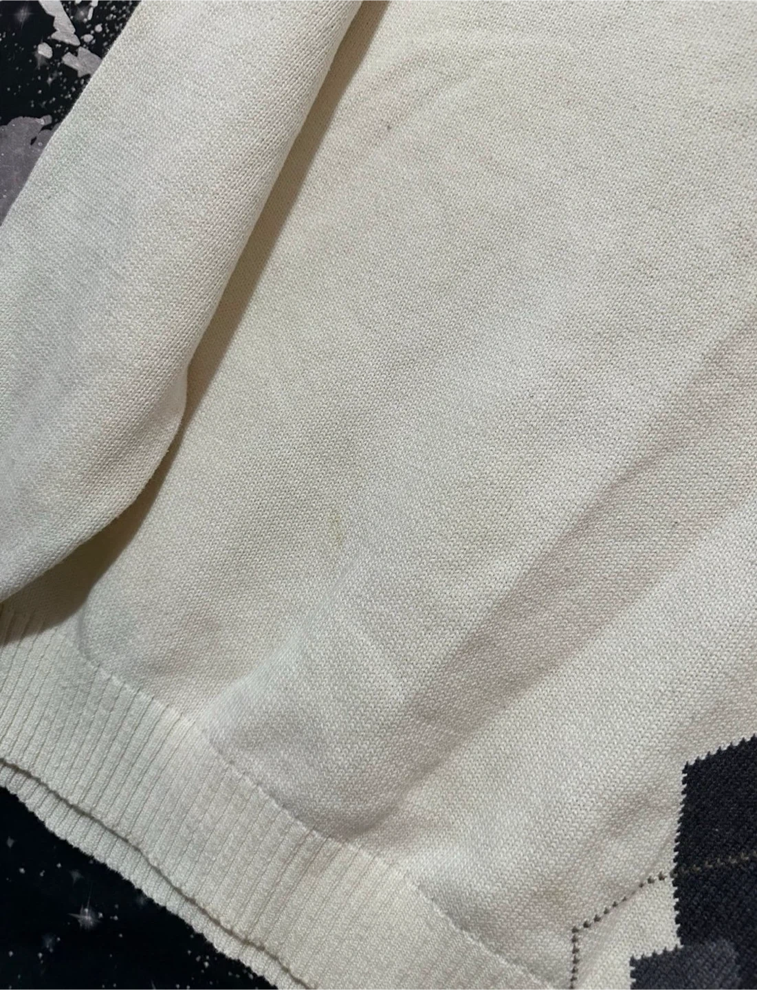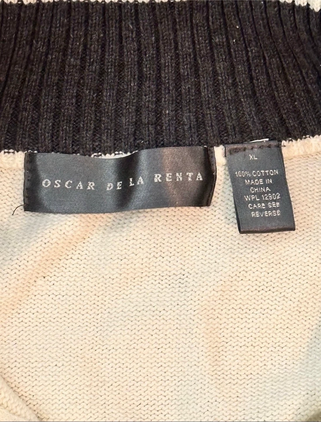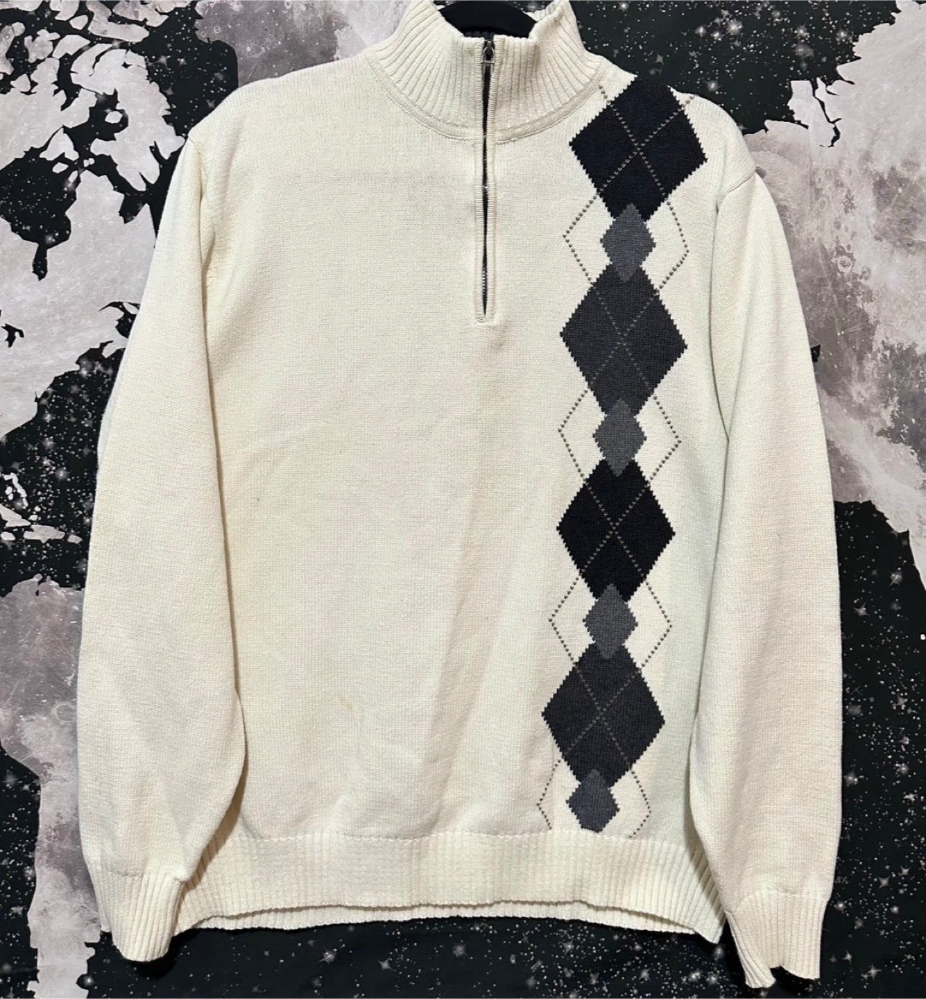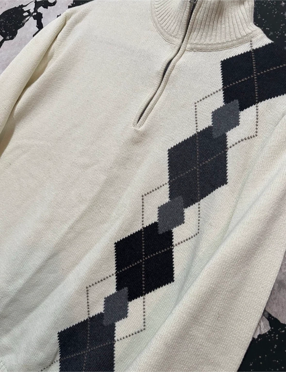 Oscar De La Renta Argyle quarter zip warm comfortable preppy style knit sweater , color is white with front diamond pattern design. Preowned condition *light area spots / missing pull tab* Sz. XL Measurements (23”x28”)