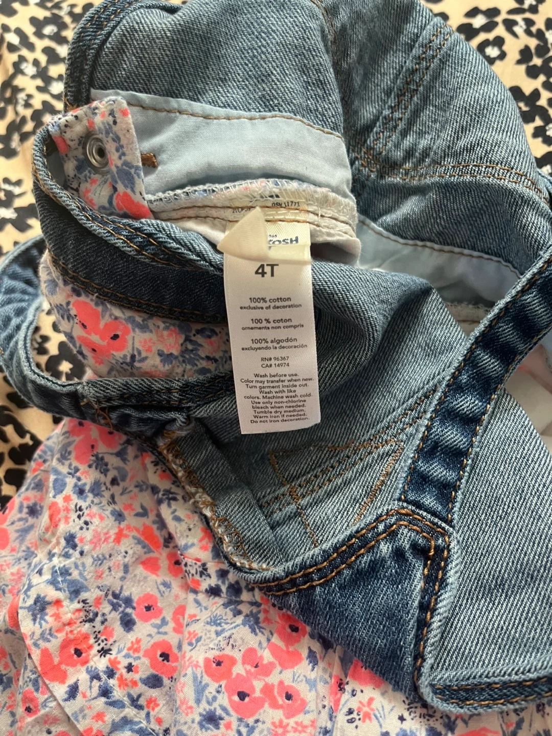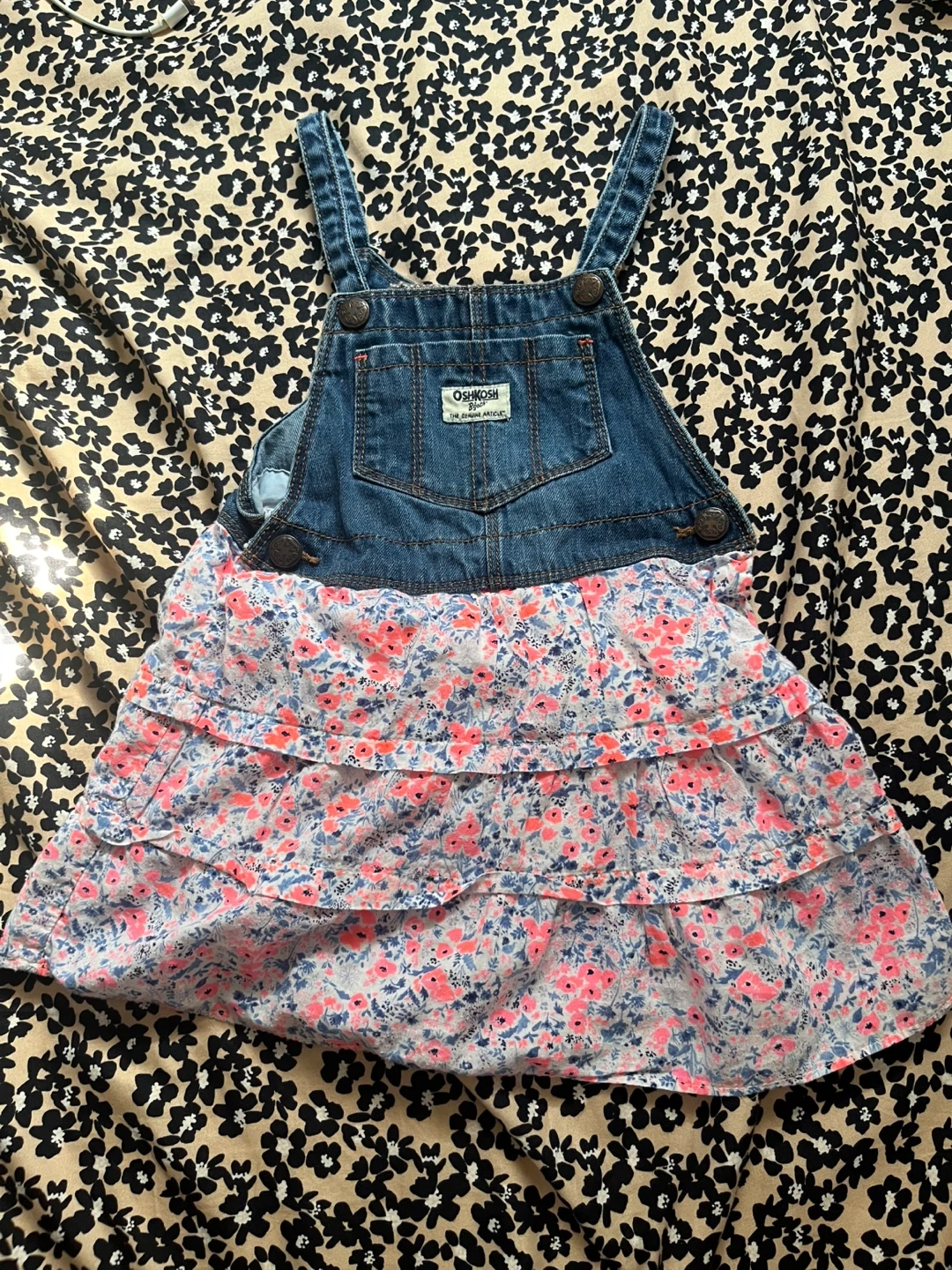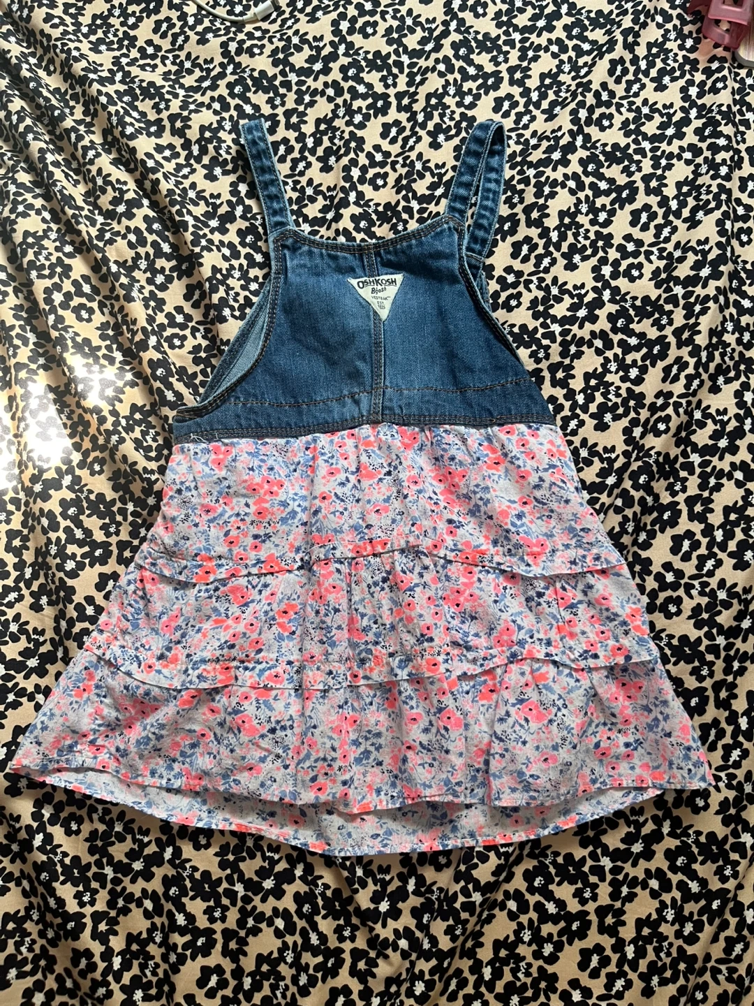 Cute OshKosh B'gosh overalls dress in size 4T! The dress features a denim top with a floral skirt. It's made of 100% cotton, making it comfy for your little one. Perfect for playdates or casual outings!