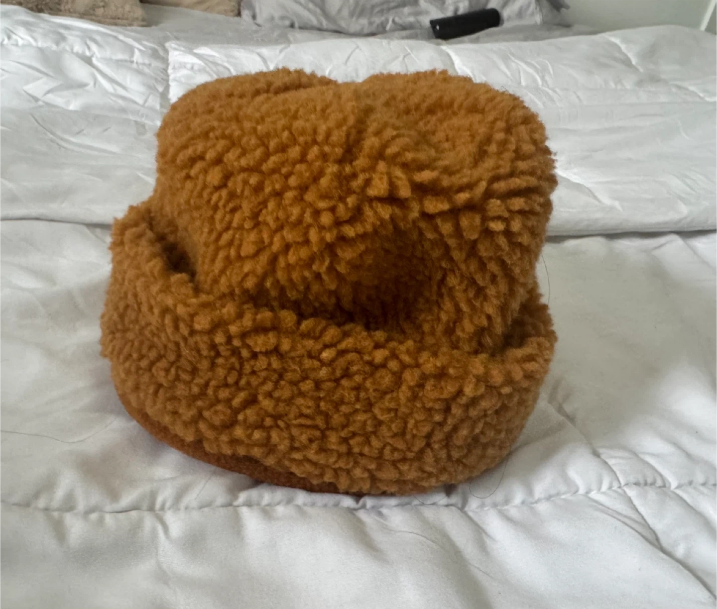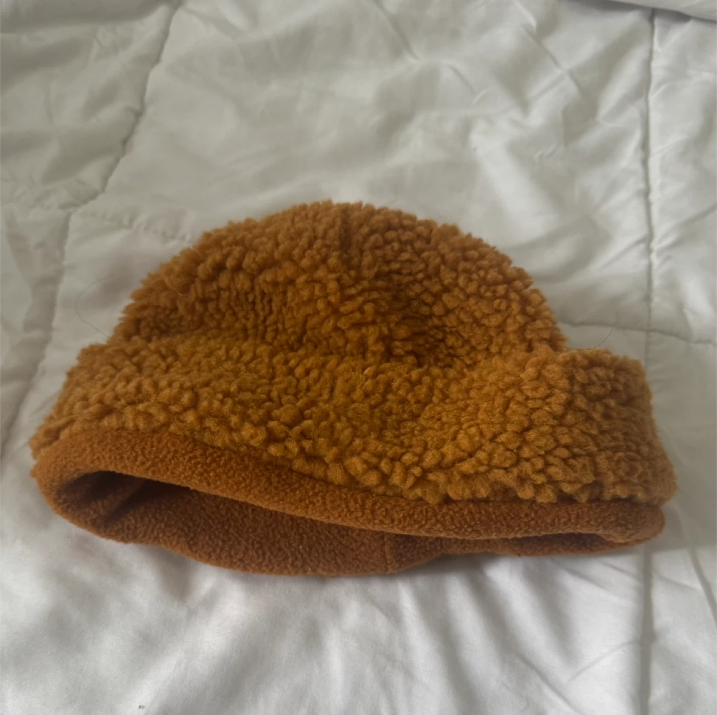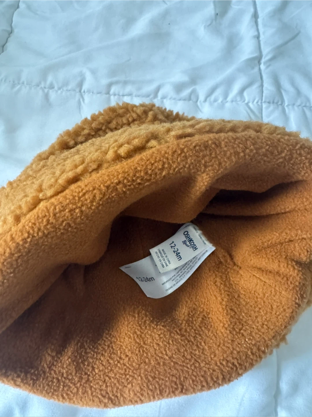 Here's a cozy OshKosh B'gosh hat for your little one! It's a soft, fuzzy hat in a warm brown color, perfect for keeping them snug. The size is 12-24 months.