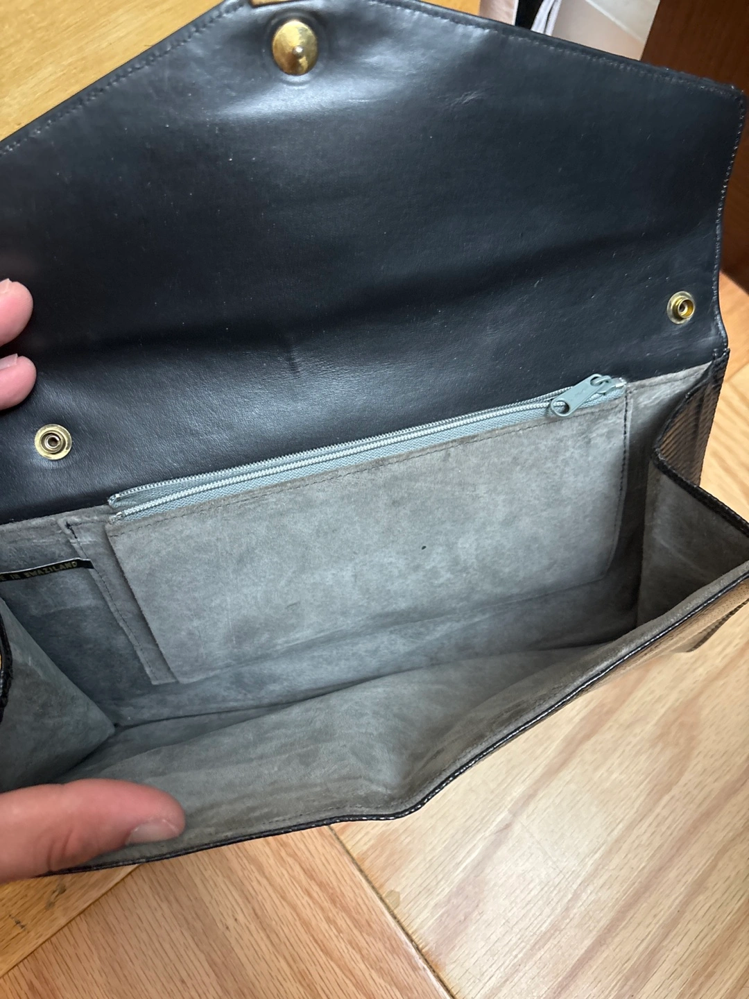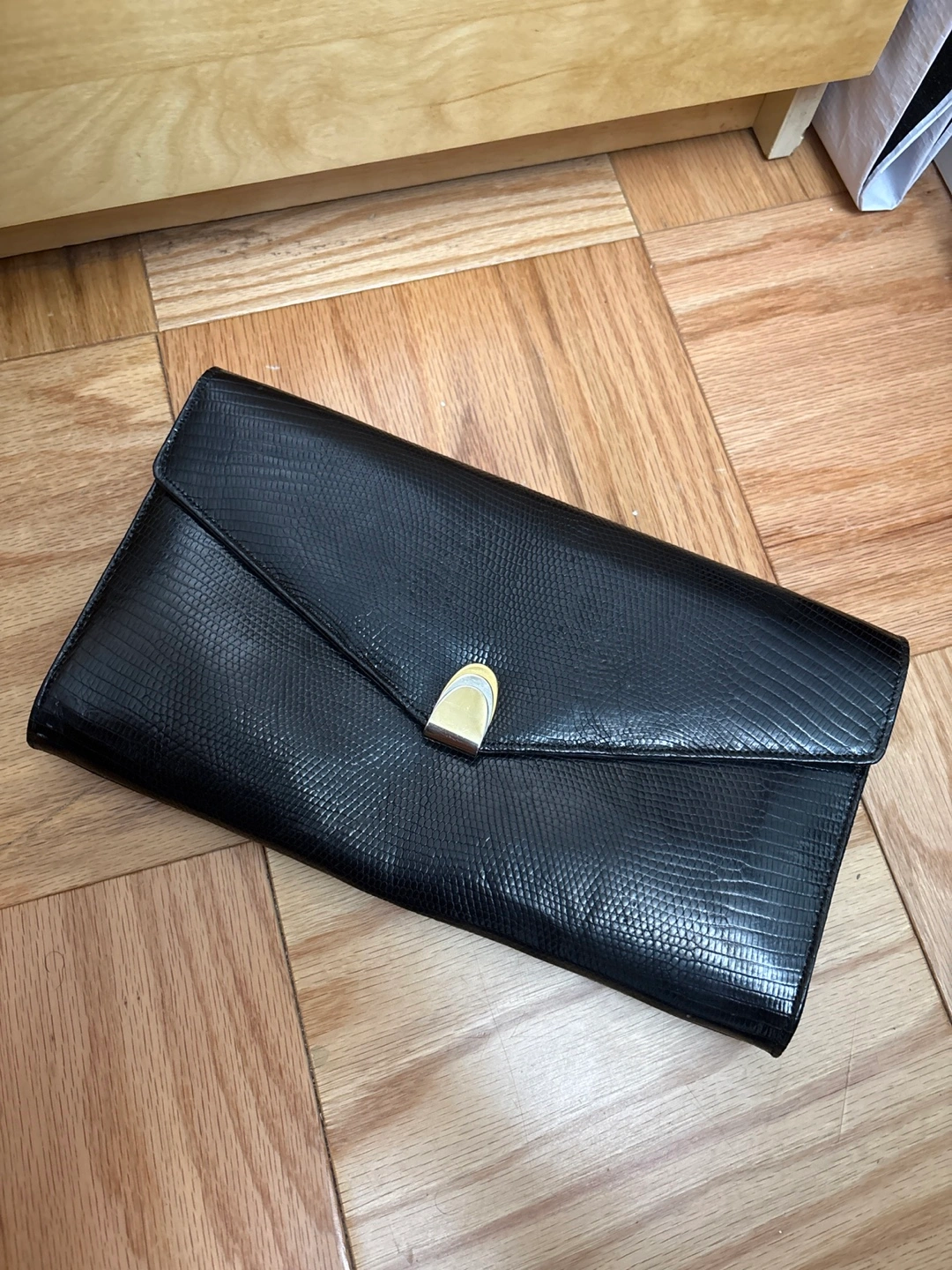 Selling a classic black leather clutch by Etienne Aigner! It's in great condition and perfect for evenings out or special occasions. The interior is lined with a soft gray material and includes a zippered pocket for added security. A stylish and timeless accessory to elevate any outfit