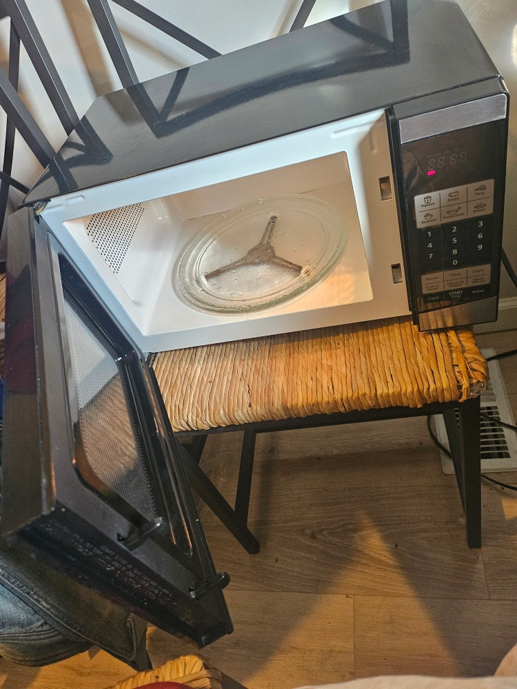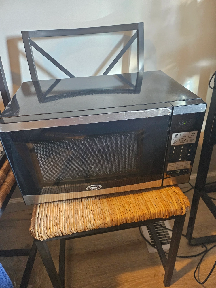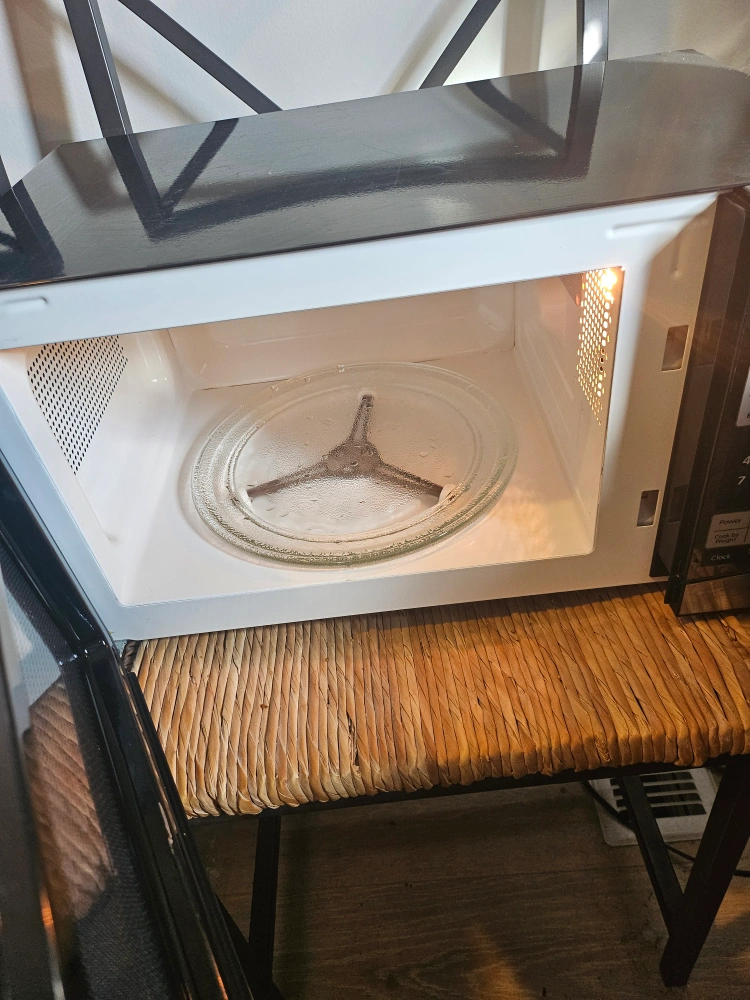 Black and silver countertop microwave in good condition. Comes with glass turntable. The door is still partly in protecting PVC