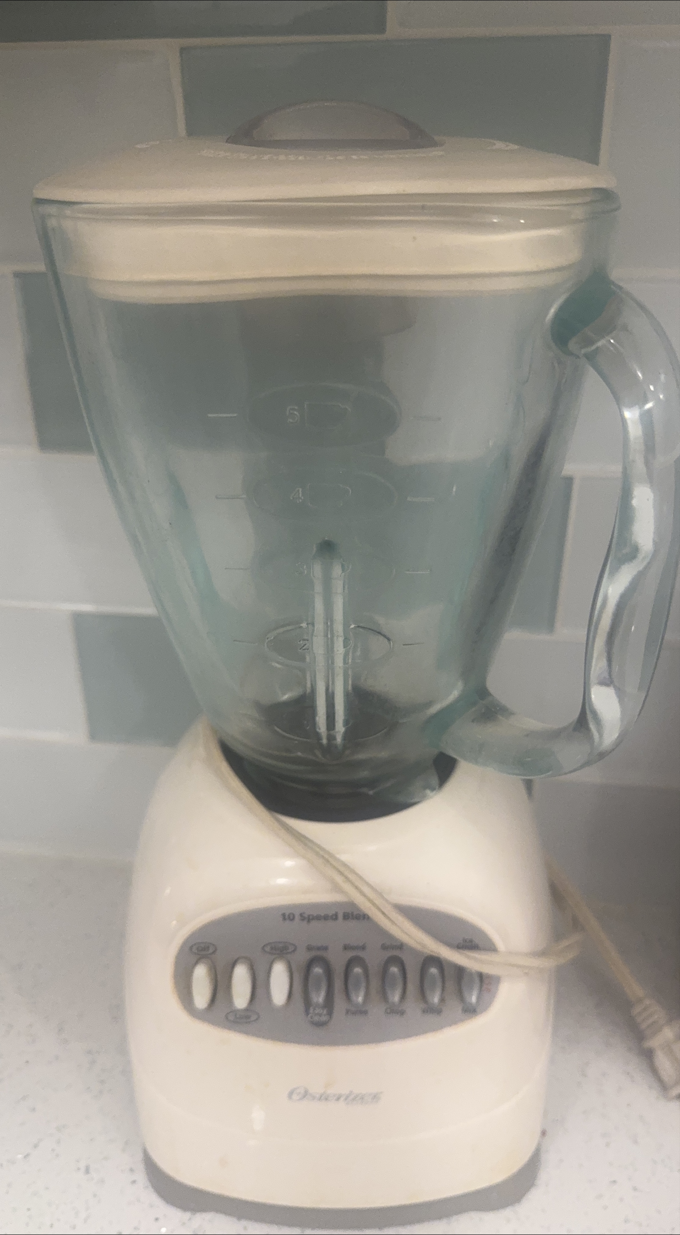 10Selling an Osterizer 10 Speed Blender. It has a glass container and multiple speed settings.