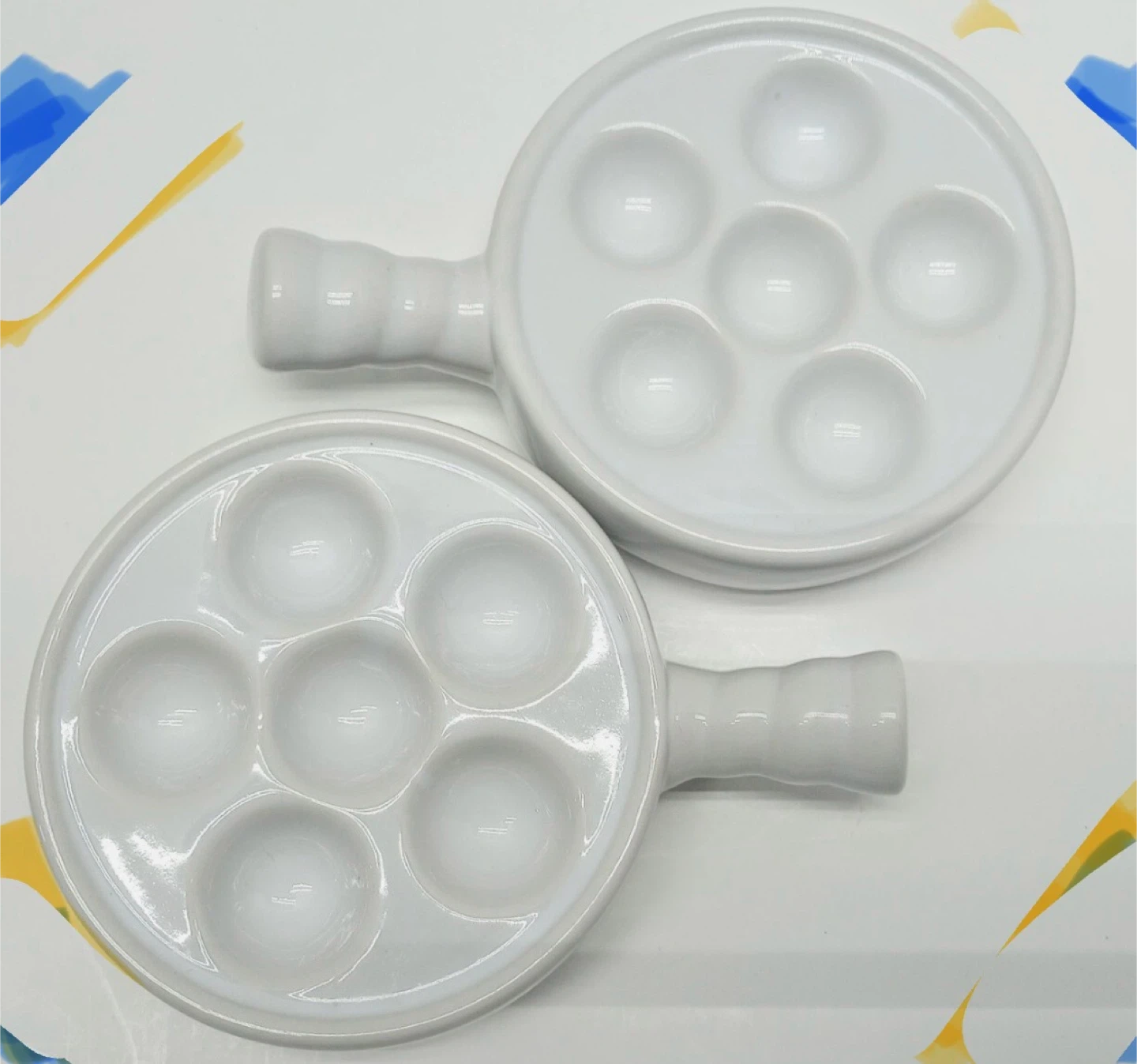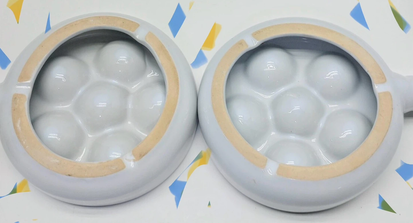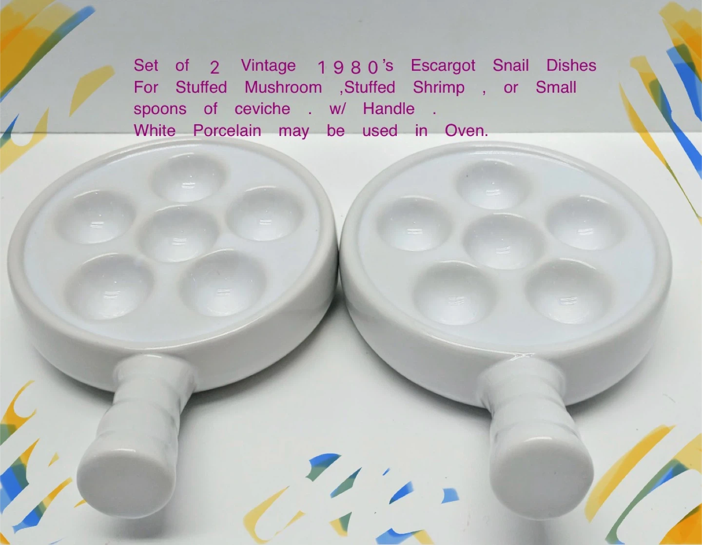 Selling a set of 2 vintage 1970’s / 80’s escargot snail dishes! These white porcelain dishes are Perfect for stuffed mushrooms, stuffed shrimp, or small spoons of ceviche. Each dish has 7 slots and a handle. Chip Resistant, Decorative, Dishwasher Safe, Freezer Safe, Handles, Microwave Safe, Refrigerator Safe, Stackable, Oven-Safe