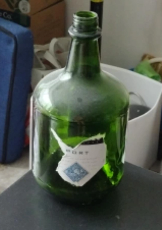 A large green glass bottle. The bottle has a short neck and wide body. It has some label remnants. This bottle can be used to hold flowers and used in other creative ways.