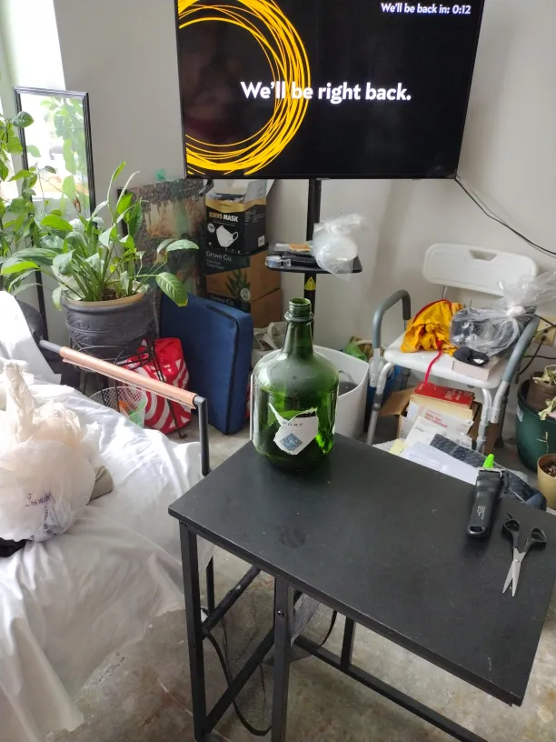 A large green glass bottle. The bottle has a short neck and wide body. It has some label remnants. This bottle can be used to hold flowers and used in other creative ways.