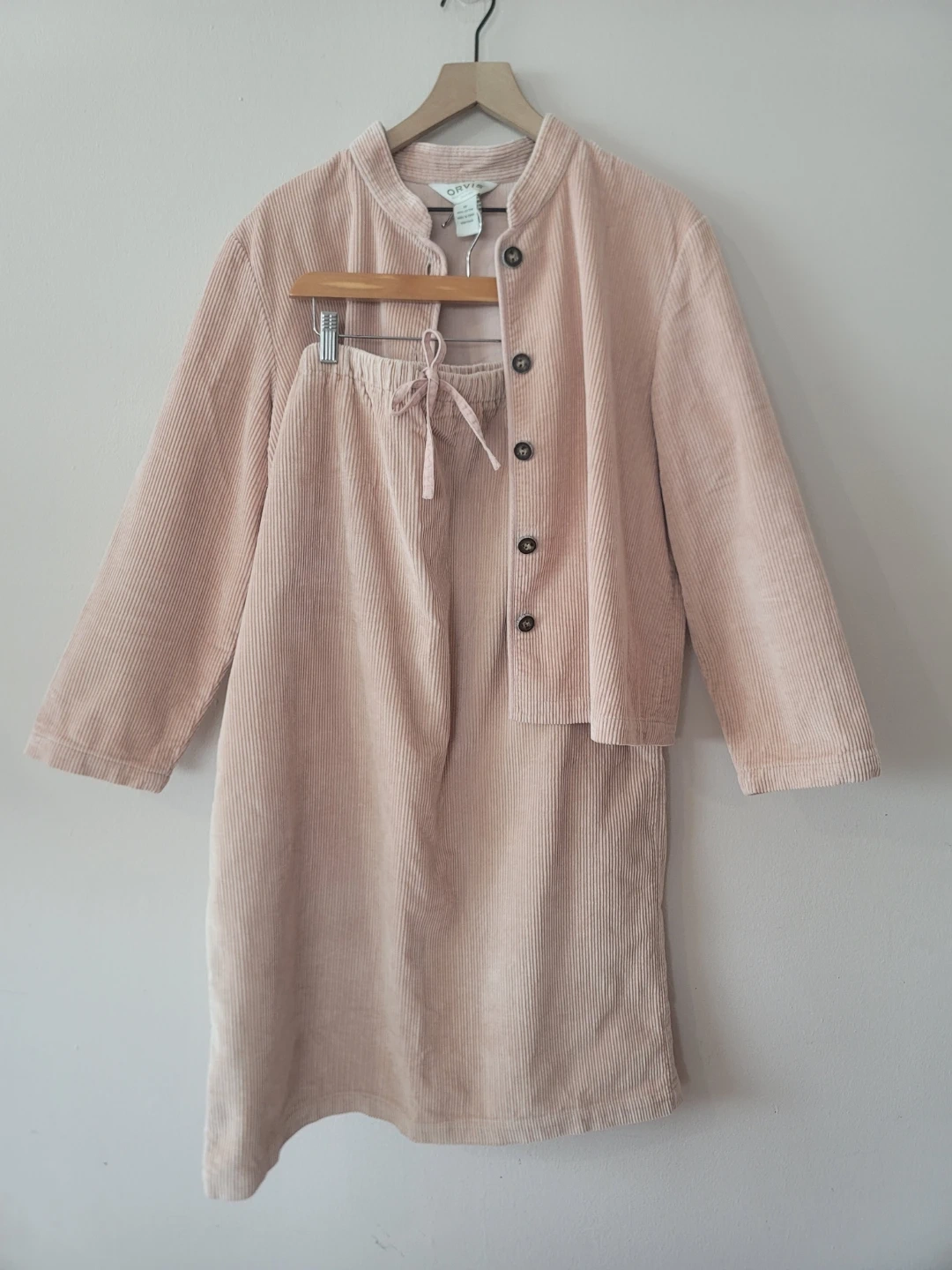 Elevate your wardrobe with this charming and versatile vintage Orvis set, featuring a matching jacket and skirt in a soft, blush pink cotton corduroy. This set perfectly blends classic comfort with timeless style, ideal for achieving several trendy aesthetics.
