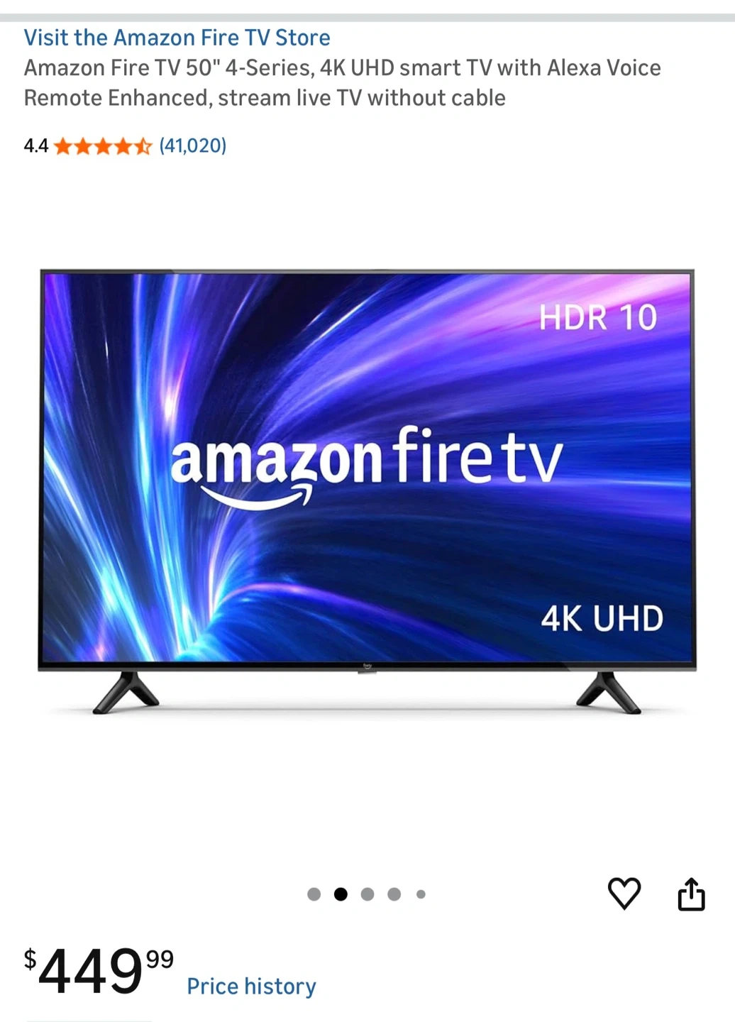 This is a 50-inch Amazon Fire TV 4-Series smart TV with 4K UHD resolution. It's a smart TV with Alexa Voice Remote Enhanced, allowing you to stream live TV without a cable subscription. It supports HDR 10.