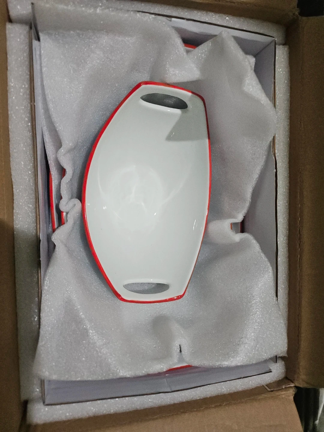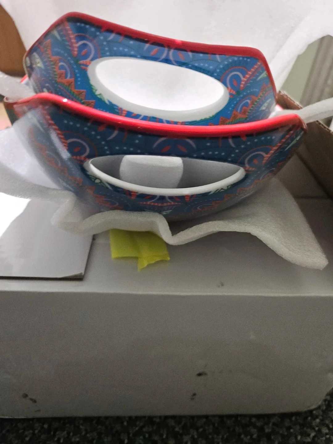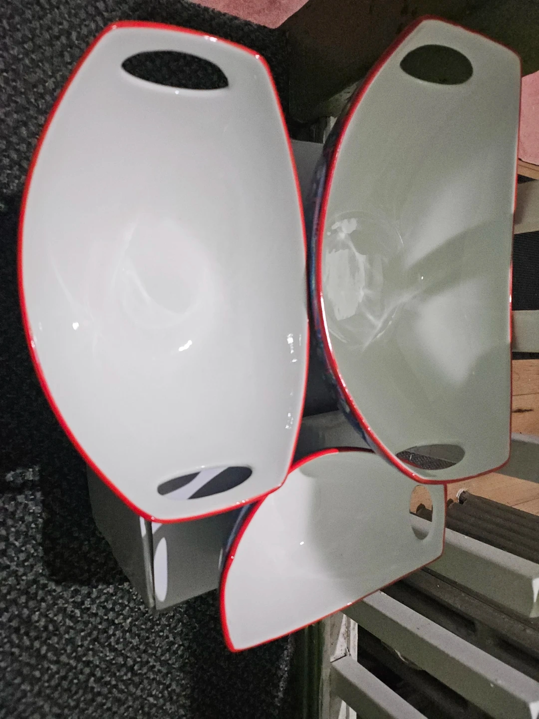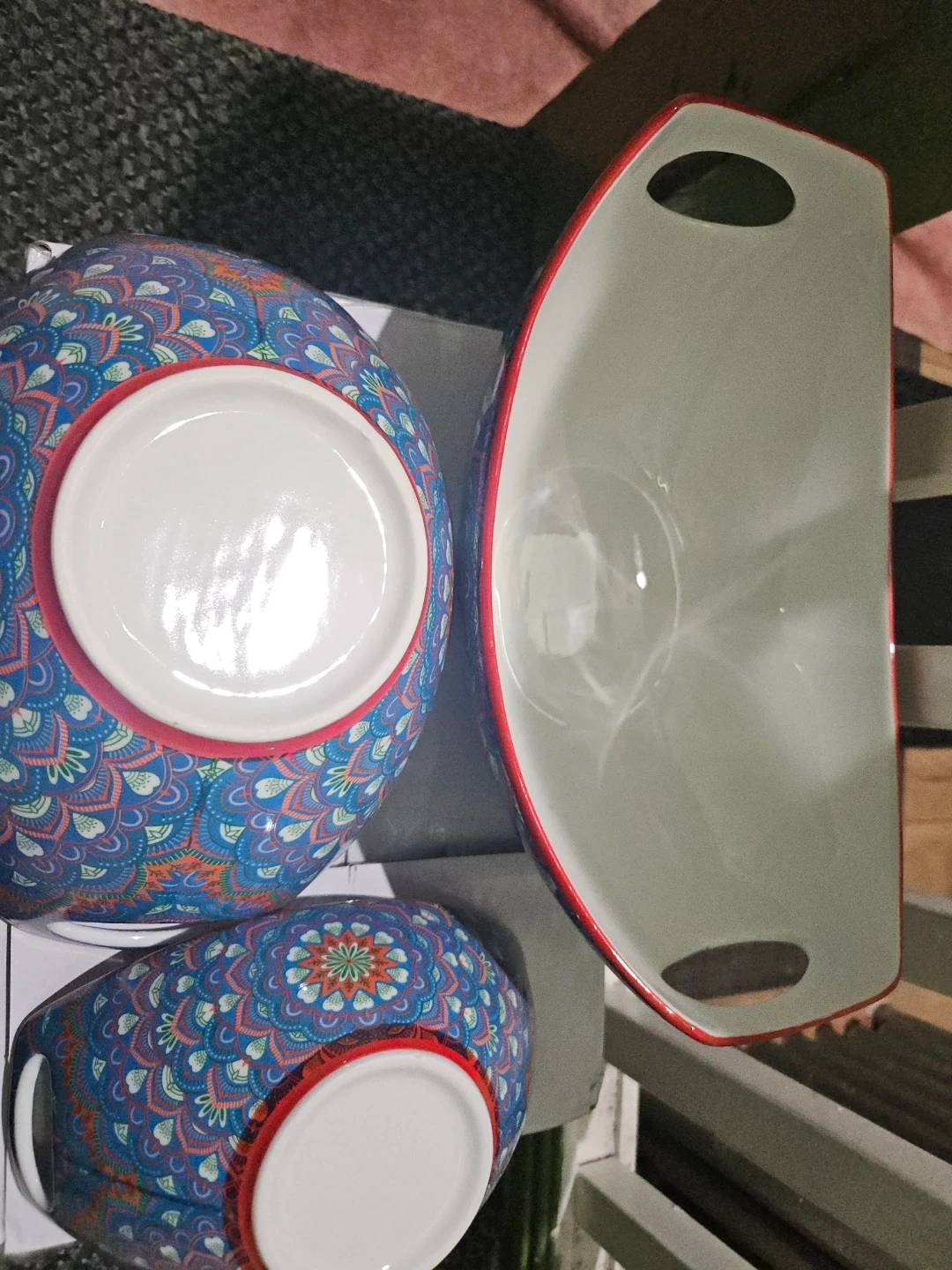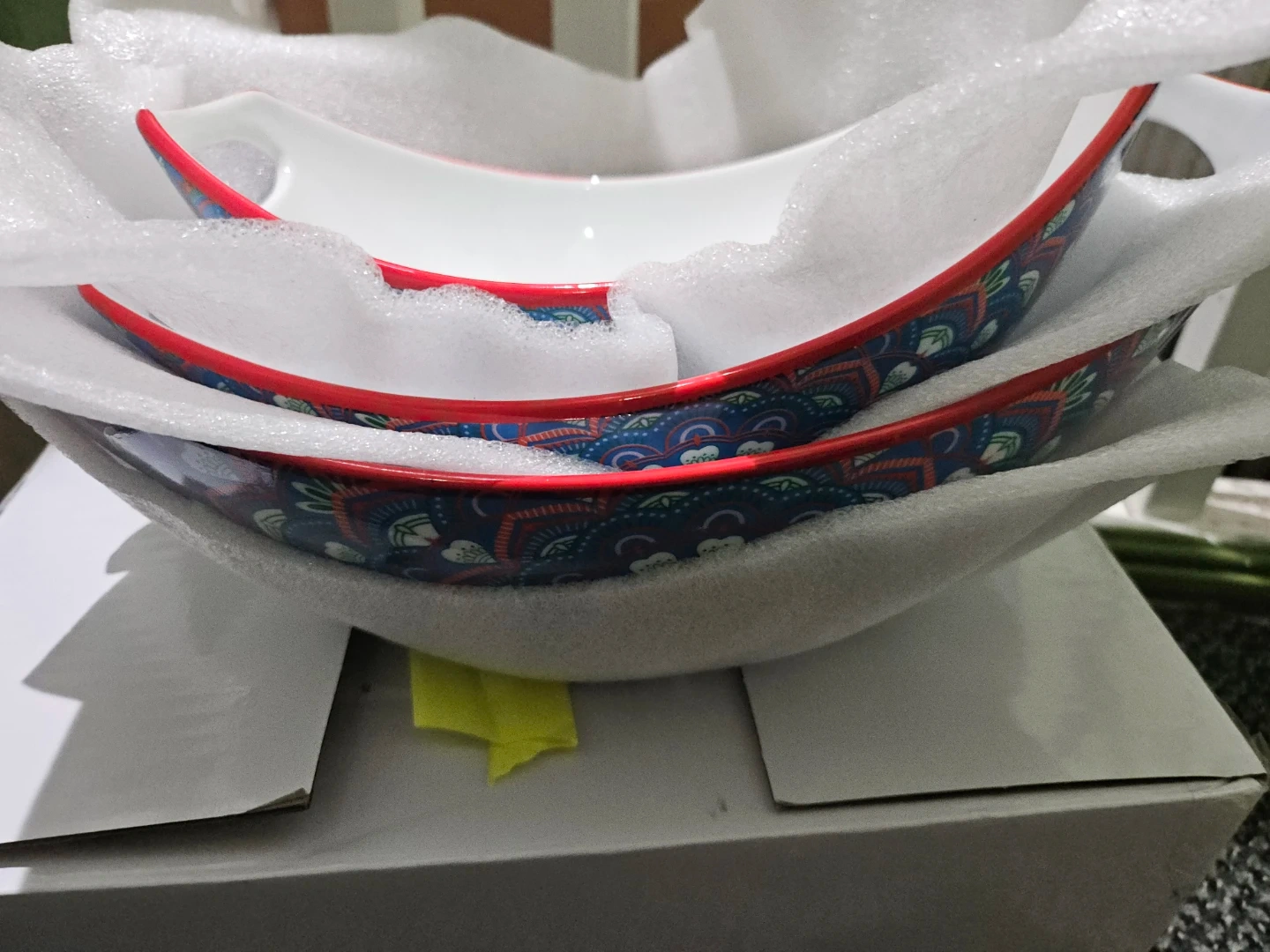 Set of three serving bowls with a decorative blue and red mandala design. Each bowl has white interior and red trim. Handles on each side make them easy to carry. Dishwasher and microwave safe.
