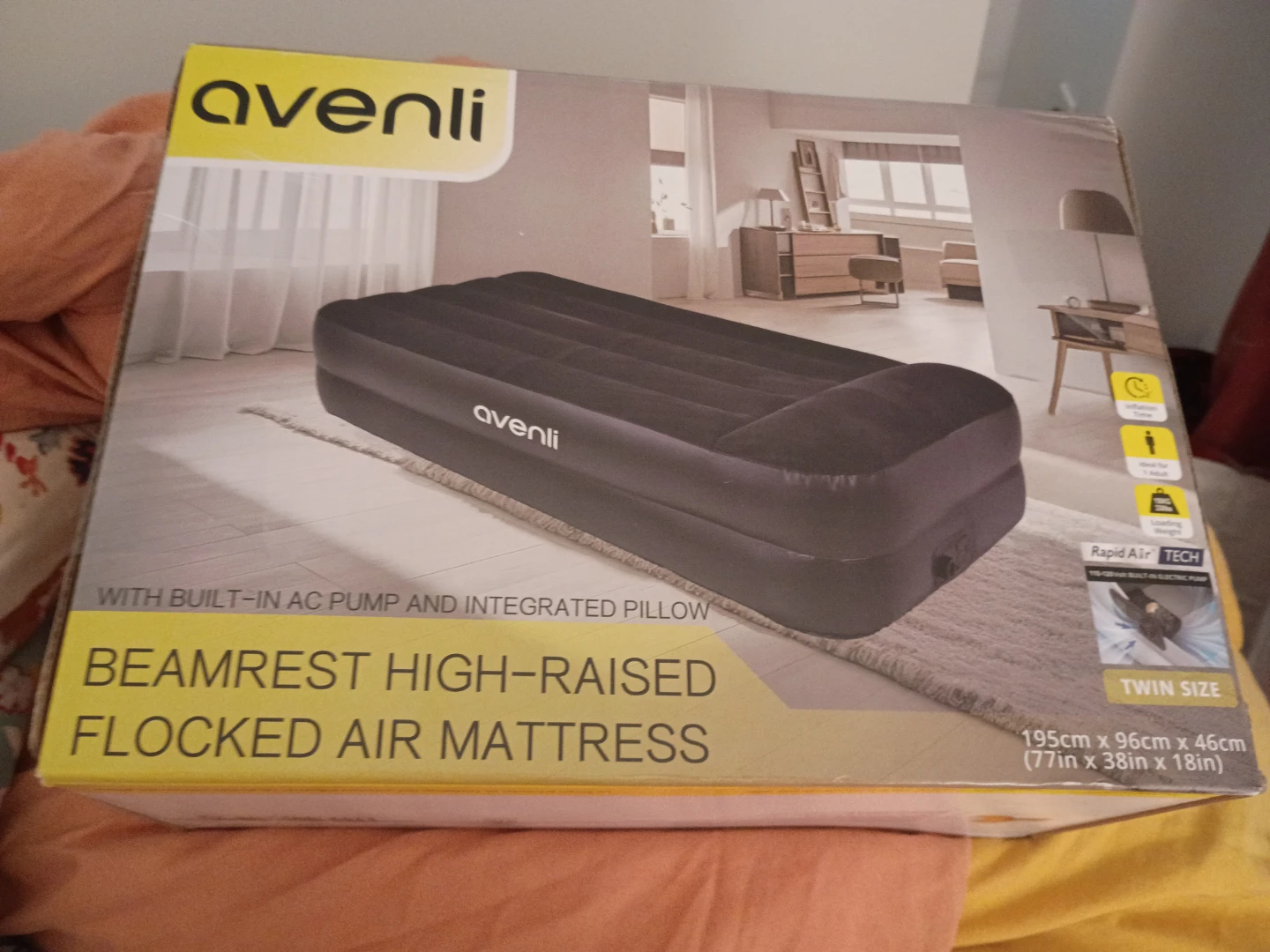 This is an Avenli Beamrest high-raised flocked air mattress. It's a twin size with a built-in AC pump and integrated pillow. Dimensions are 195cm x 96cm x 46cm (77in x 38in x 18in).