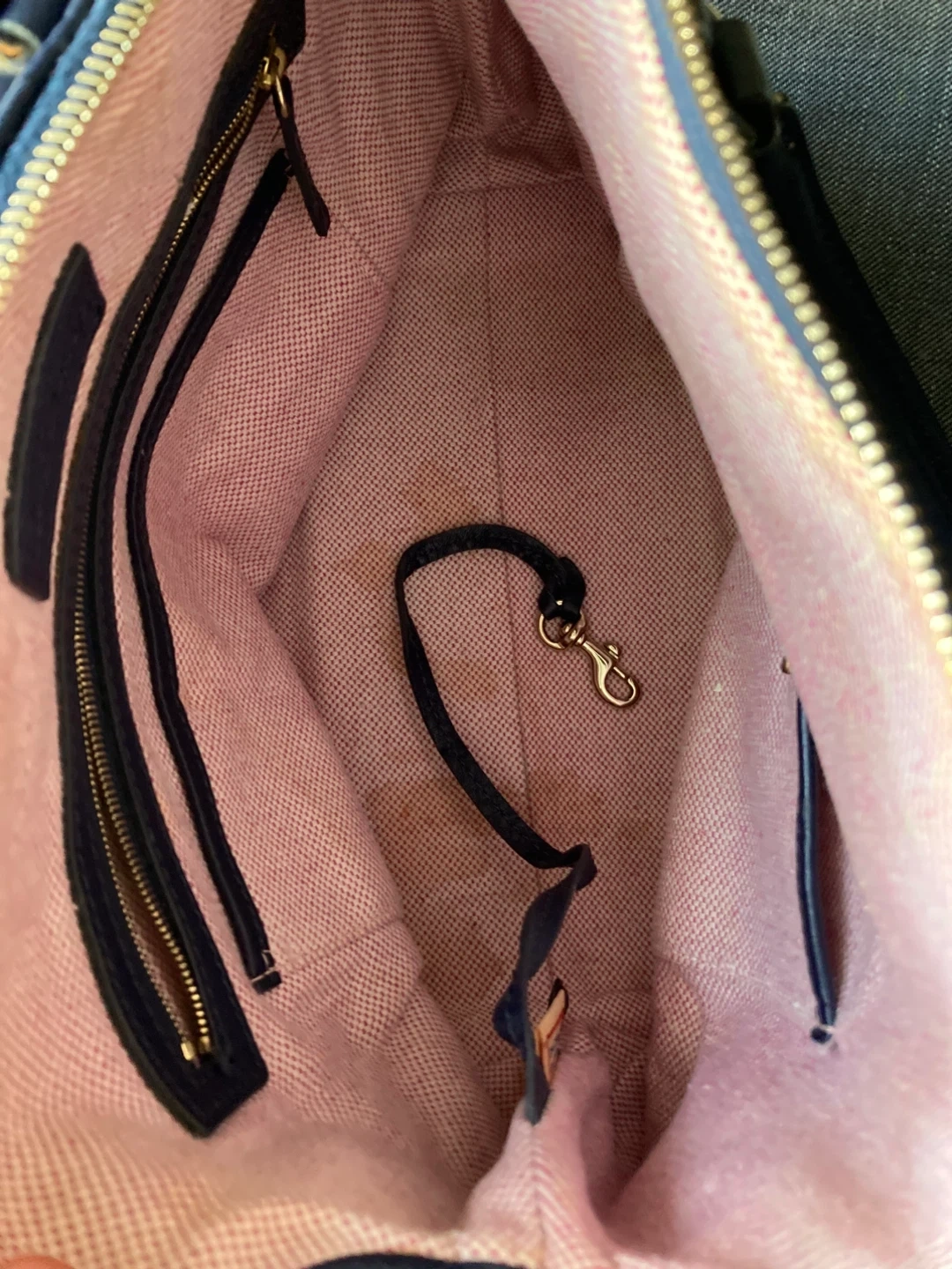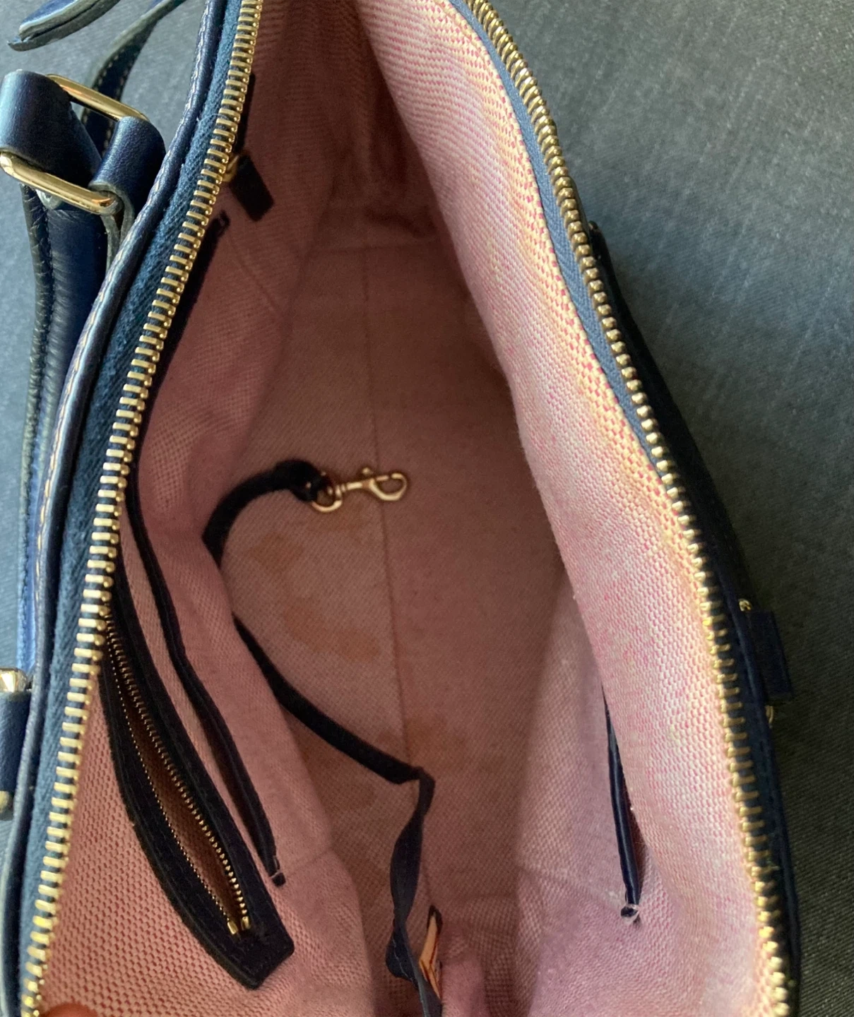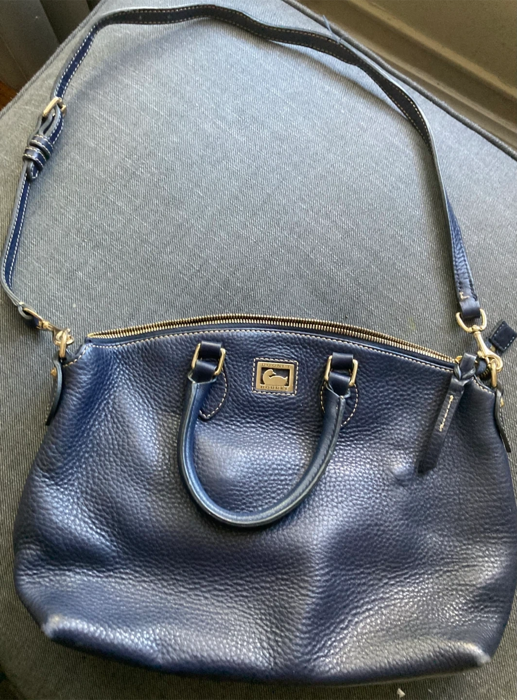 I'm selling a Dooney & Bourke satchel. It's a beautiful blue color and made of leather. It has a zipper closure and interior pockets. Perfect for everyday use!