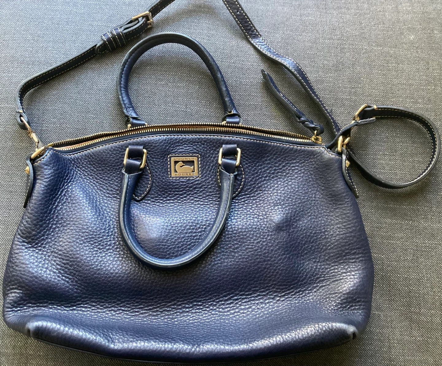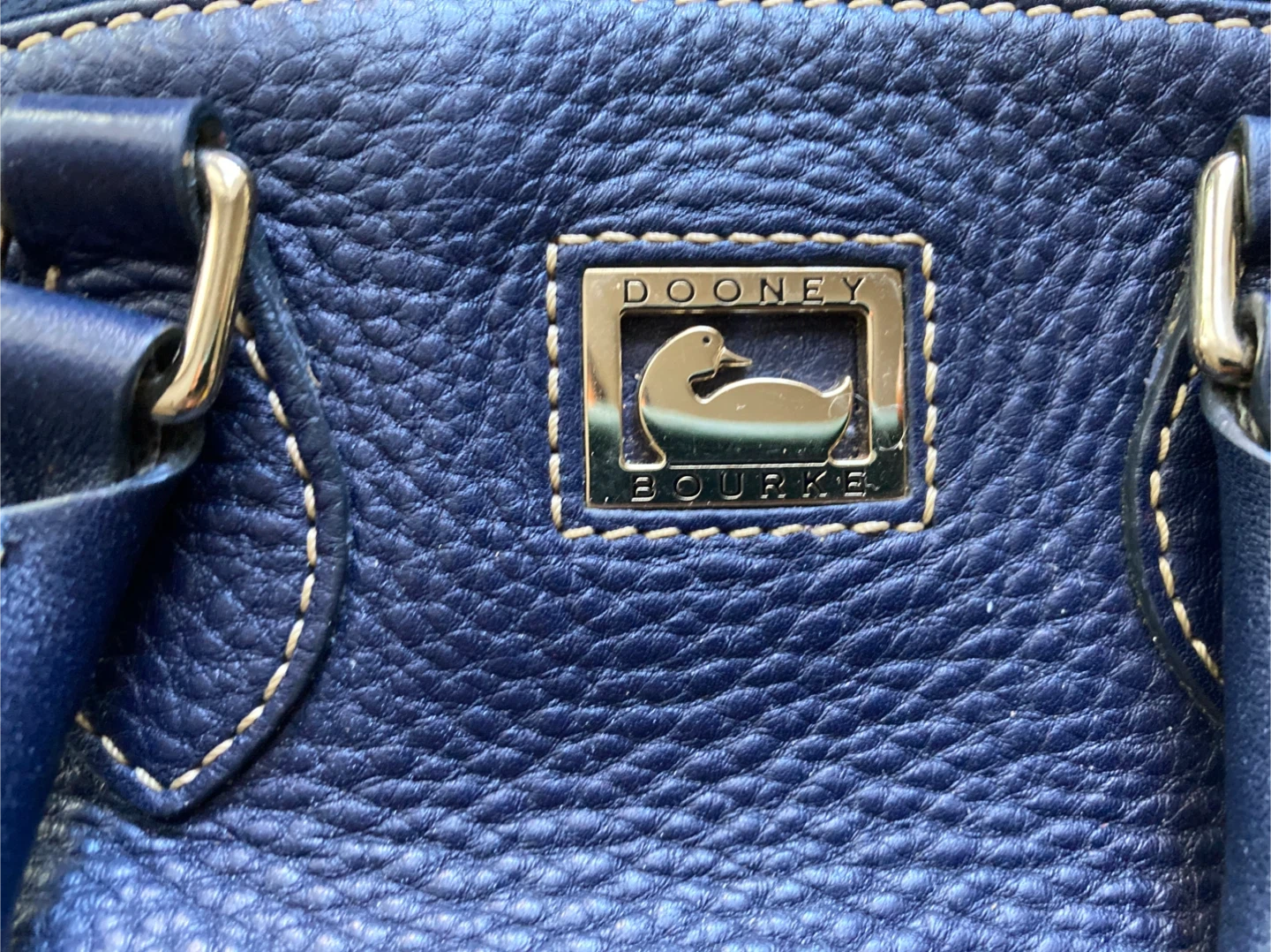 I'm selling a Dooney & Bourke satchel. It's a beautiful blue color and made of leather. It has a zipper closure and interior pockets. Perfect for everyday use!