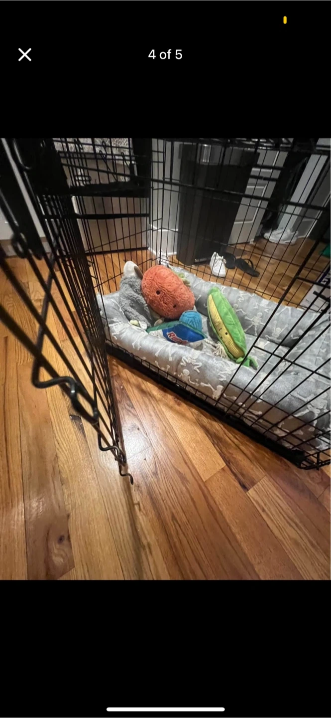Selling a used dog crate, perfect for your furry friend. It comes with a comfy pad and some toys to keep them entertained. It's in good condition and ready for a new home