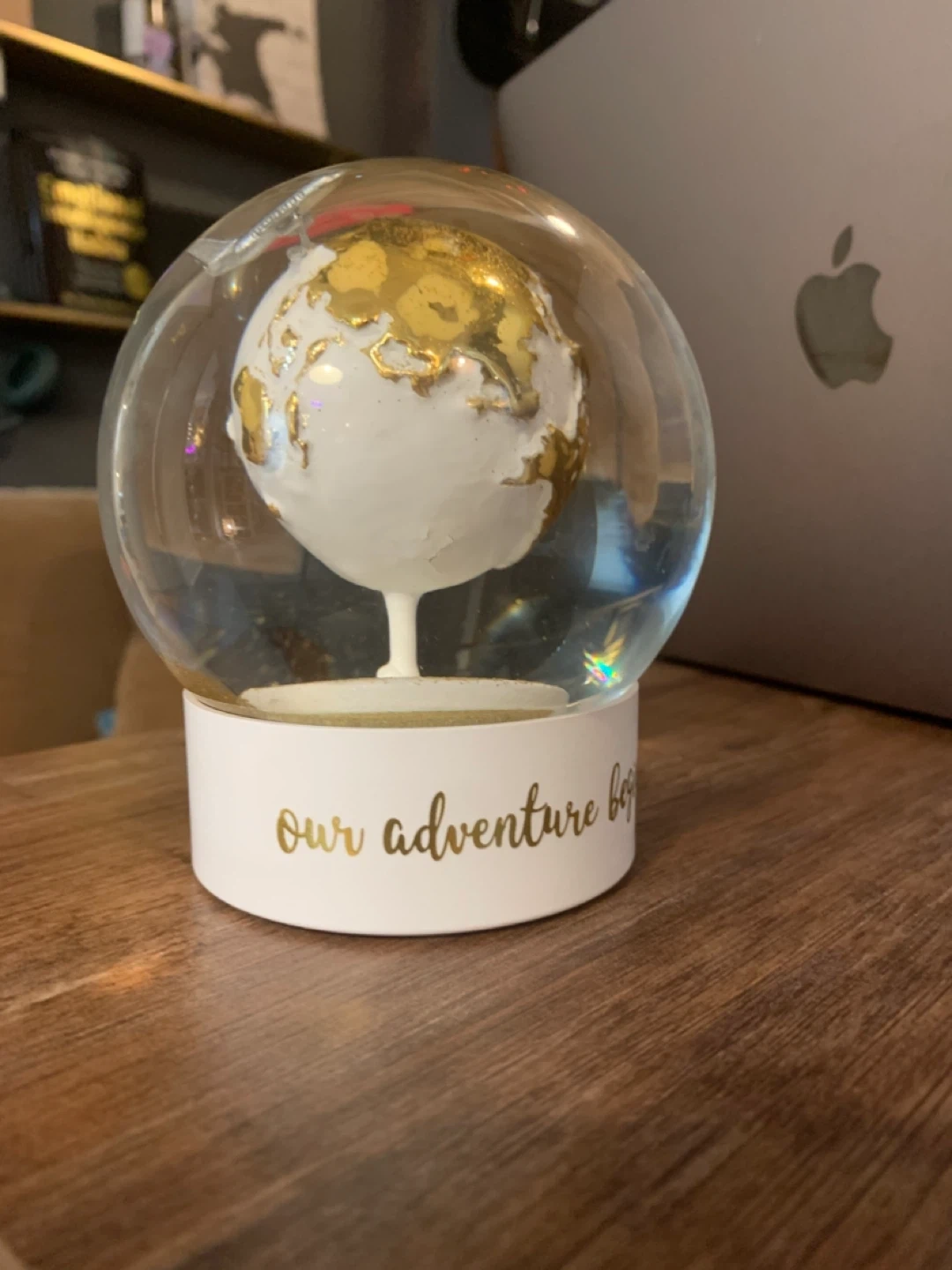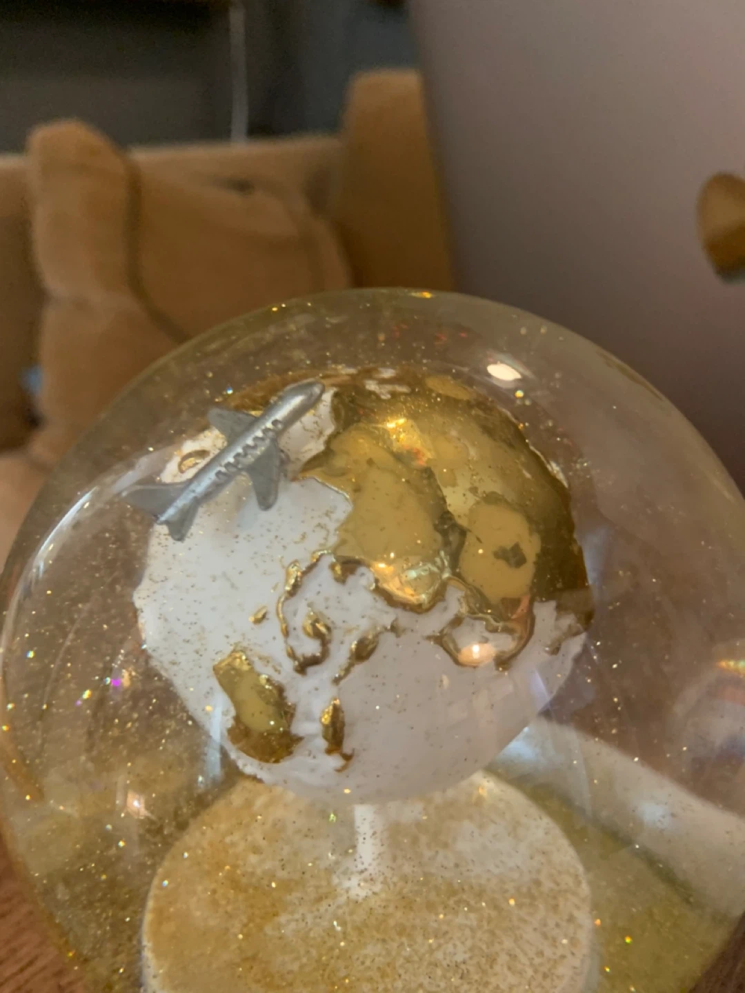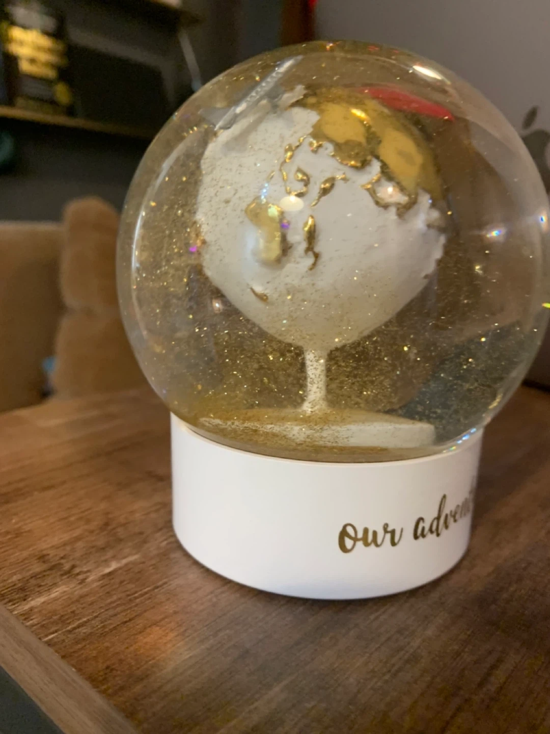 Add a touch of wanderlust to your space with this charming snow globe! It’s like a regular snow globe, yet with gold glitter.