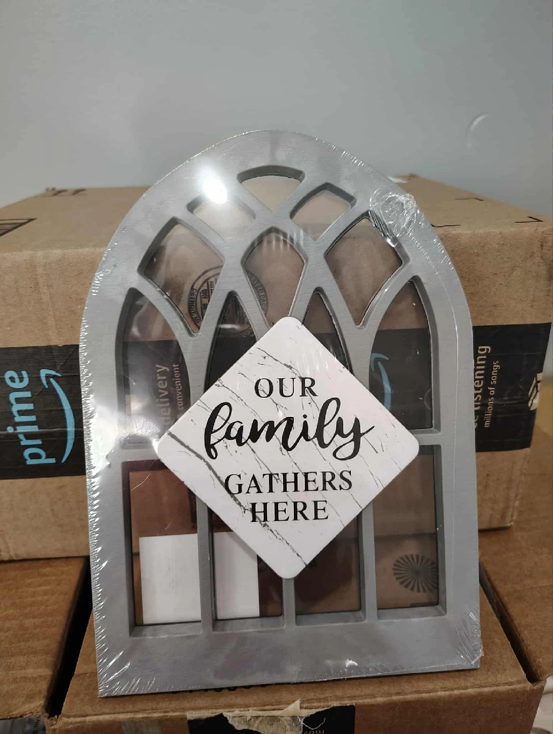 I'm selling a super cute window frame that says, "Our Family Gathers Here"! It is in the original packaging and ready to be displayed in your home