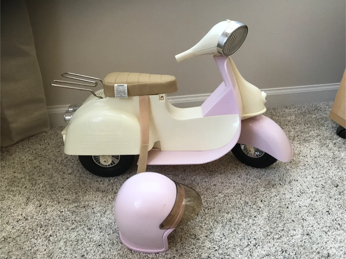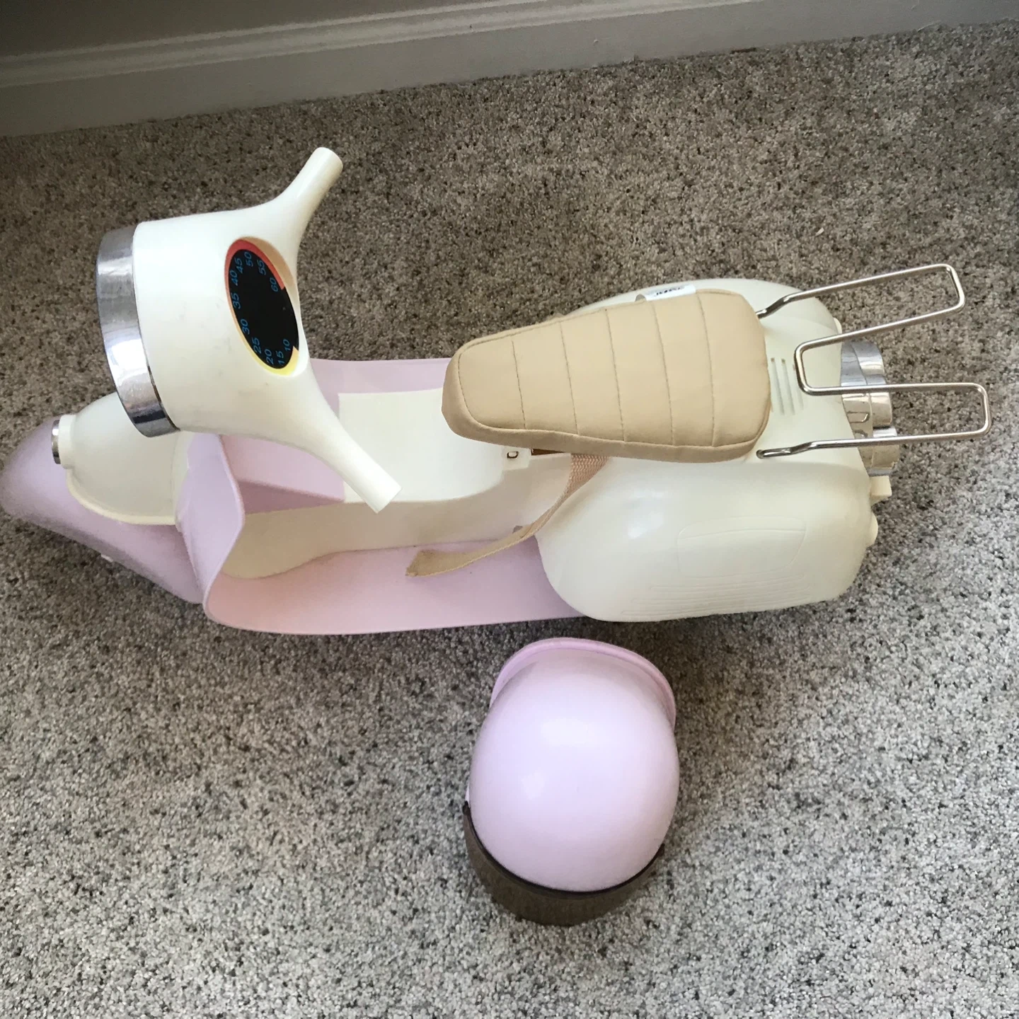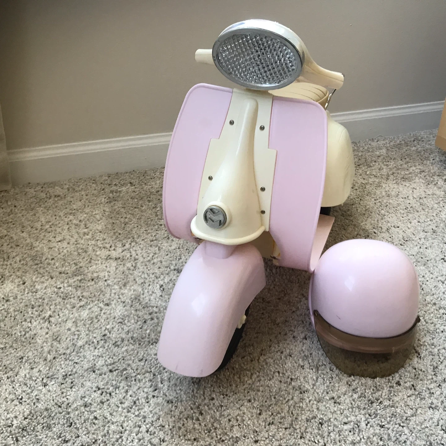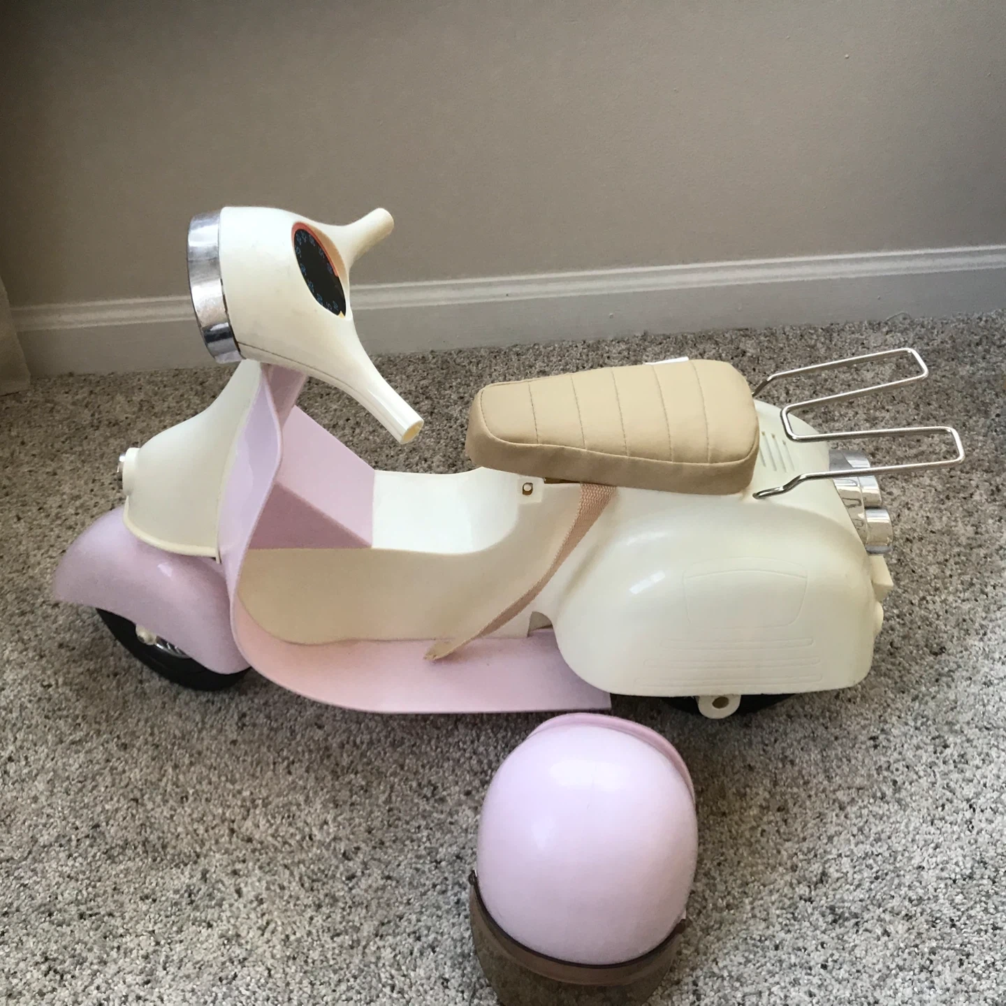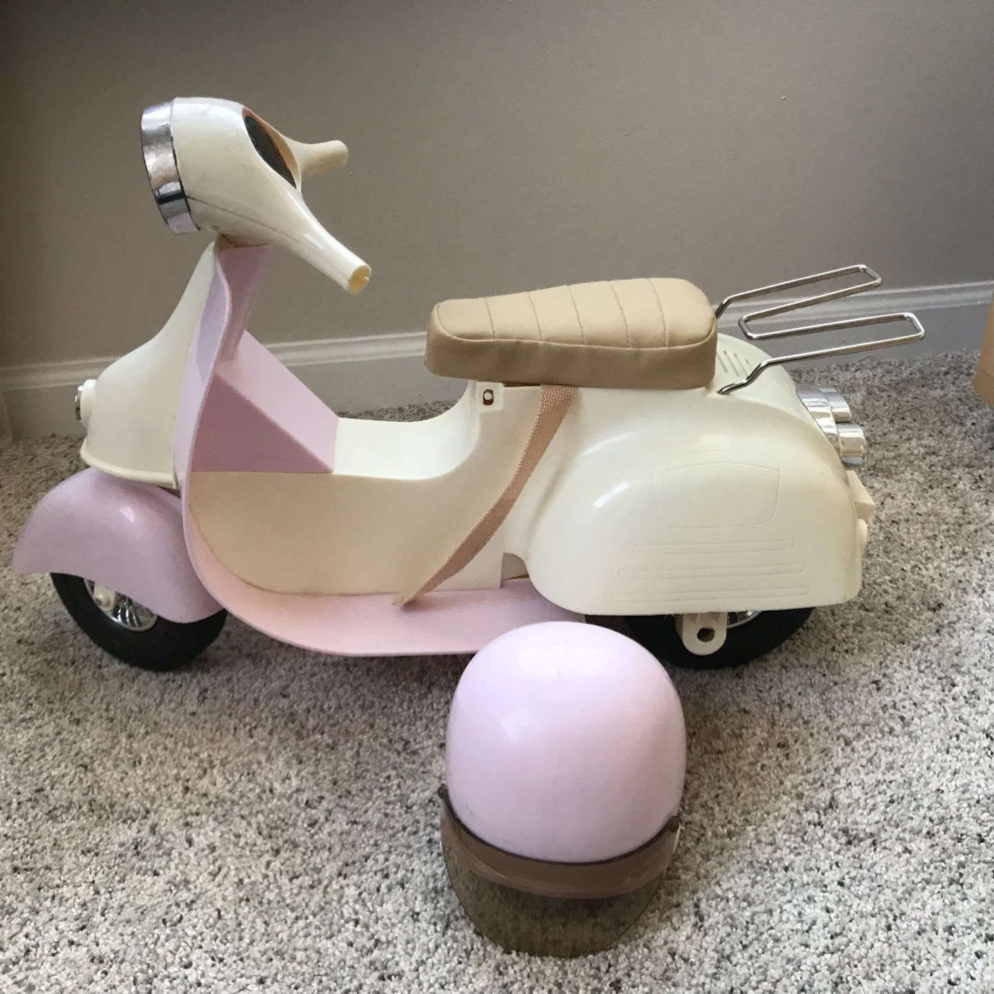 65Selling an Our Generation retro scooter with a matching helmet! This adorable set is perfect for dolls who love to cruise in style. The scooter features a cute design, and the helmet ensures safety during their imaginative adventures. Pieces missing from handlebars. See photos