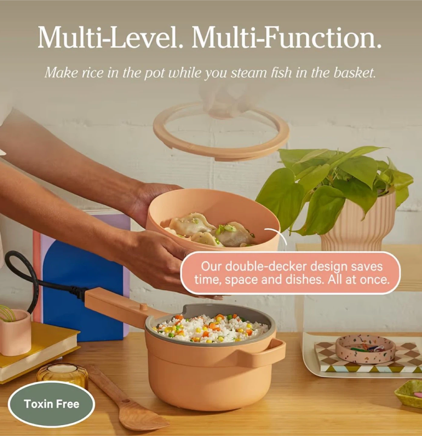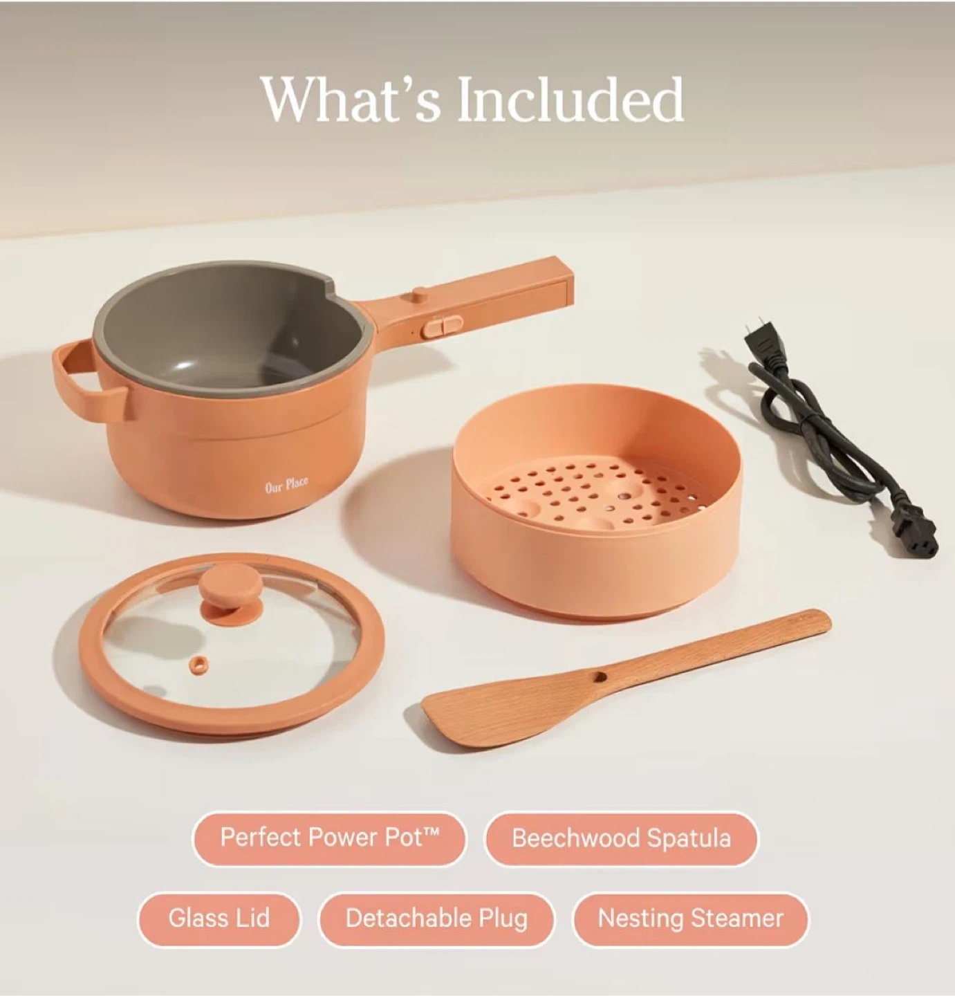 62I'm selling an Our Place Perfect Power Pot! It's a compact electric pot perfect for cooking on the go or without a kitchen. It has a 1.7 Qt | 1.6 L capacity and preheats in 90 seconds. The double-decker design saves time, space and dishes all at once! Included are the Perfect Power Pot, beechwood spatula, glass lid, detachable plug, and nesting steamer