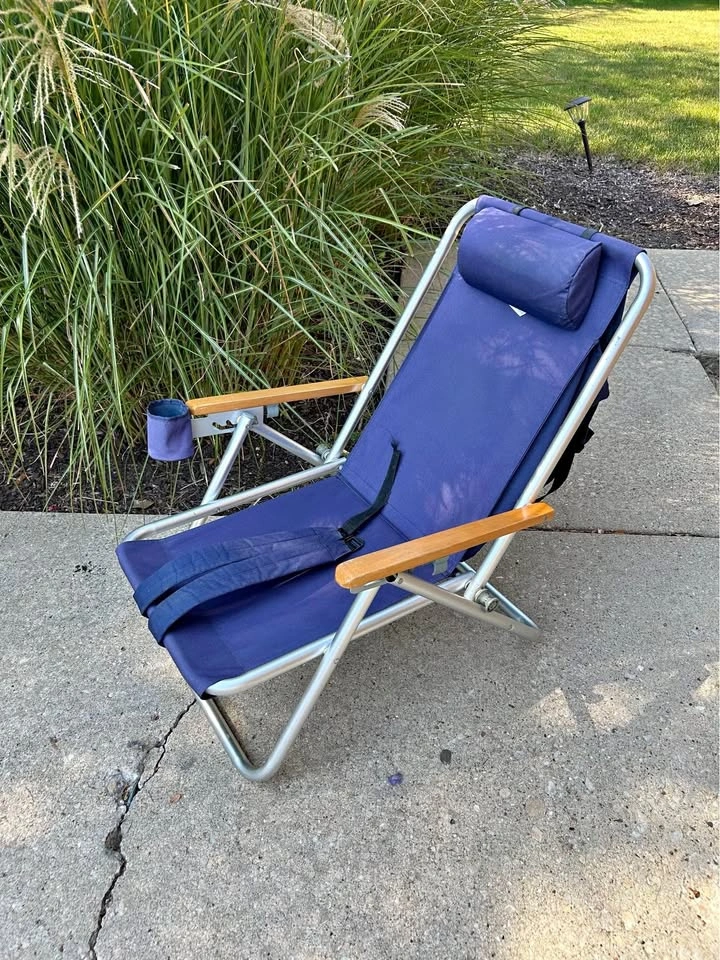 Rio Gear Beach Chair that can be worn like a backpack. Features: Cupholder and pillow Backpack straps Large back pouch Easily foldable and lockable Located in new Lenox! Let me know if you have any questions or need more pictures!