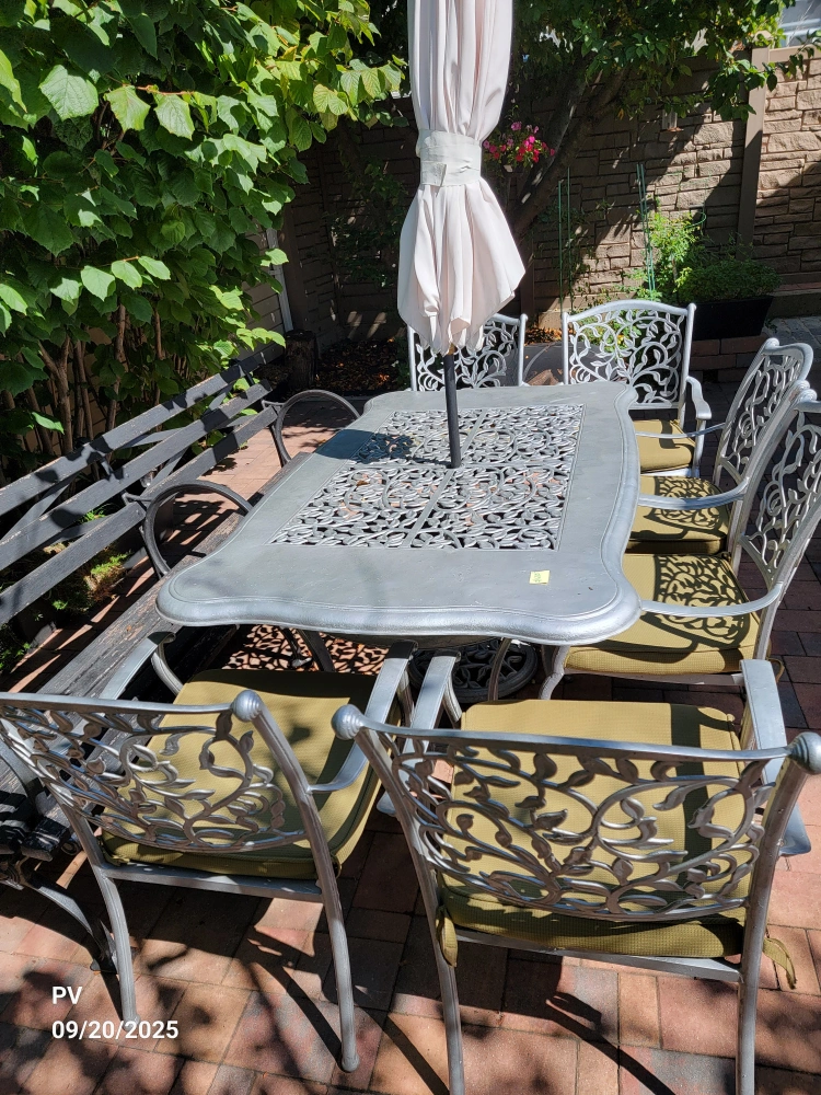 Selling an outdoor aluminum dining set that includes a table and chairs. The set features a decorative leaf pattern on the chair backs and a matching design on the tabletop. The cushions are a neutral color, complementing the silver-tone metal frames. Perfect for enjoying meals outside!