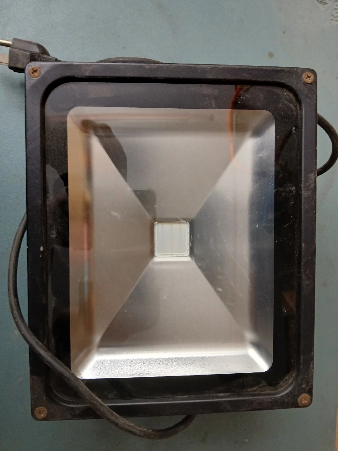 Selling an outdoor flood light. It's black and appears to be in good working condition. Perfect for lighting up your yard or workspace!