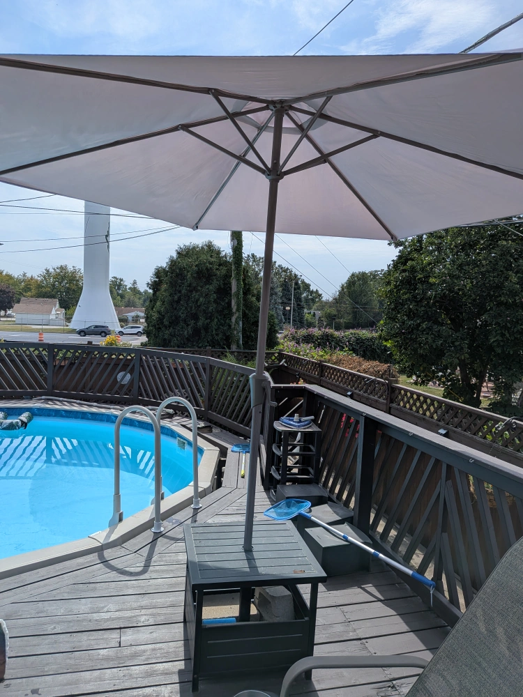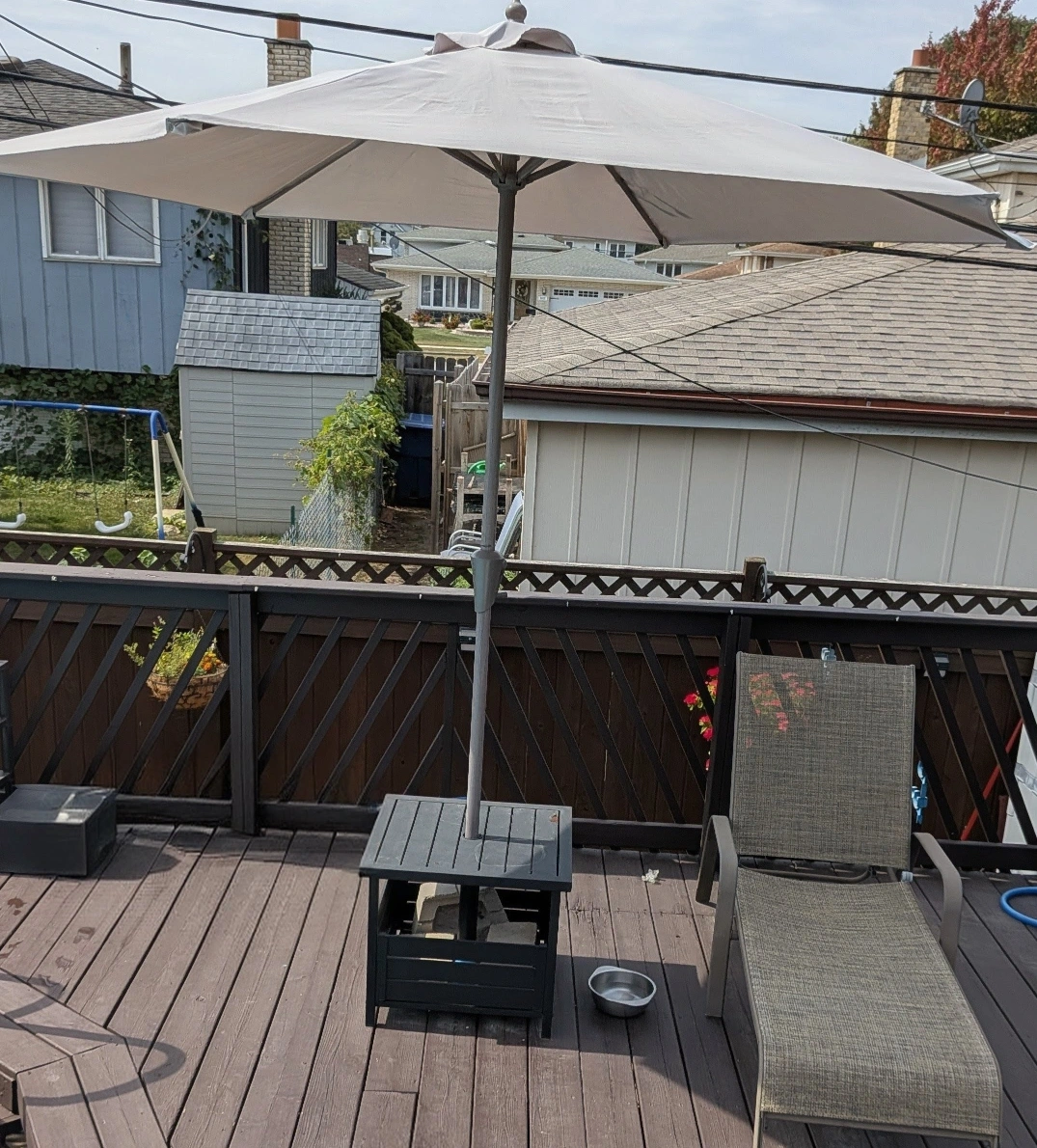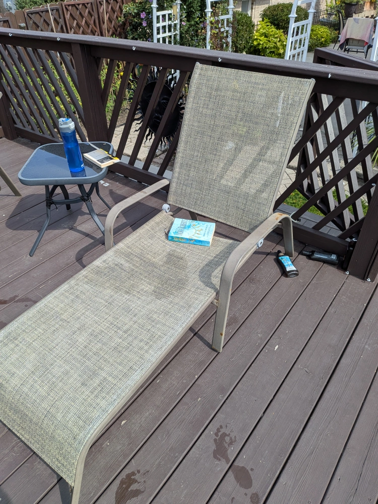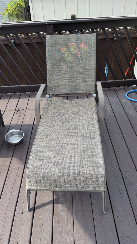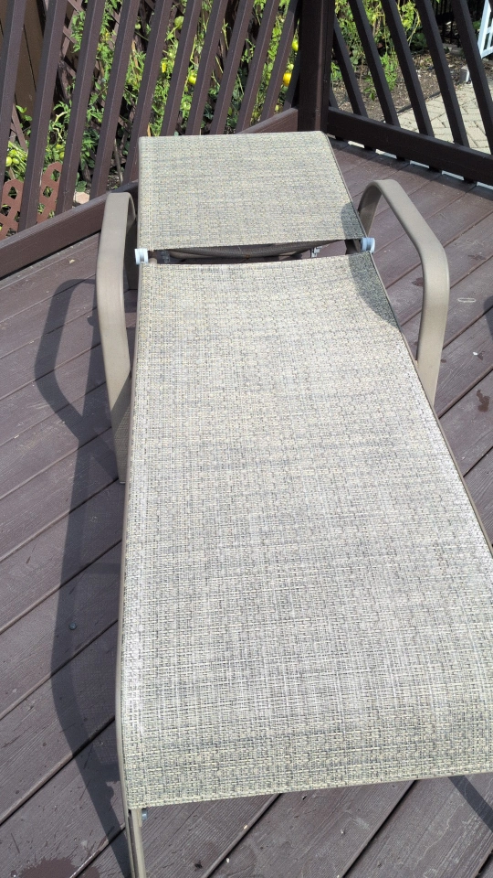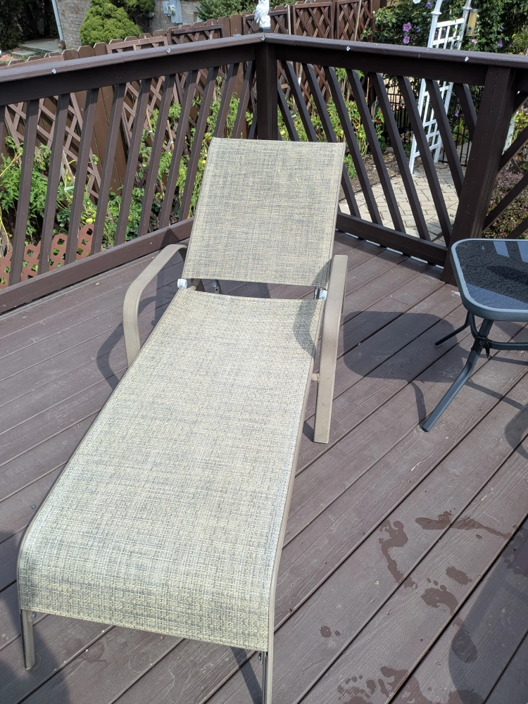 Selling 4 comfortable outdoor lounge chairs! Umbrella and base table. Perfect for relaxing on the deck or patio. It's in great condition and ready for a new home. Tan sturdy fabric and metal frames.