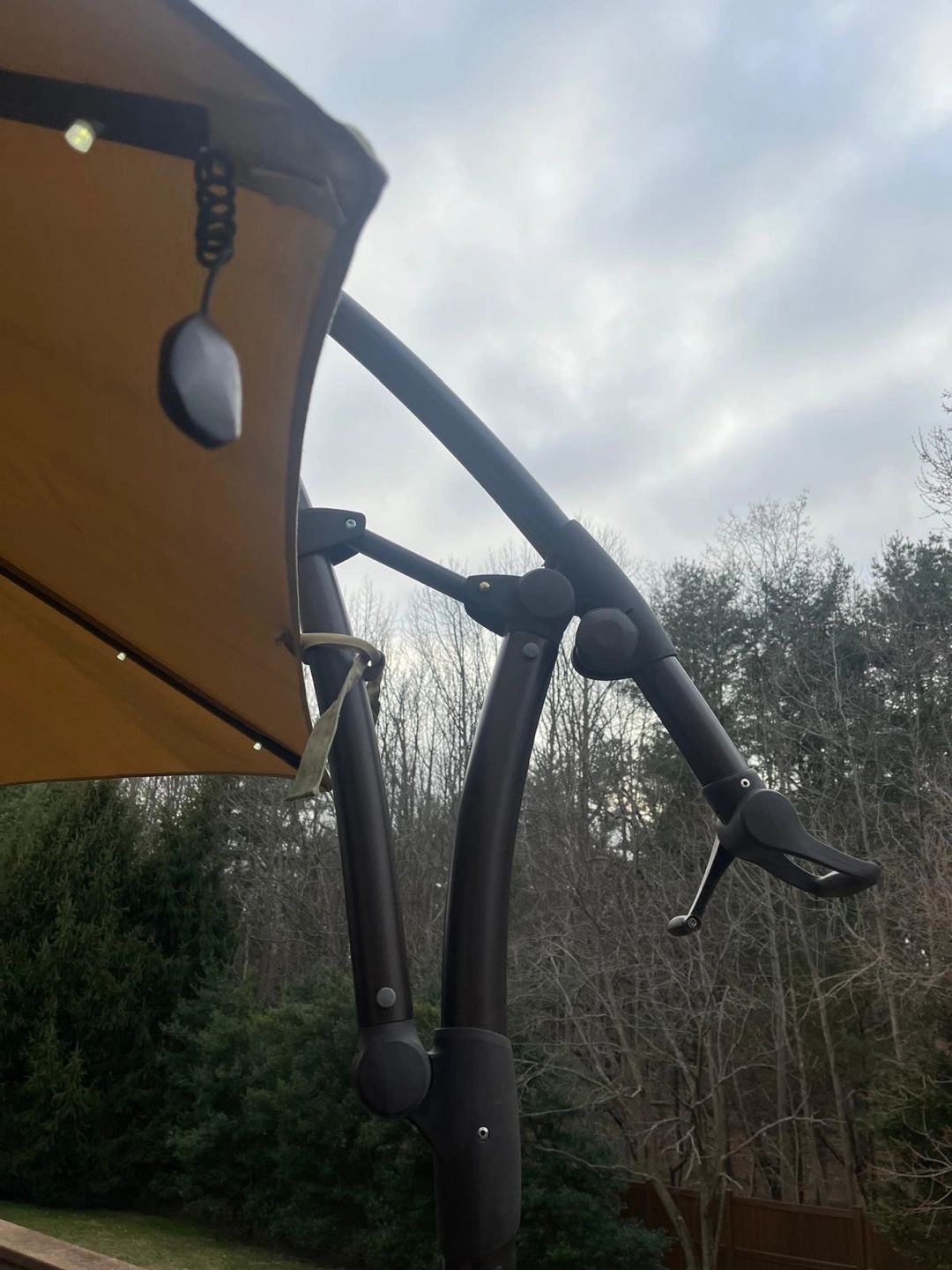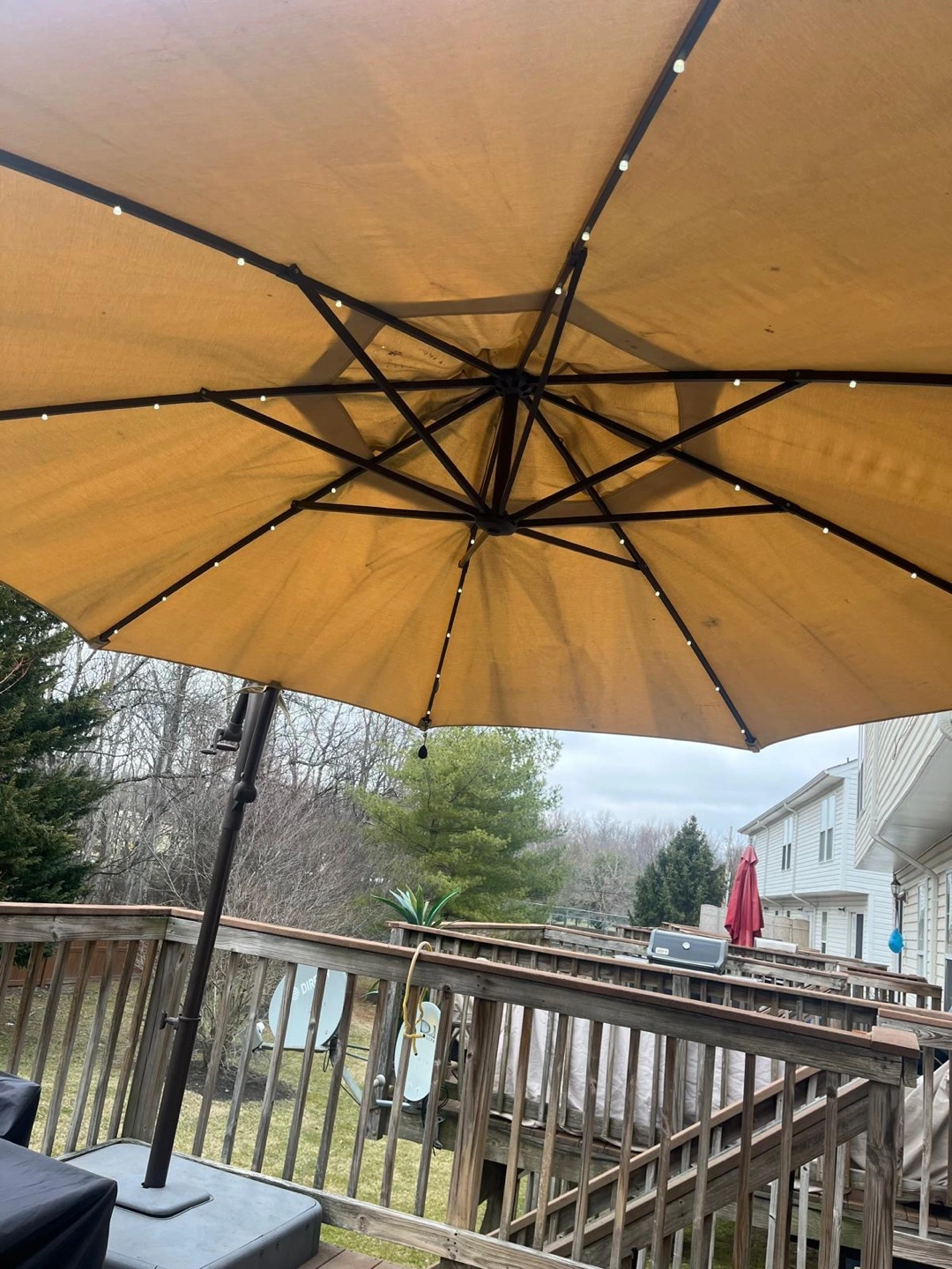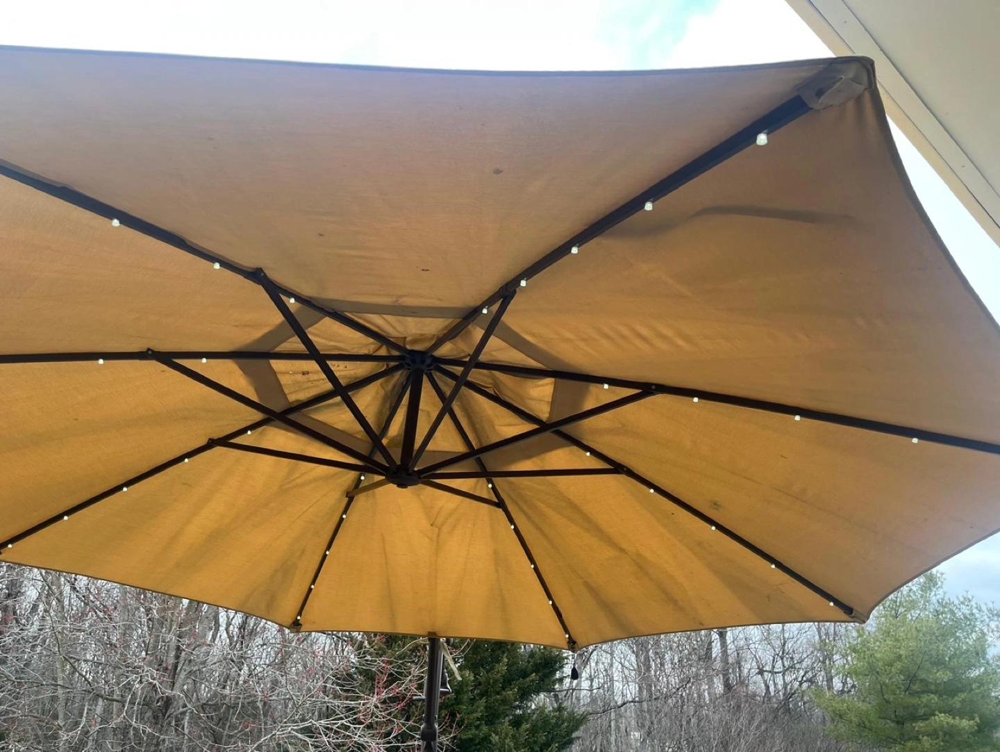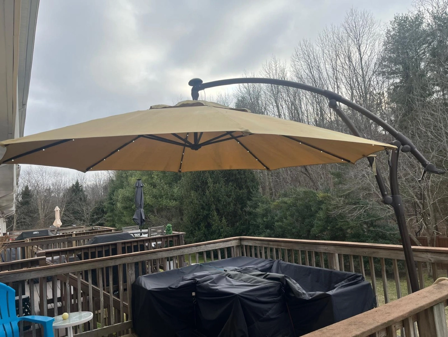 78Large beige cantilever patio umbrella. LED lights built into the canopy. Freestanding base. Great for shade and ambiance.