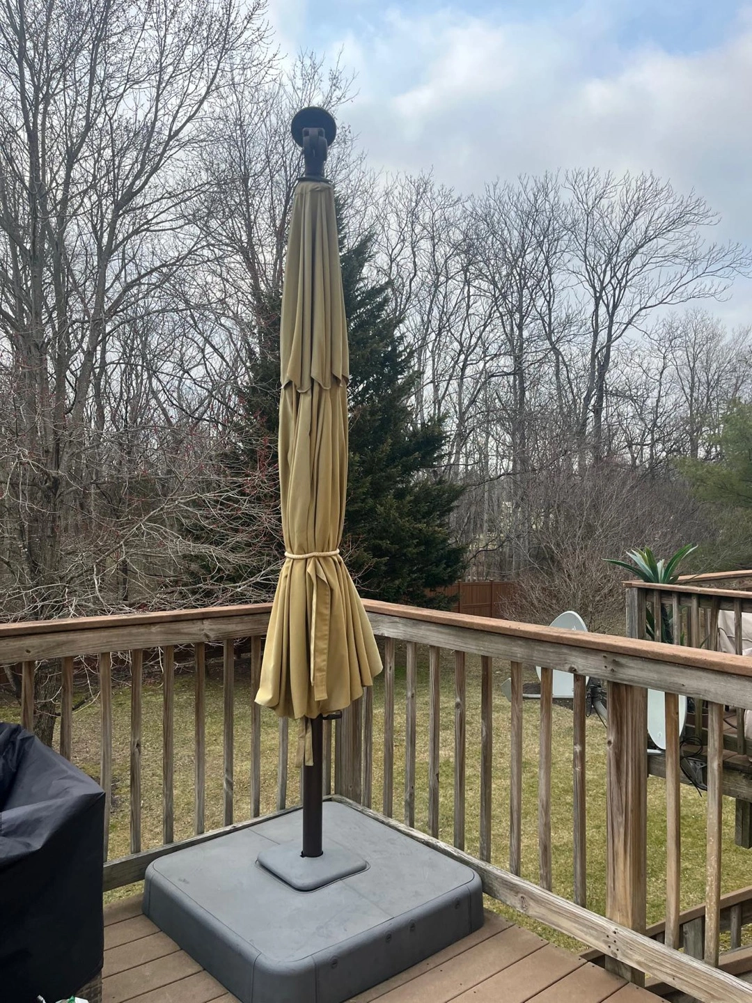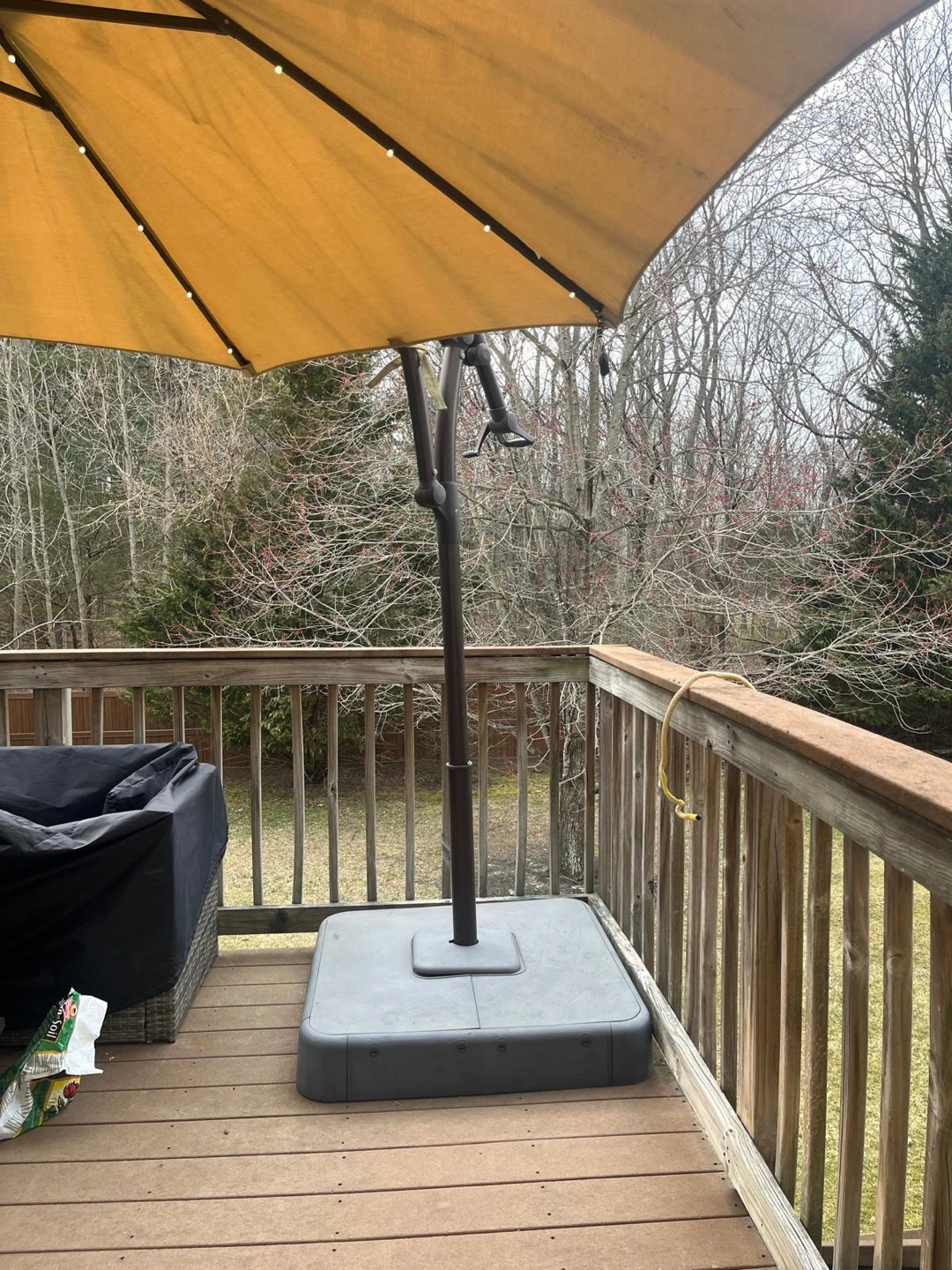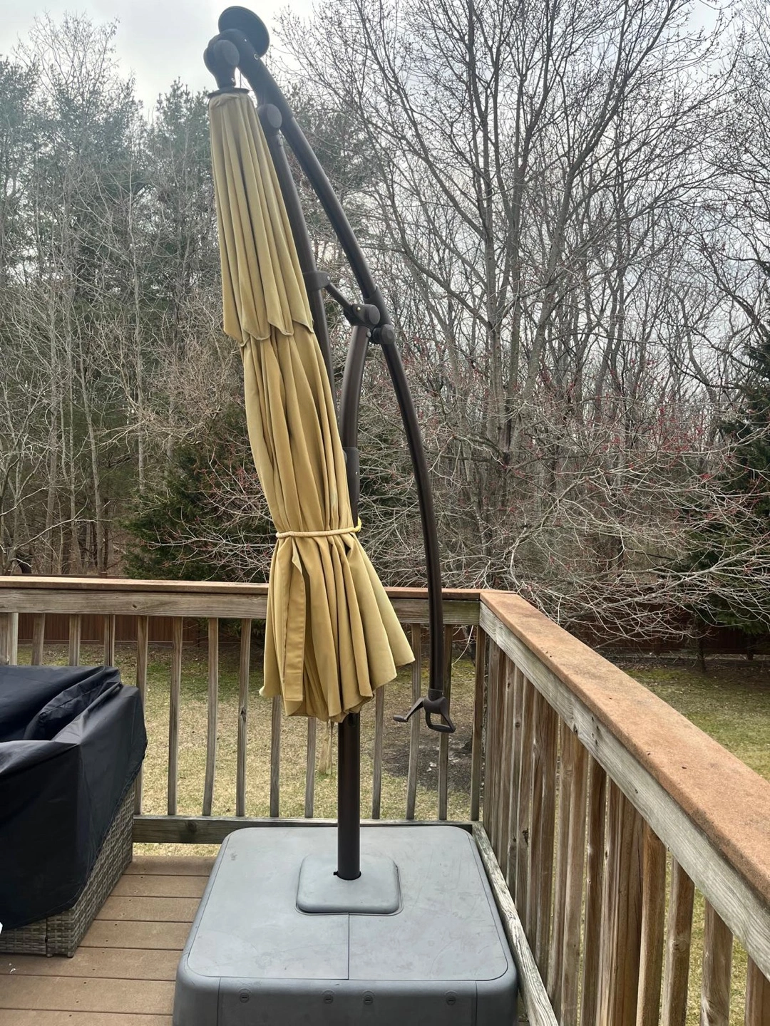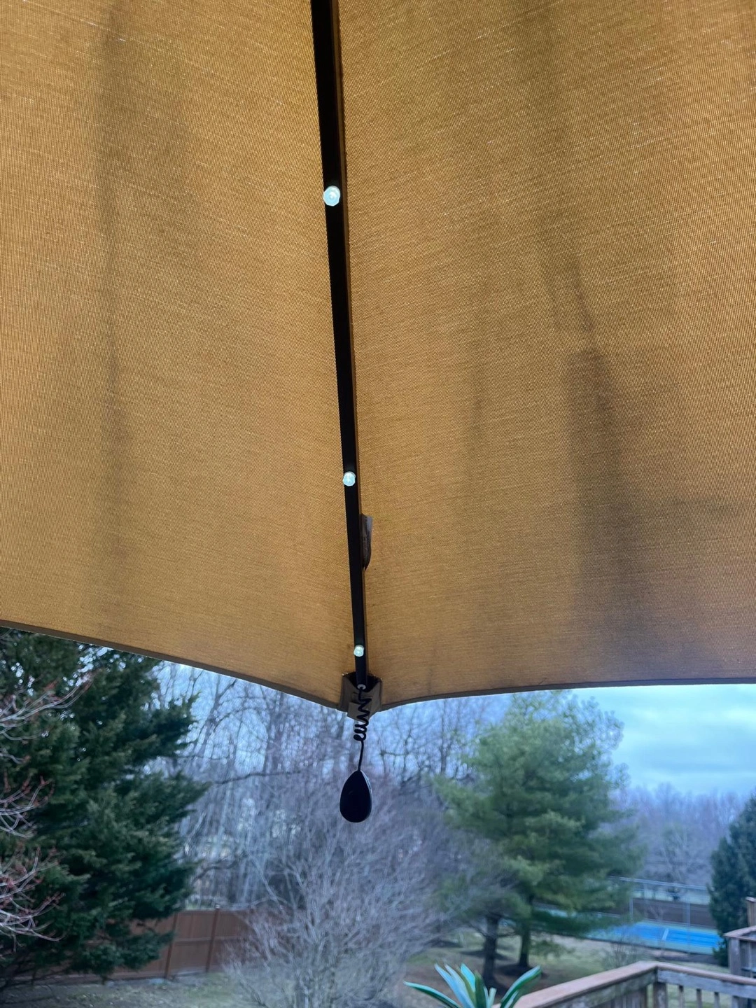78Large beige cantilever patio umbrella. LED lights built into the canopy. Freestanding base. Great for shade and ambiance.