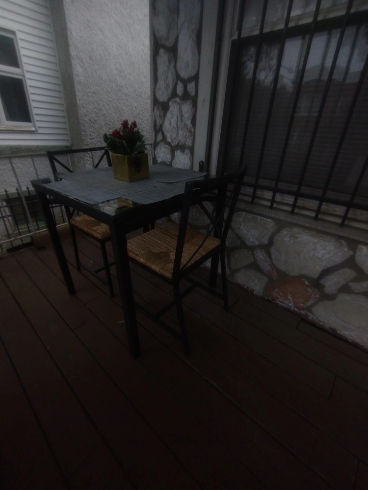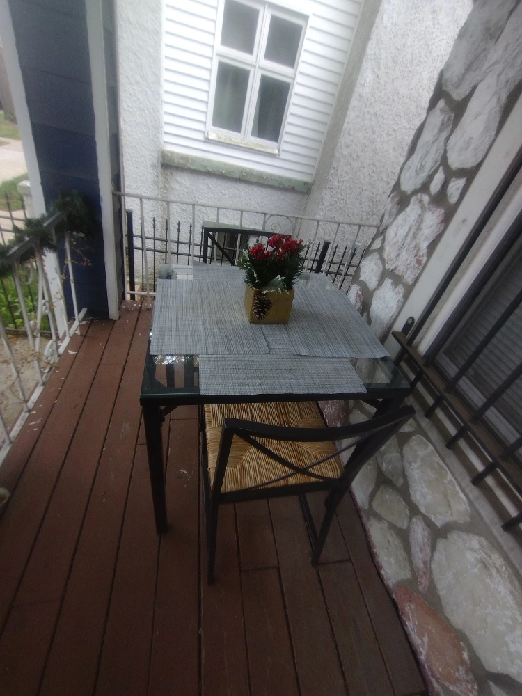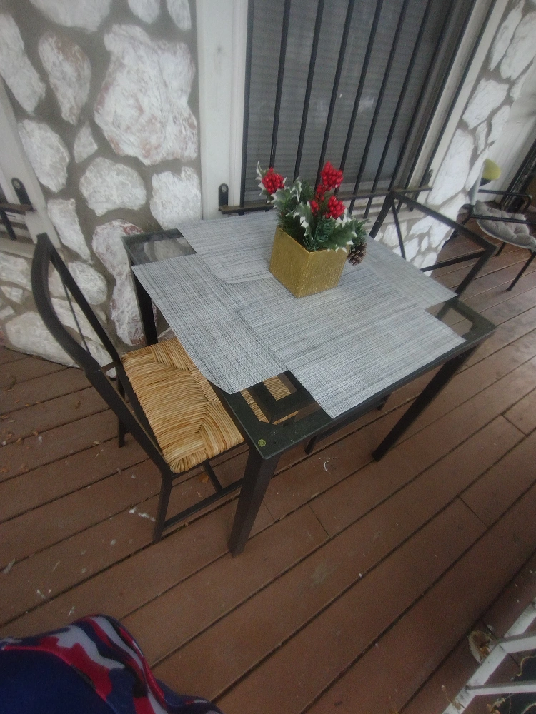Small table set. Made of metal with glass tabletop. Wicker weave chairs. You can use it to enjoy a morning coffee or a book outside.