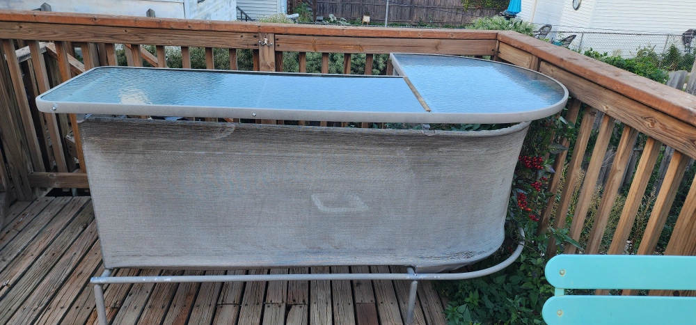 60Outdoor patio table with umbrella. It has some signs of wear but is still functional and ready for use. Perfect for enjoying the outdoors! along with patio bar, no chairs included. willing to separate each item.