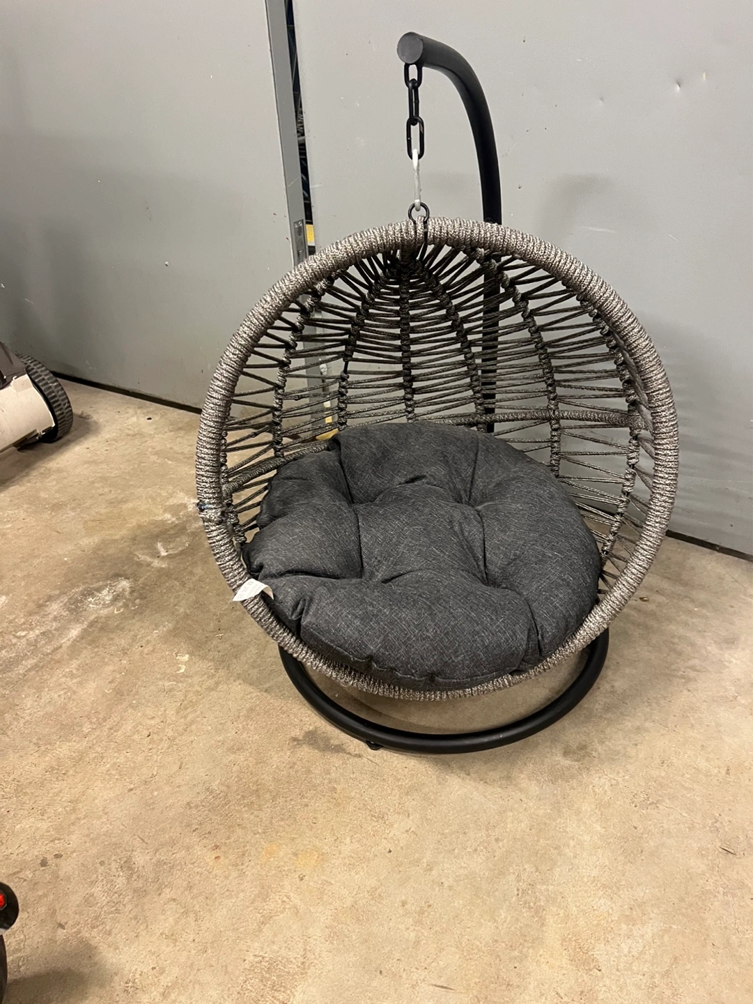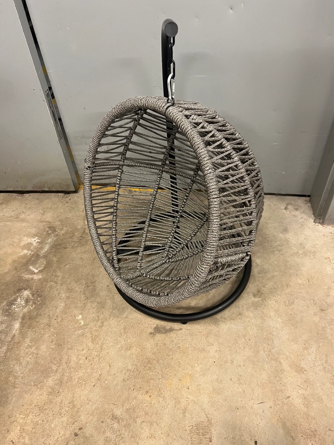 Grey wicker hanging chair, includes a dark grey cushion. Metal stand. Perfect for cats or small dogs. Must pick up