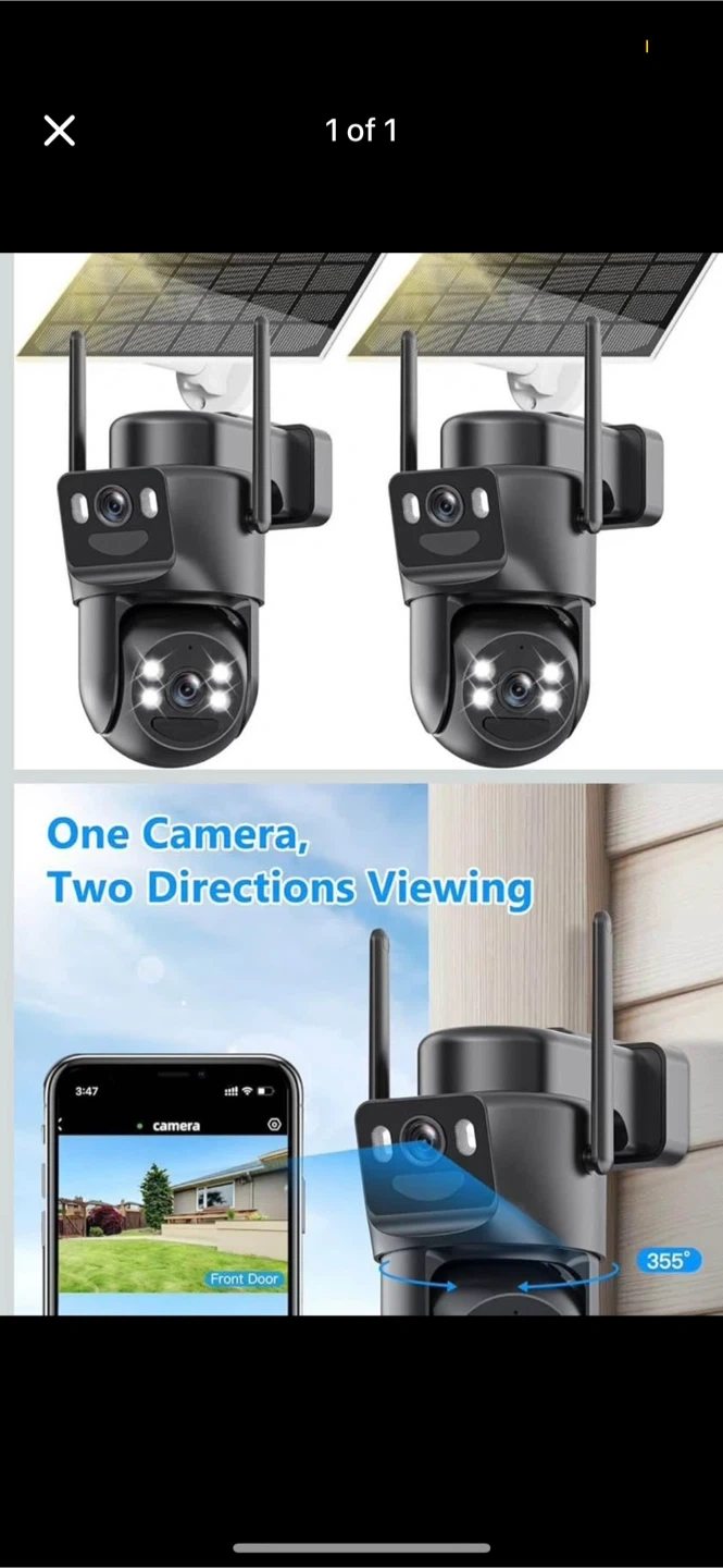36This is an outdoor security camera that's solar powered! It has two directions of viewing and can rotate 355 degrees