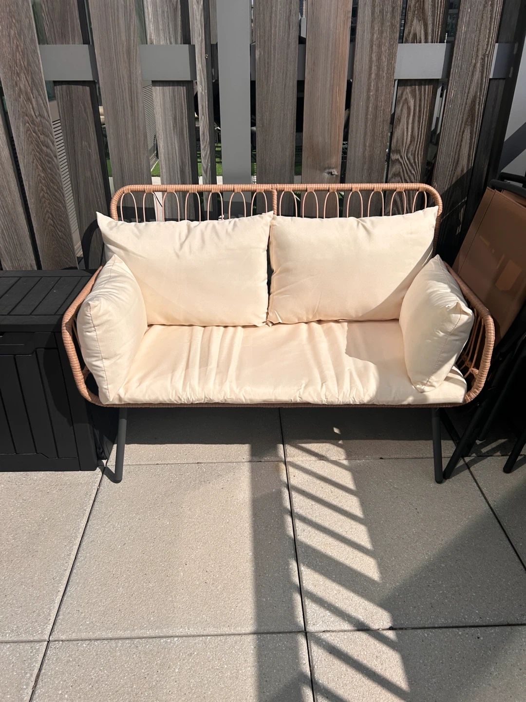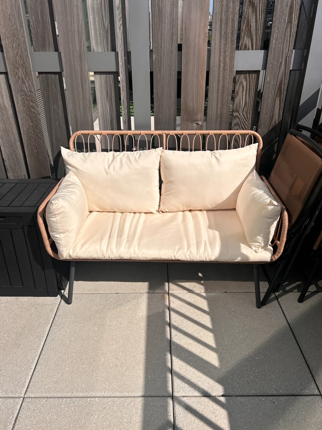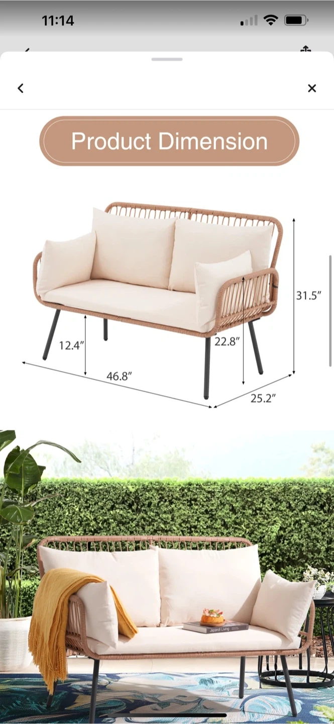 Here’s an outdoor wicker loveseat sofa, perfect for your patio or garden! It measures approximately 46.8" wide, 25.2" deep, and 31.5" tall. The cushions are a comfy cream color, ready for relaxing outdoors