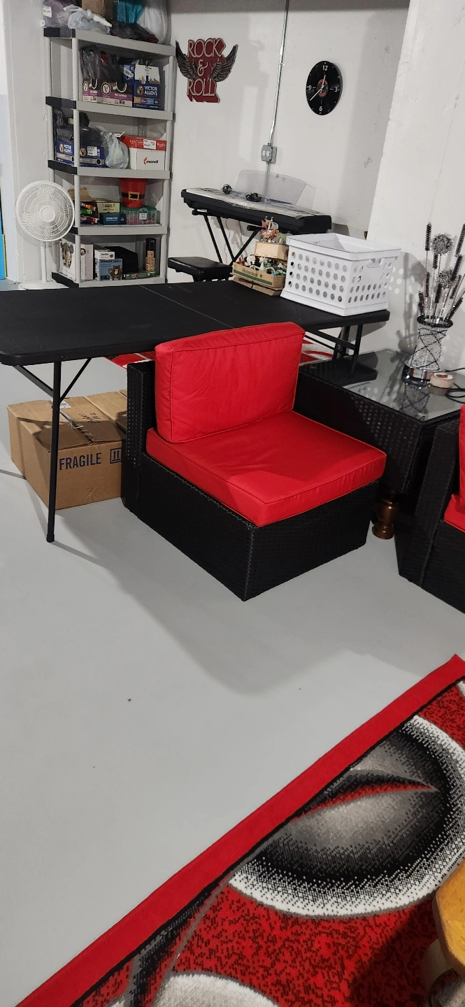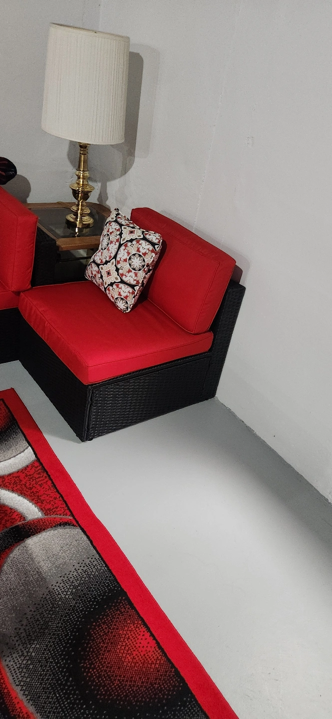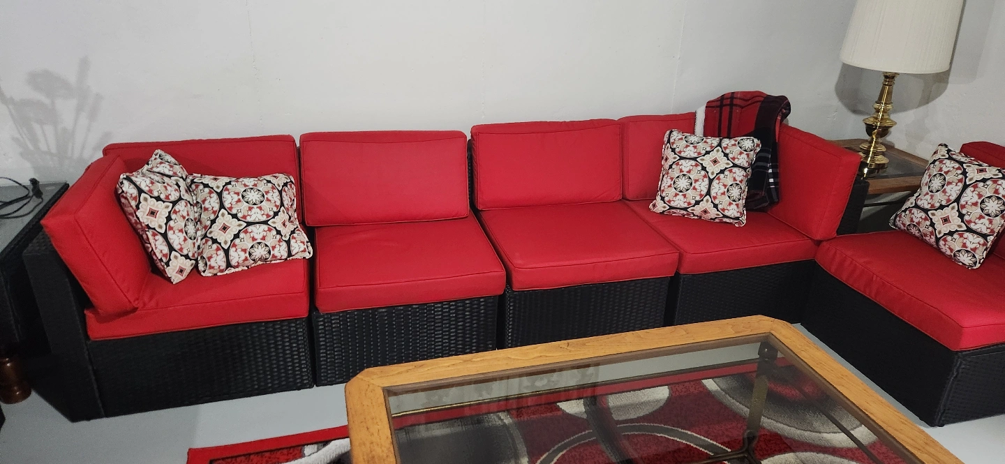 5Black wicker patio furniture set. Includes sectional sofa and square glass-top coffee table. Red cushions included. Perfect for small spaces. lightweight