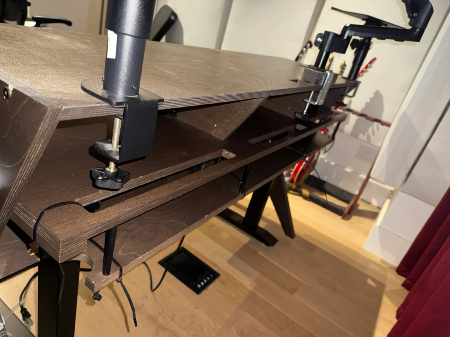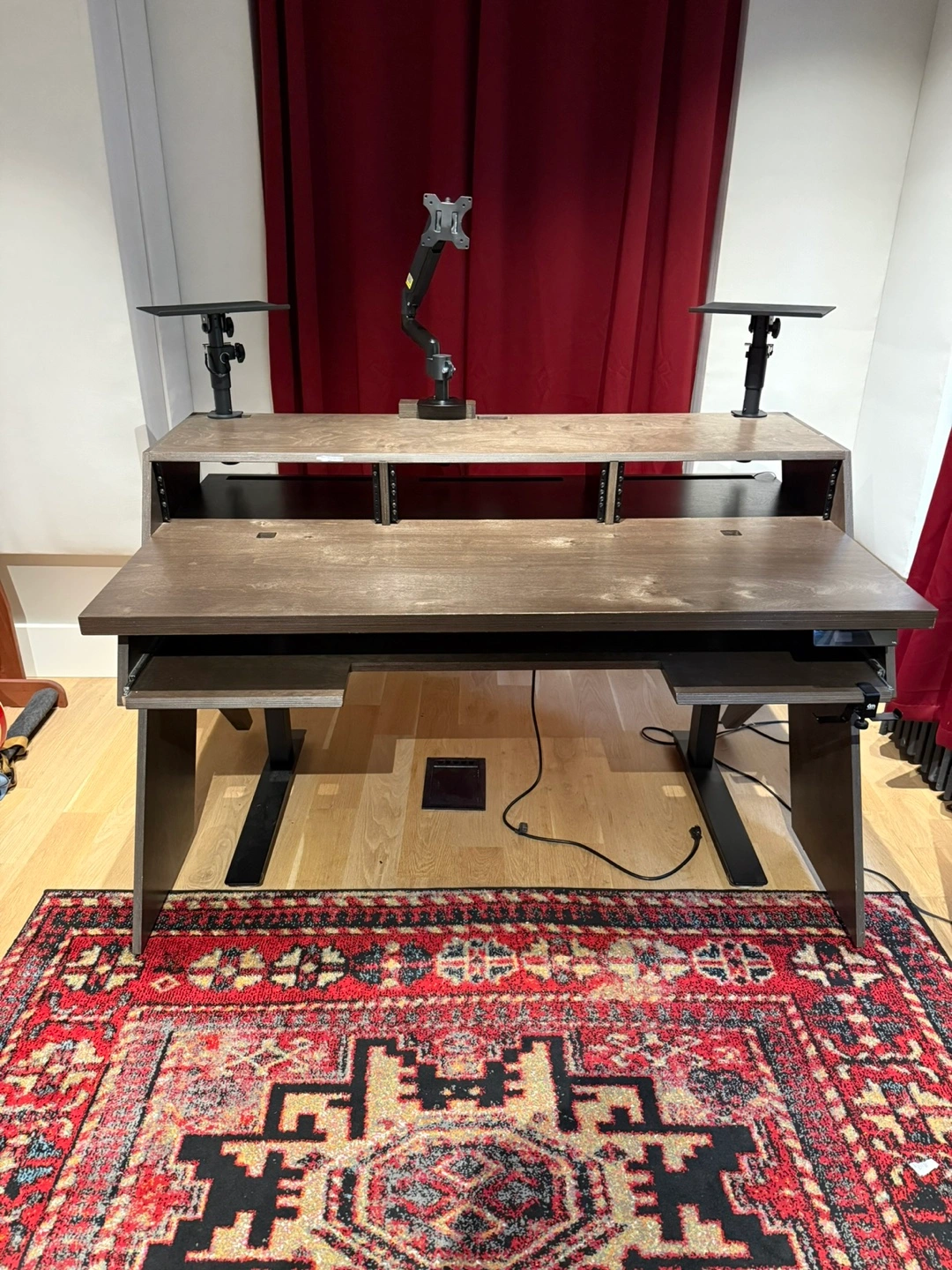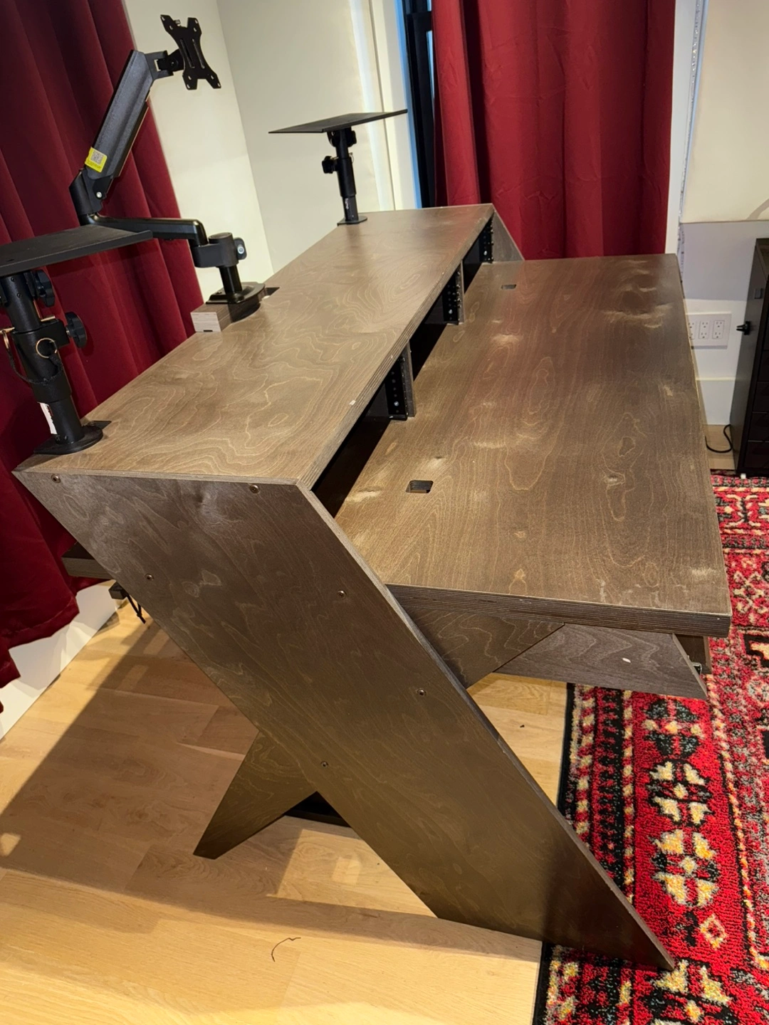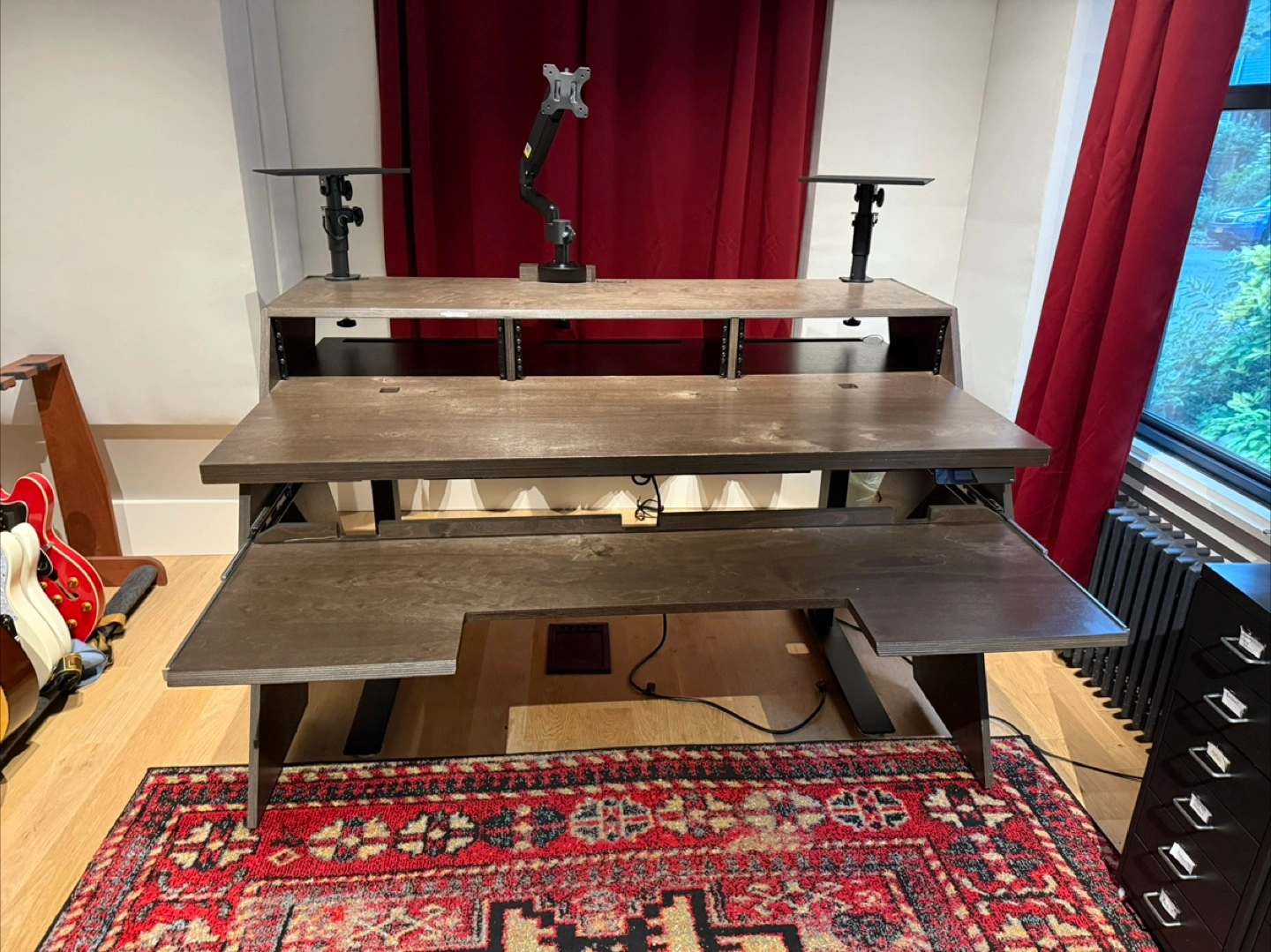 Selling an output platform studio desk in great condition. Perfect for music production or any workspace needing organized levels. I paid $1000 for this desk, but it’s time for me to graduate. The lower price is because I modified it to adapted to a standing desk with a motor, the motor is staying. The cuts that I made do not cripple the functionality of the desk at all. This has been an incredible asset, as I’ve worked at least 50% of the time standing, which has saved my back from multiple aches and pains. You can buy the standing desk motor and do it! Can’t recommend it enough.