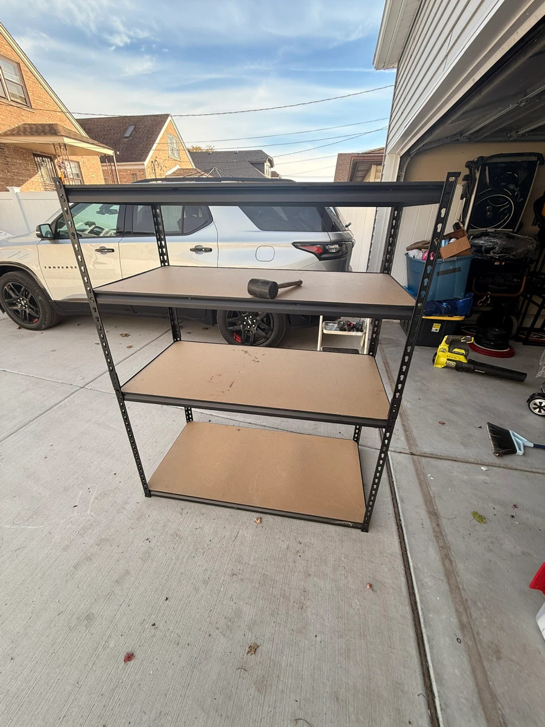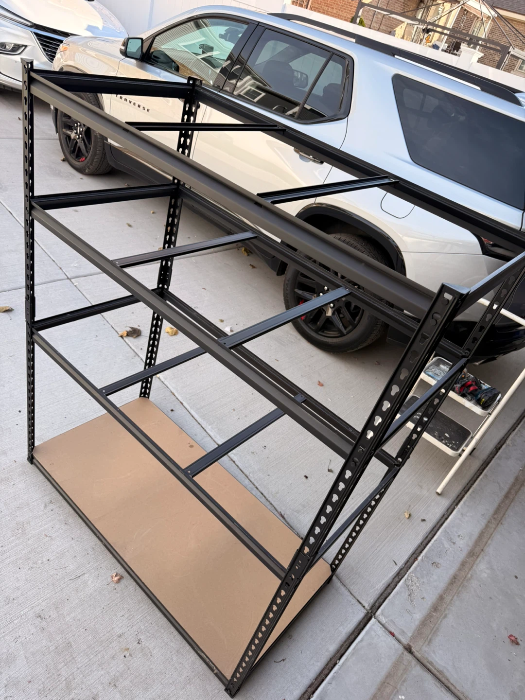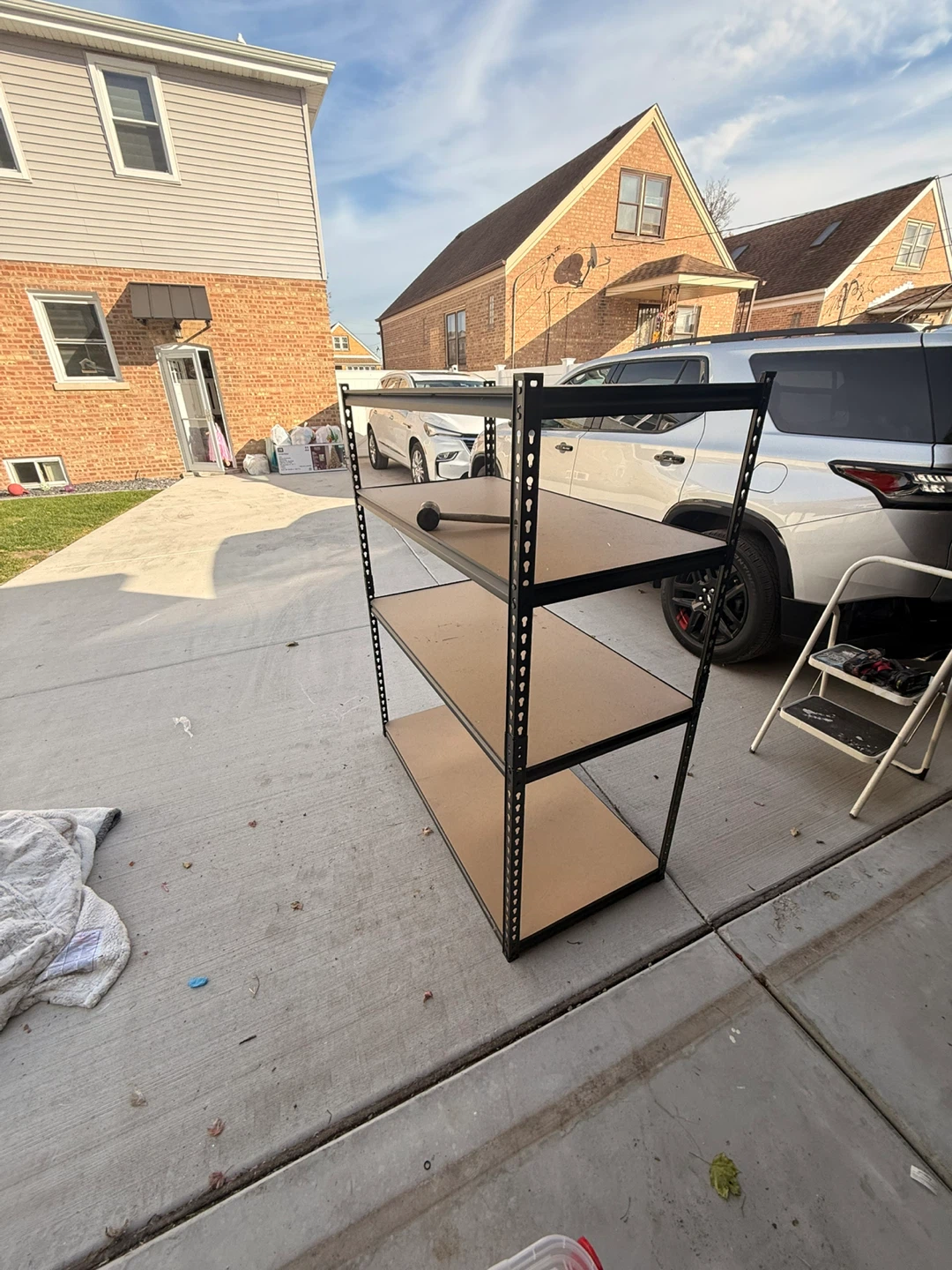 a sturdy black metal shelving unit. It has four shelves and is perfect for garage, basement, or storage room organization. It's in good condition and ready to help you get organized!