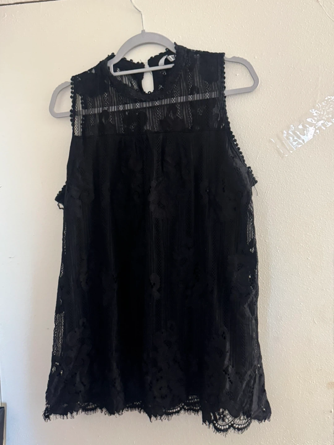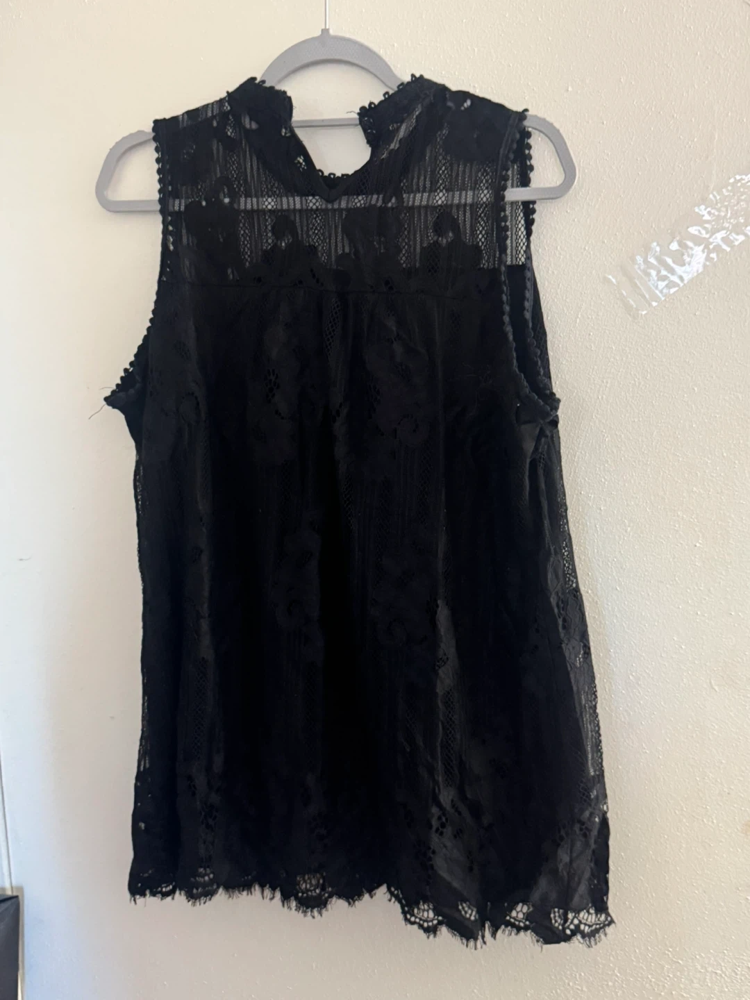 Sheer black lace sleeveless top with a mock neck. Features a delicate scalloped hem and trim details. A stylish addition to any wardrobe!
