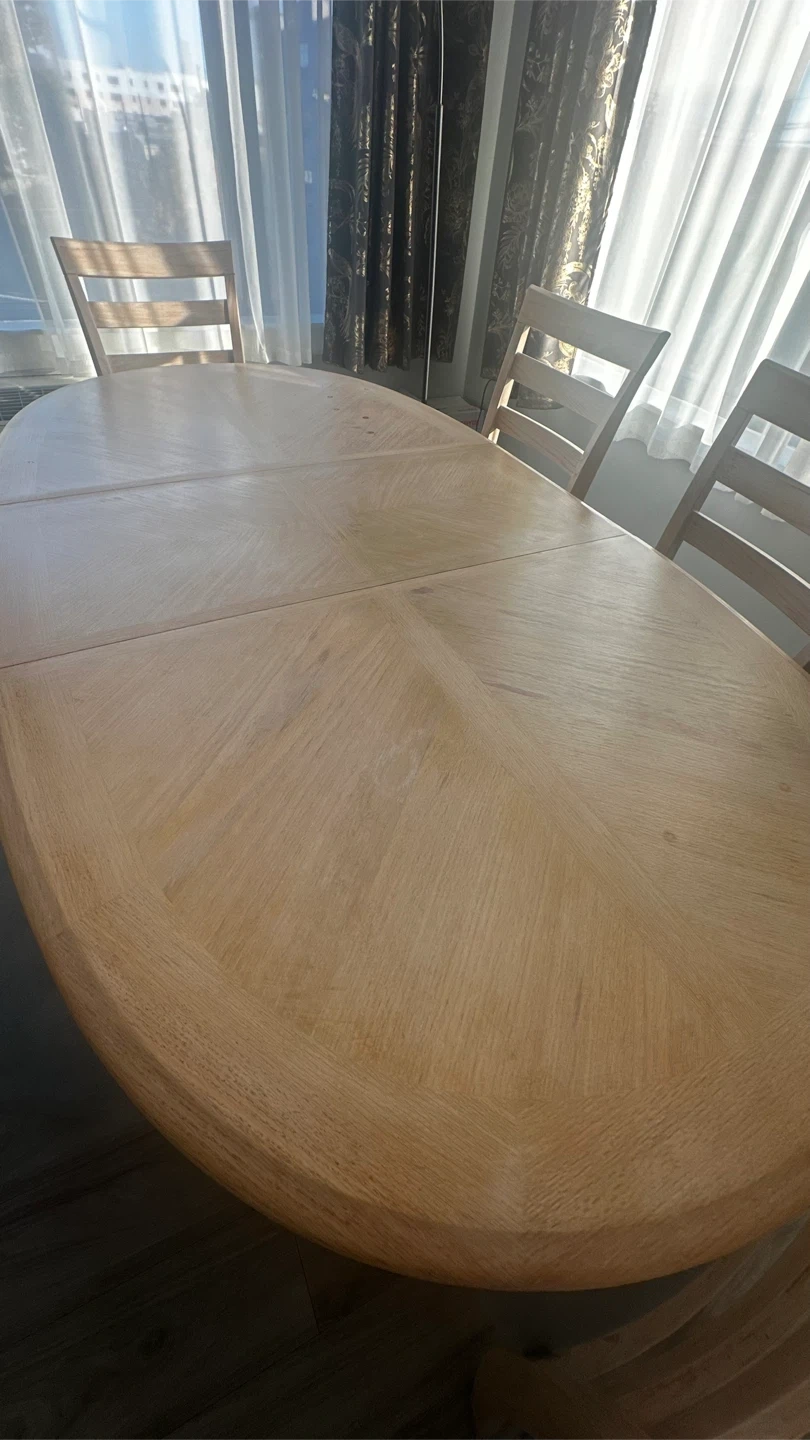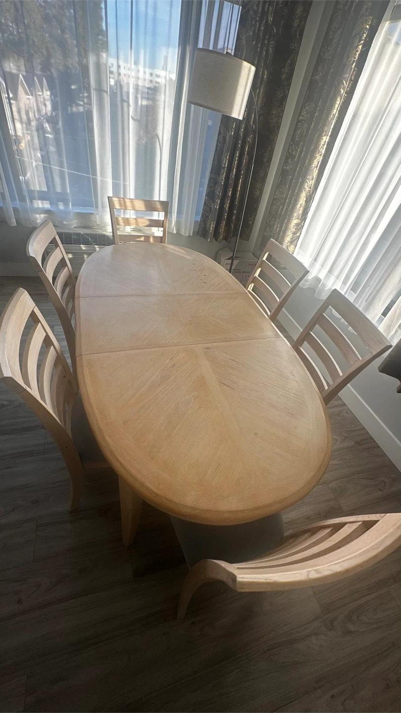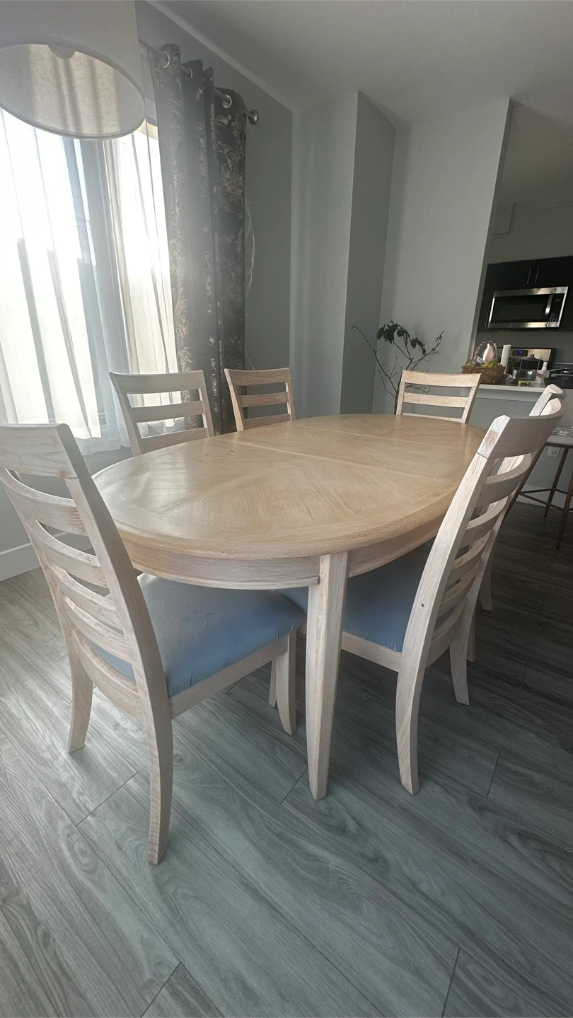 Selling a lovely oval extendable dining table with six matching chairs. The set is in very good condition — perfect for family dinners or gatherings. The chairs feature comfortable, light blue padded seats, and the set is made of light-colored wood. The table extends easily to accommodate more guests, making it ideal for any occasion. We recently restored the set a few months ago, updating both the color and the fabric. We’re selling it only because of an upcoming move. Includes extra fabric and materials used for the restoration. The table has a few small marks from a sewing machine, but they don’t affect its overall appearance or function.