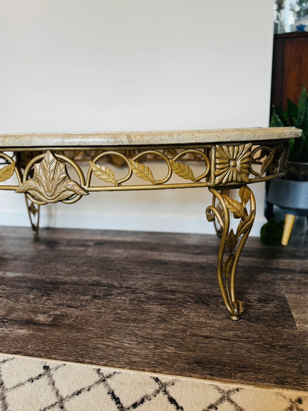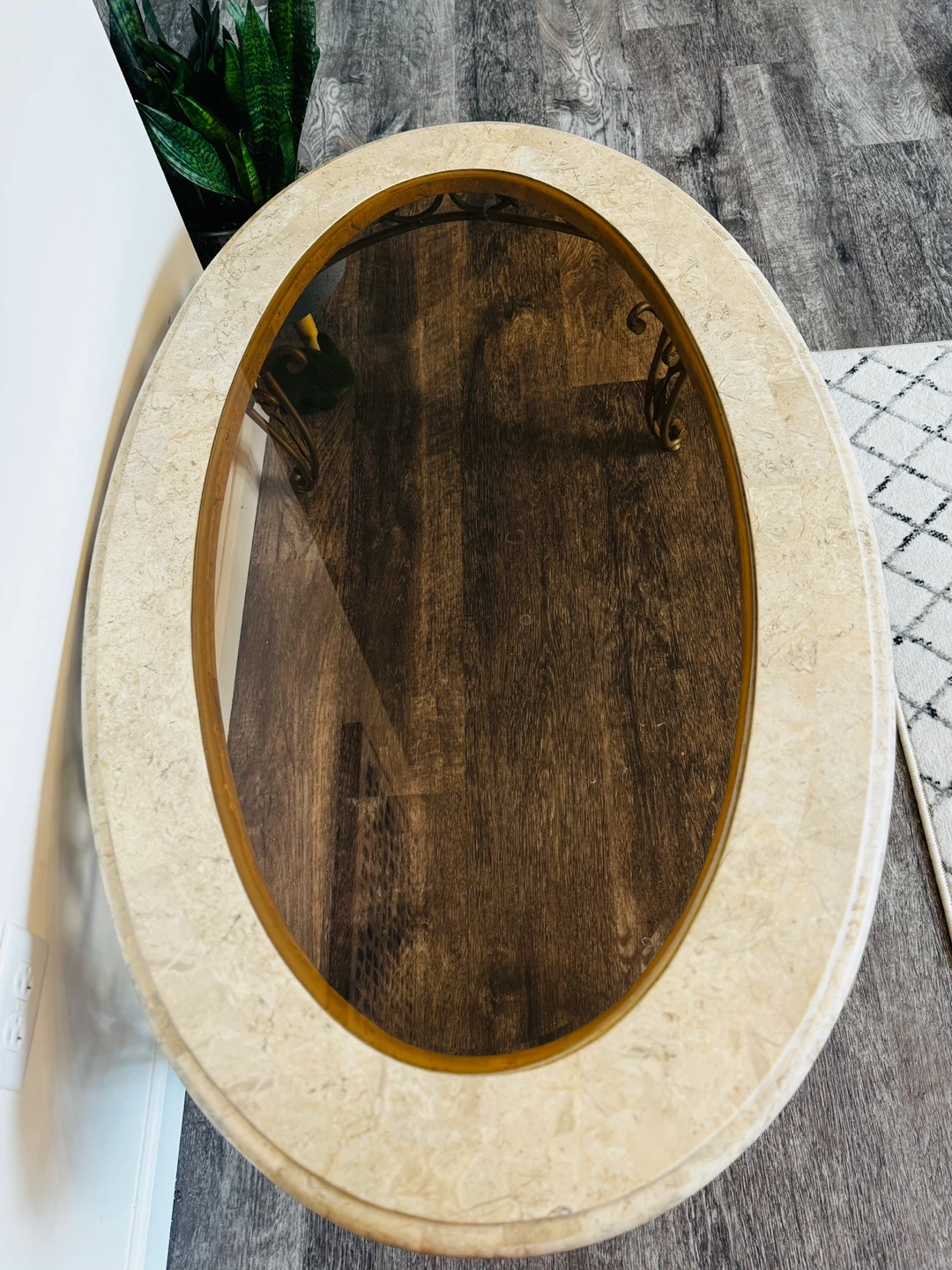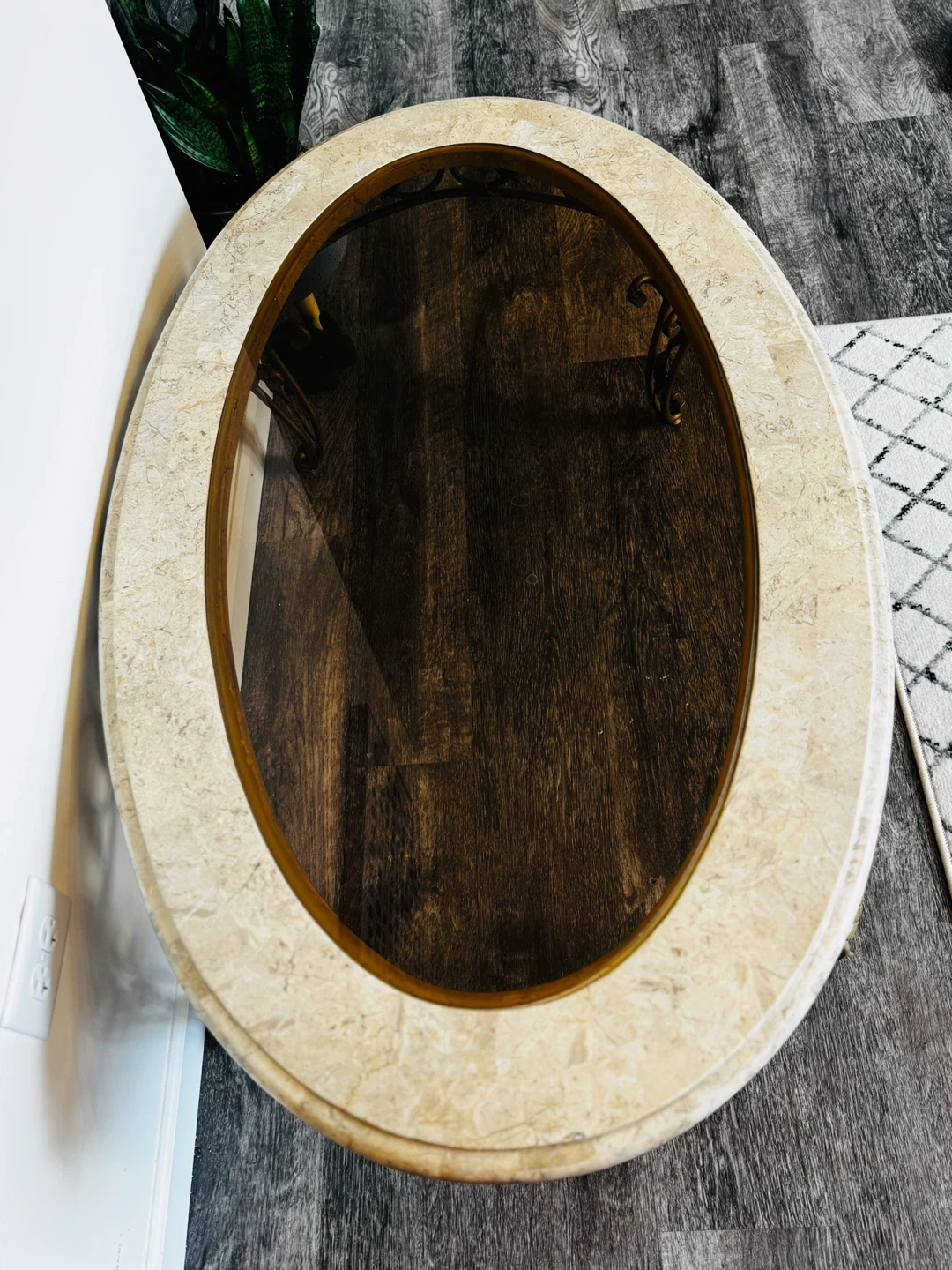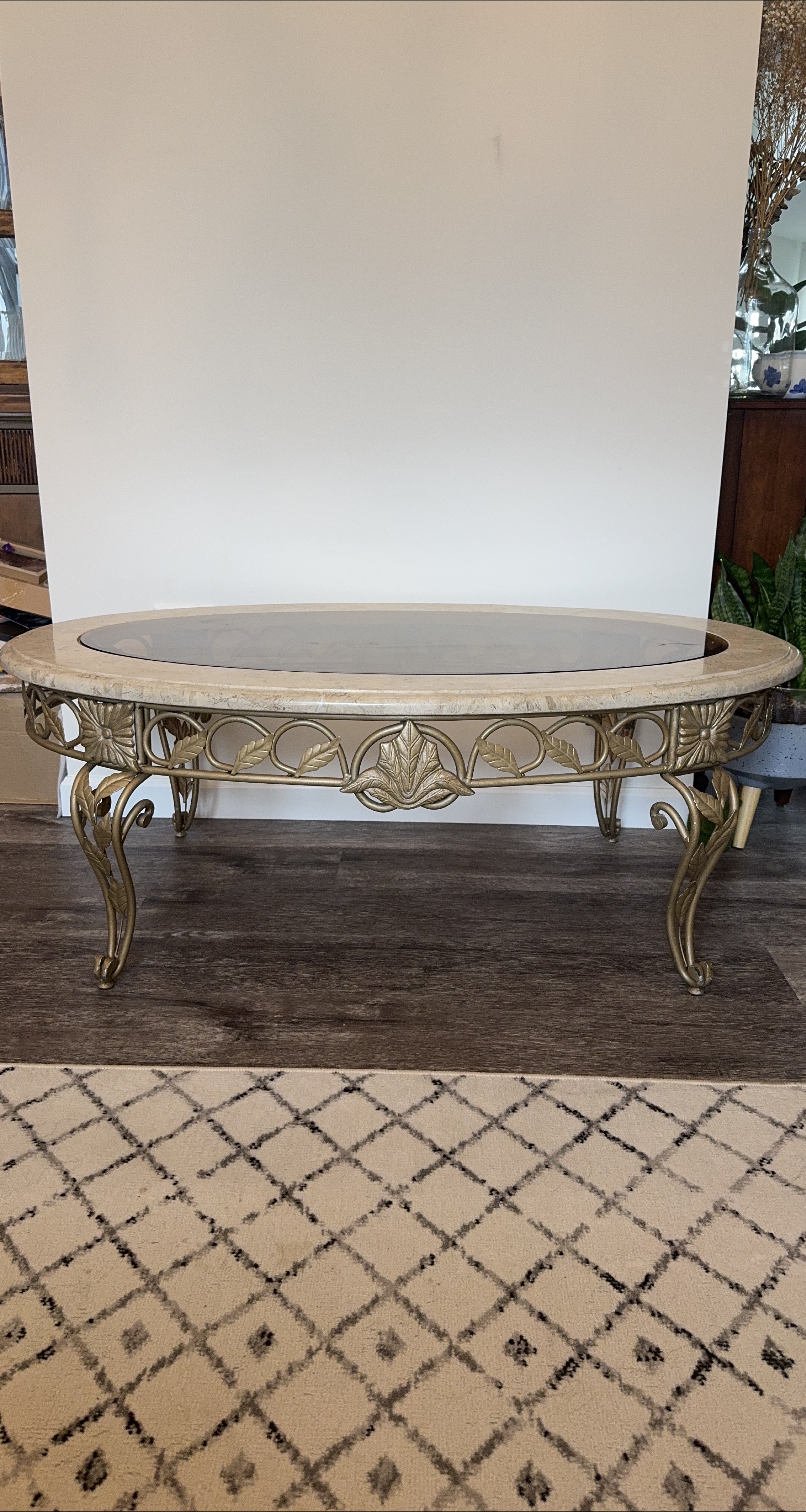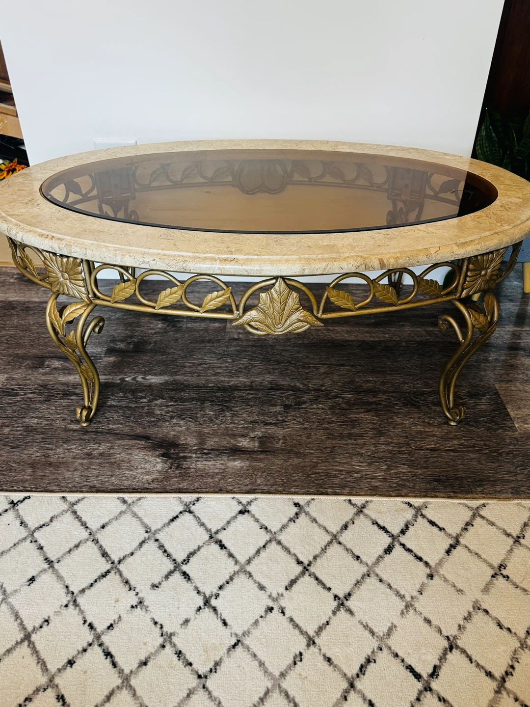 This is a beautiful oval coffee table with a marble-look top and a glass insert. It features decorative gold-toned metal legs. It's a stylish piece that would look great in any living room! It’s real marble so it’s heavy…