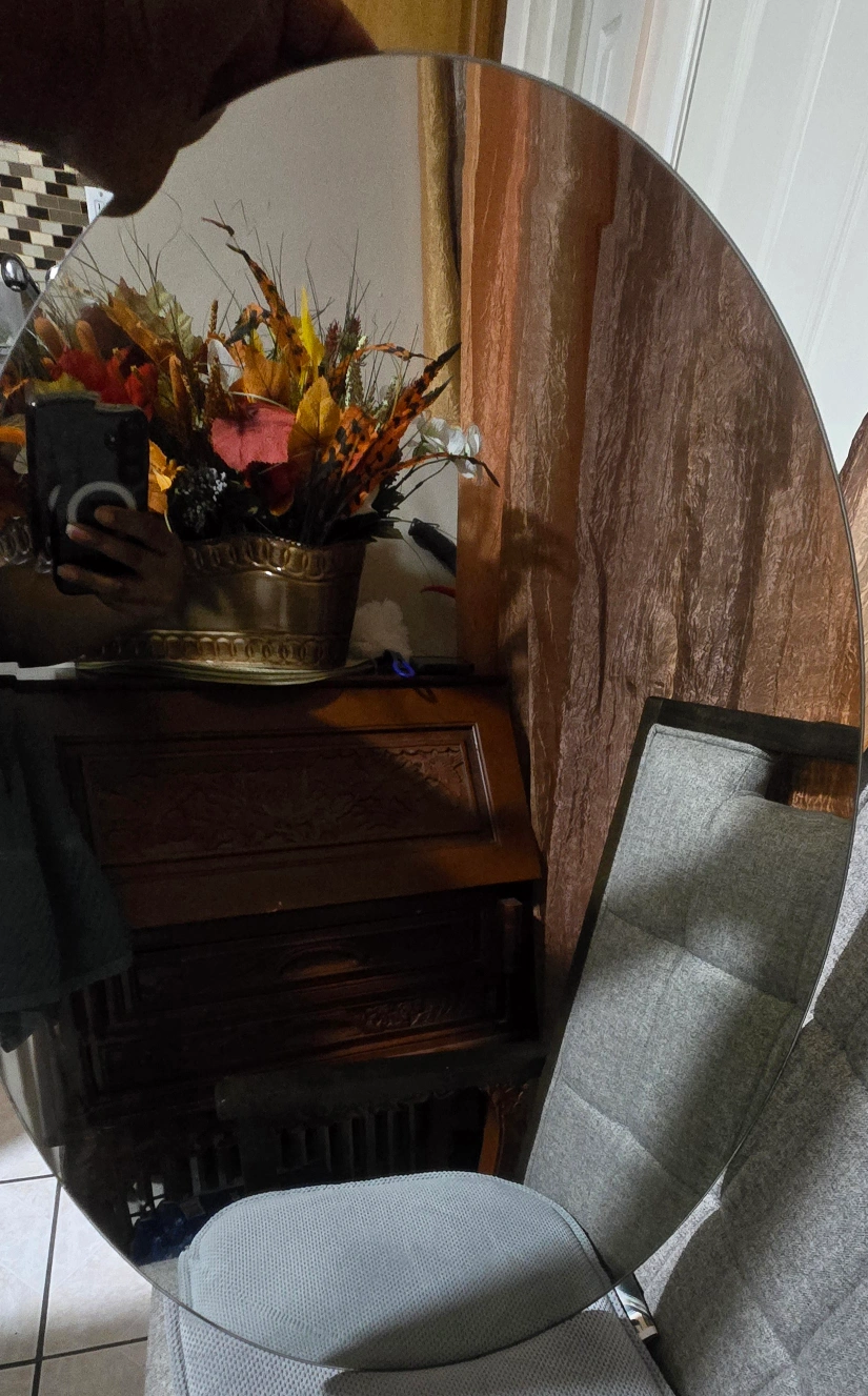 10Selling an oval silver mirror. It appears to be in good condition and ready to add a touch of elegance to your space.