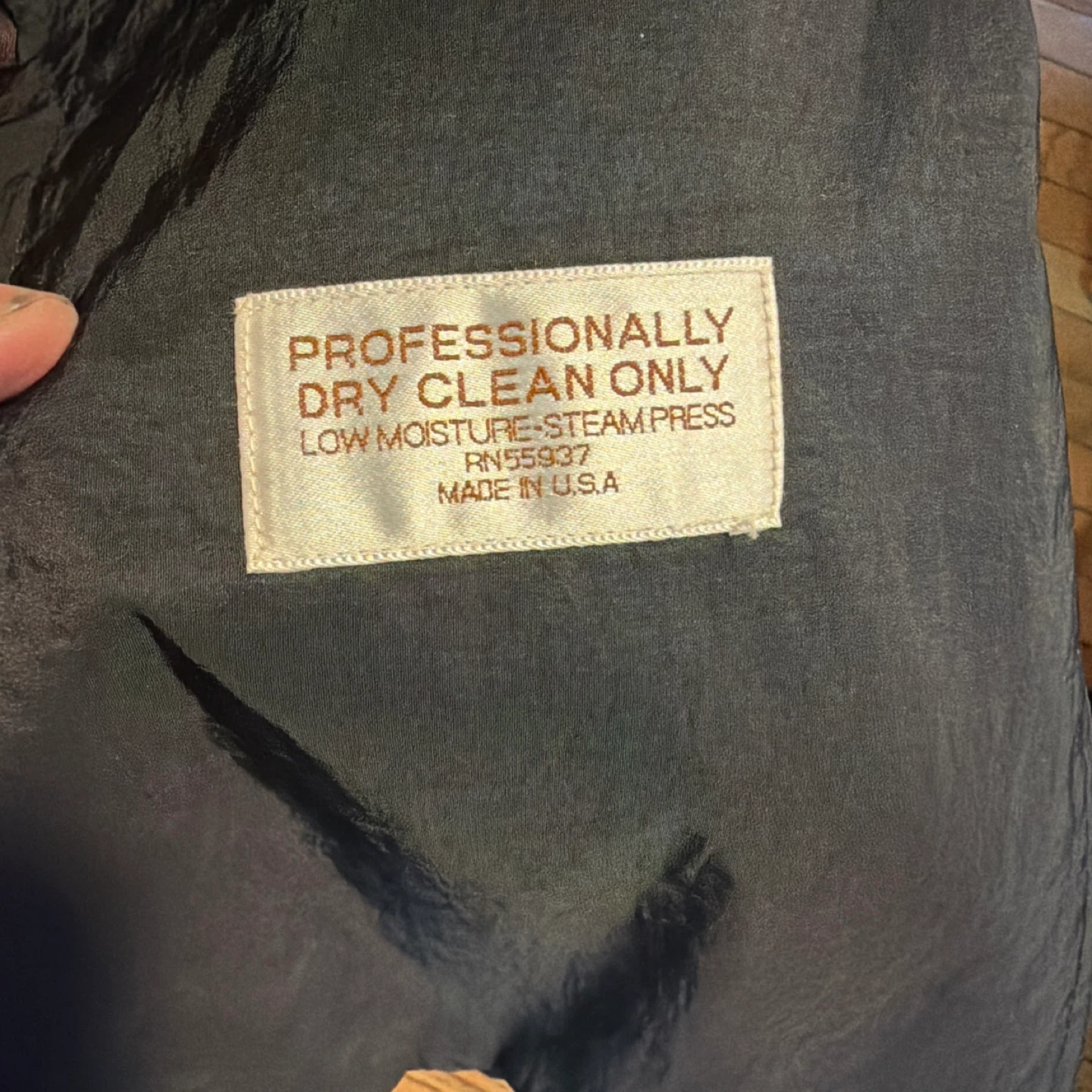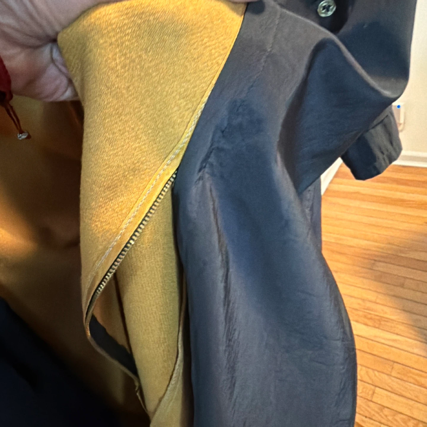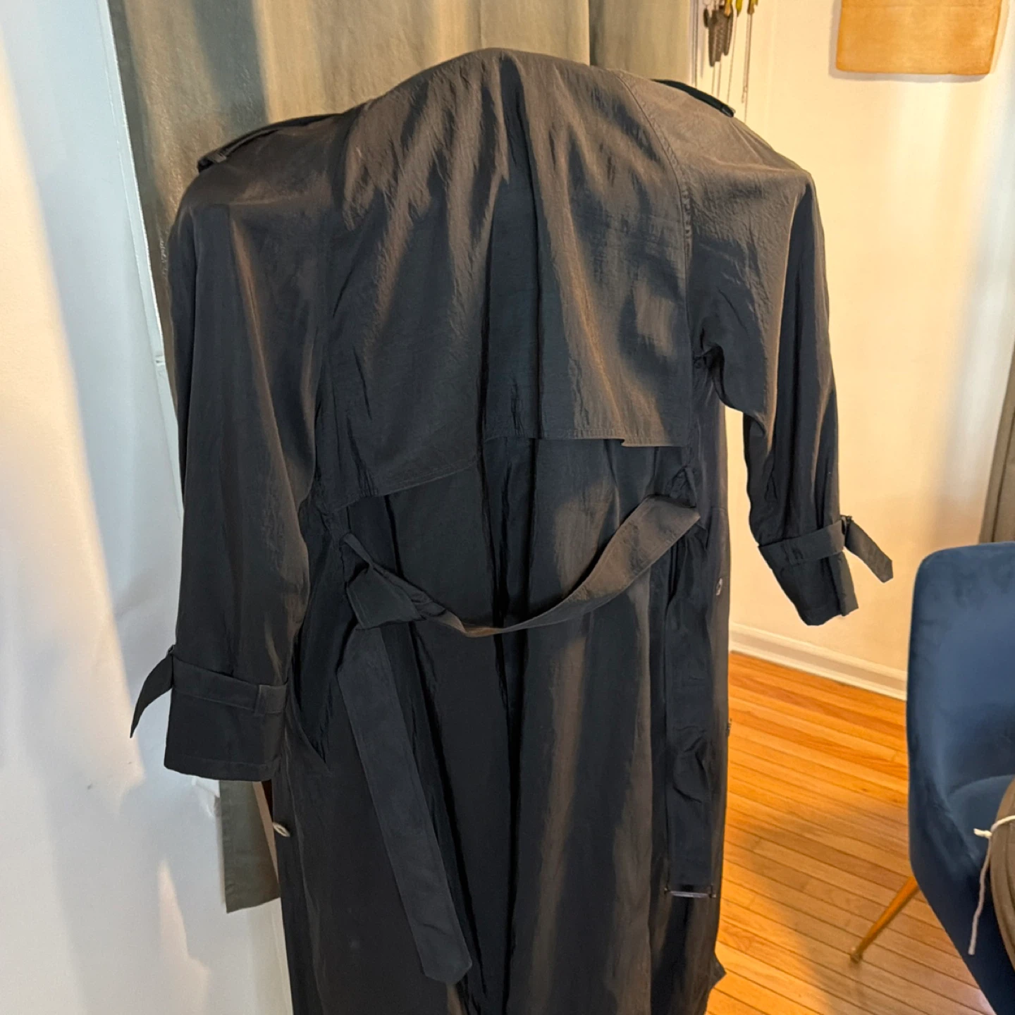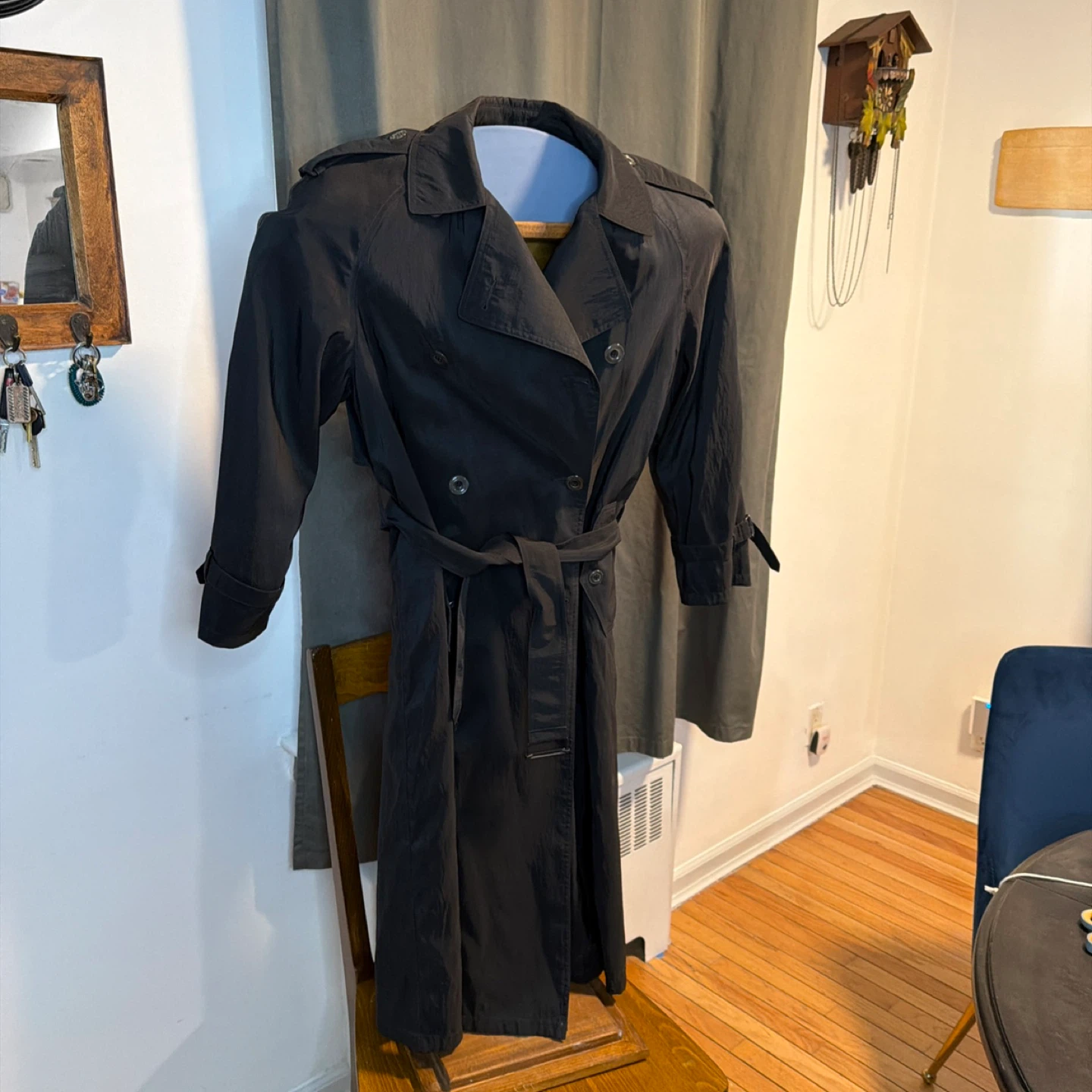 This is a black trench coat from Jones New York. It features a contrasting bright yellow lining. Professionally dry clean only, made in the USA. Double-breasted with a belt closure.