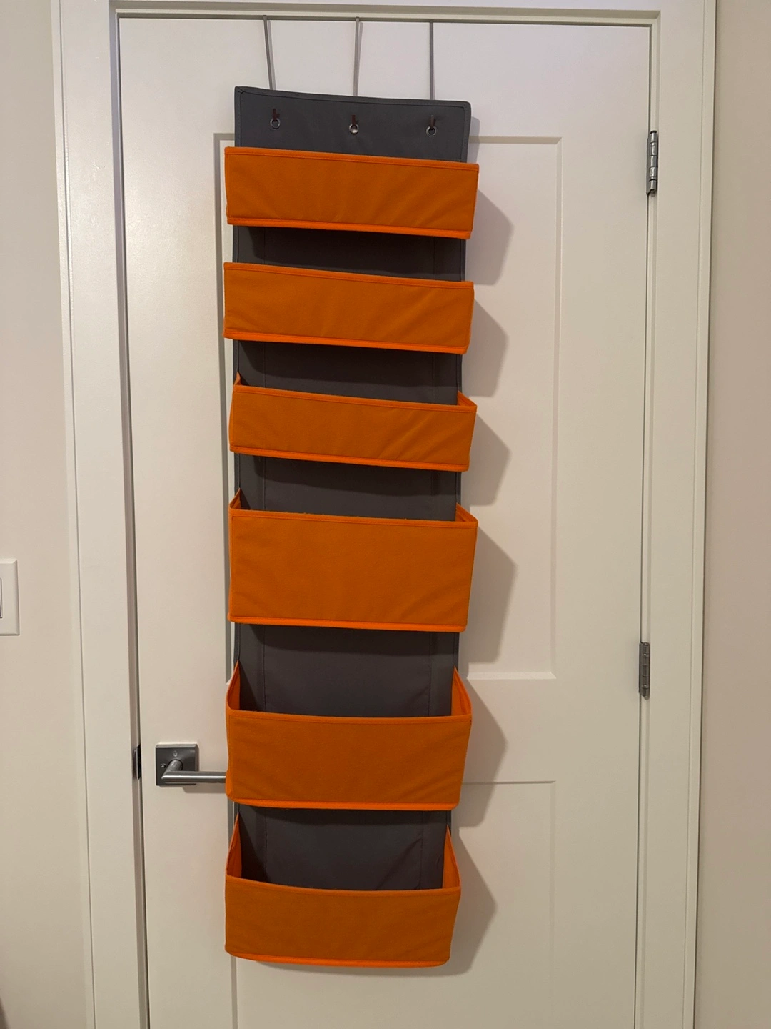 This is a gray and orange over-the-door hanging organizer. It has 7 pockets for storage, perfect for keeping things tidy and out of the way