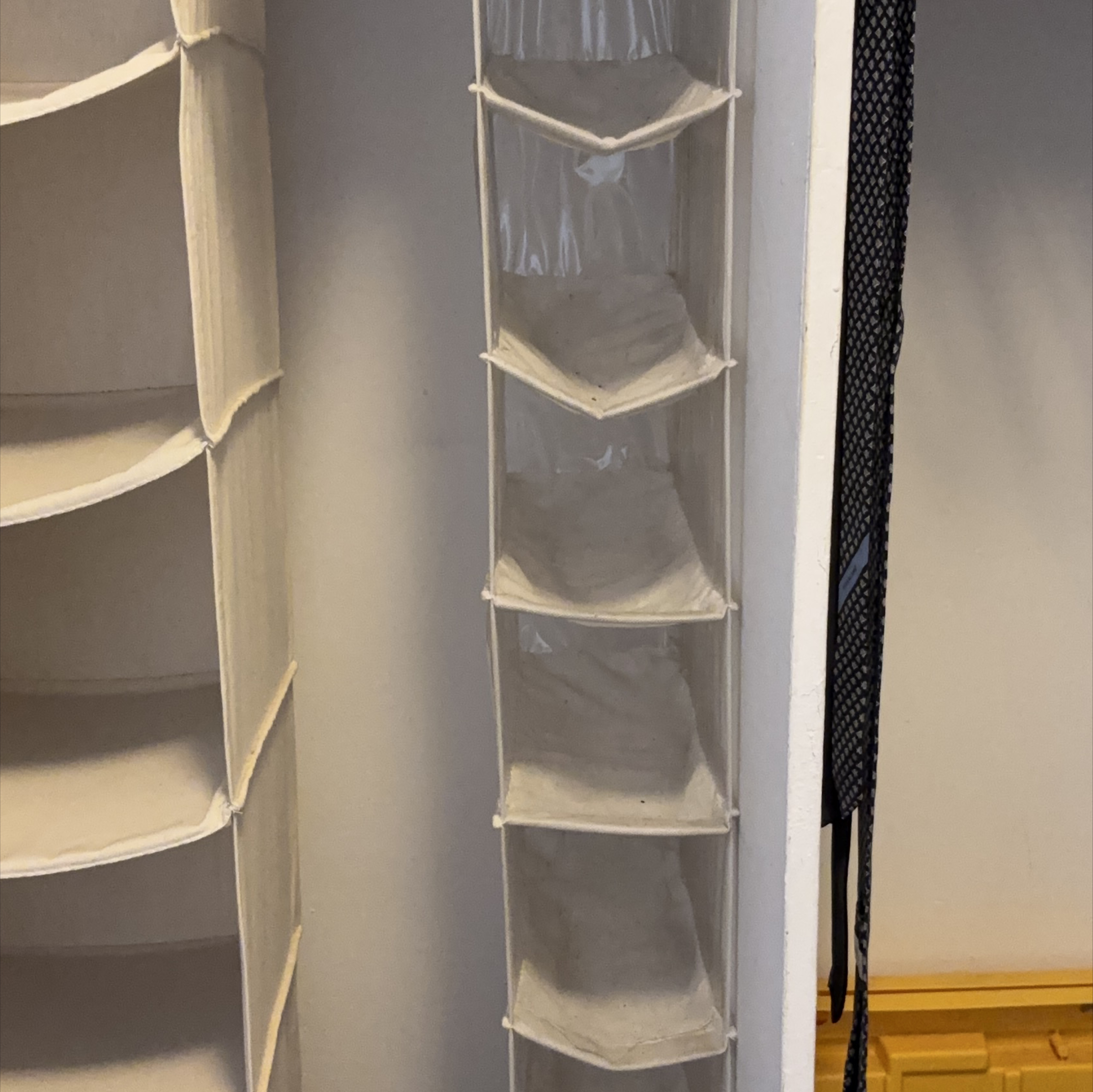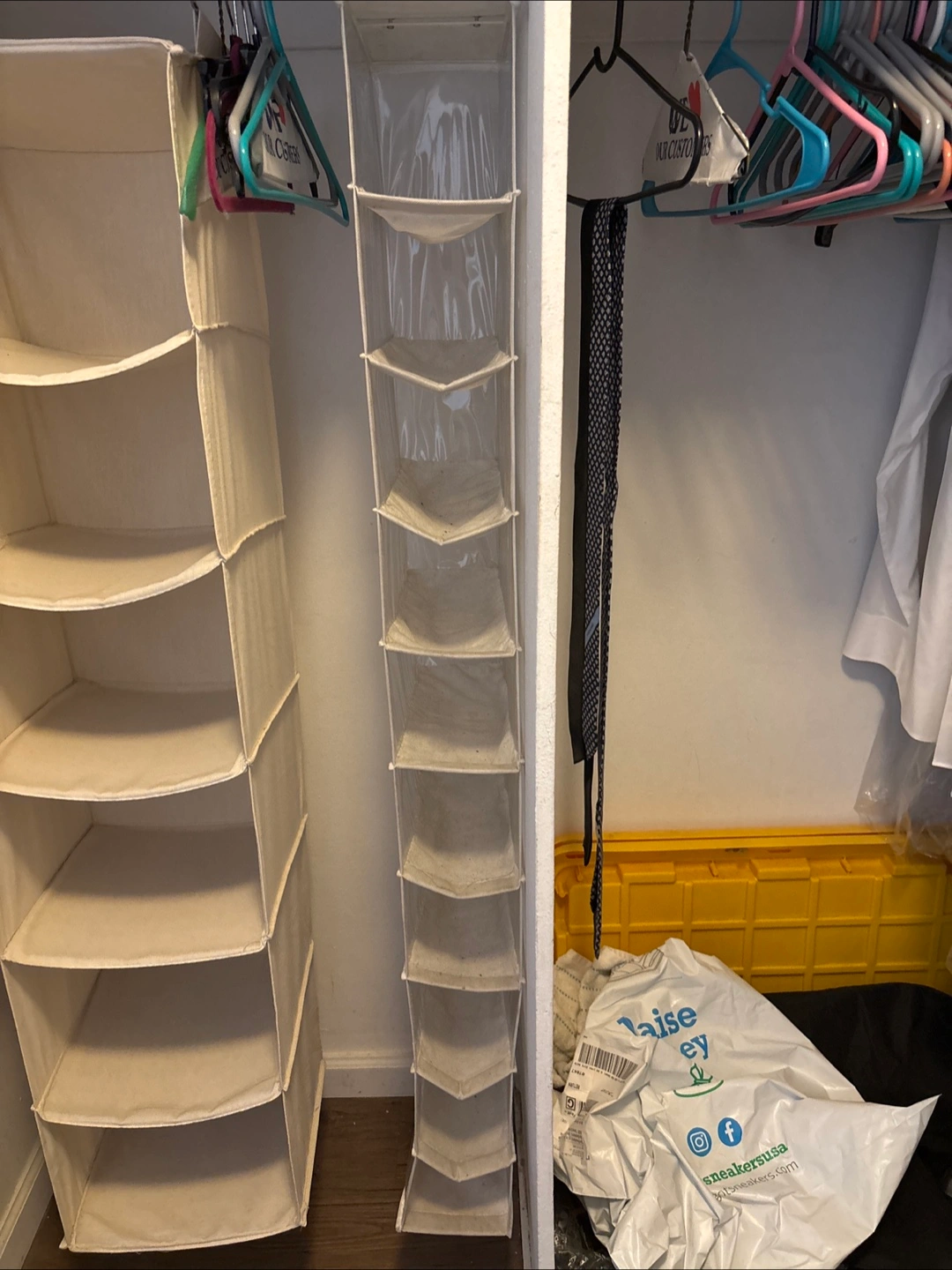 Two beige fabric hanging closet organizers. One is a standard shelf organizer, the other is a shoe organizer with clear plastic fronts. Great for closets or dorm rooms.
