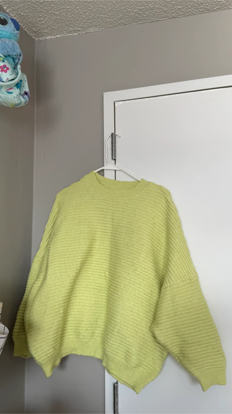 60Selling a cozy, oversized knit sweater in a light green color! It's perfect for layering or just lounging around the house