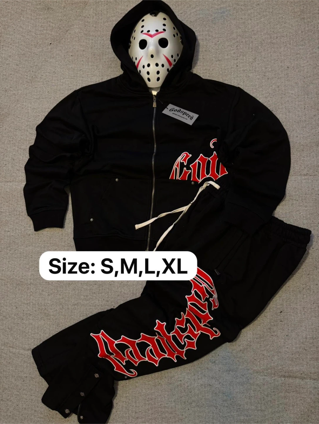Godspeed black tracksuit, available in size S. Features a unique design. Perfect for casual wear or workouts!