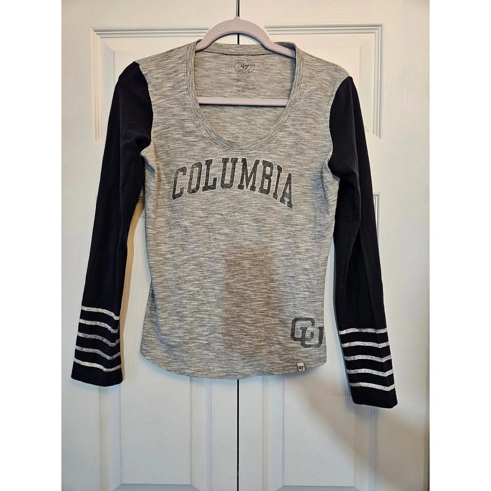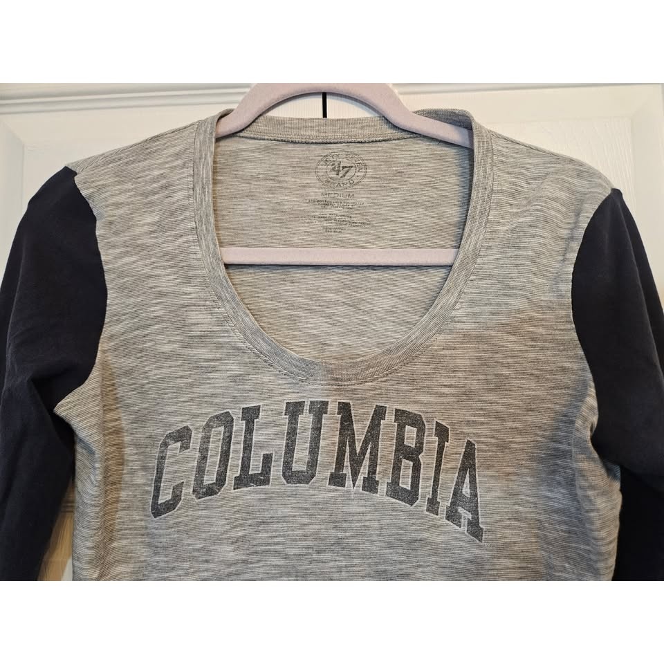 Vintage '47 Brand Columbia University collegiate colorblock long sleeve baseball tee in heather gray and navy blue. Women's size medium. Excellent, gently pre-loved condition with no stains, tears, or marks. Comes from a smoke-free and pet-free home.