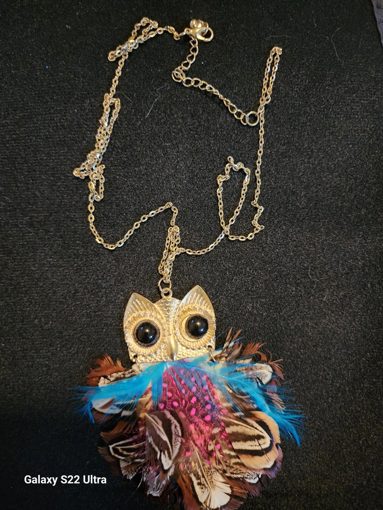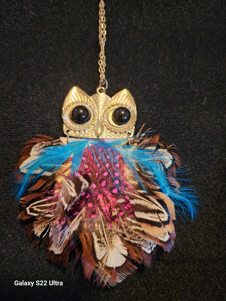 Unique owl necklace with colorful feathers! The owl's eyes are black, and the feathers are a mix of brown, blue, and pink. The chain is gold-colored. ALL SALES FINAL