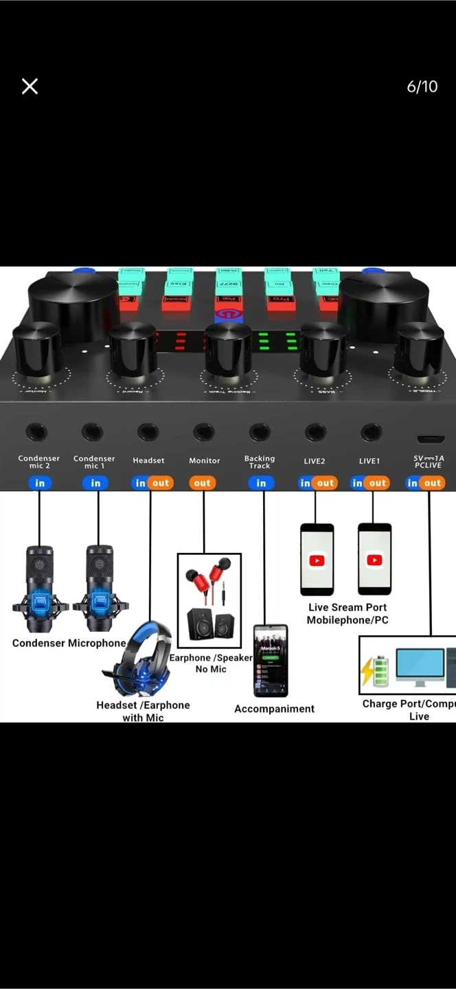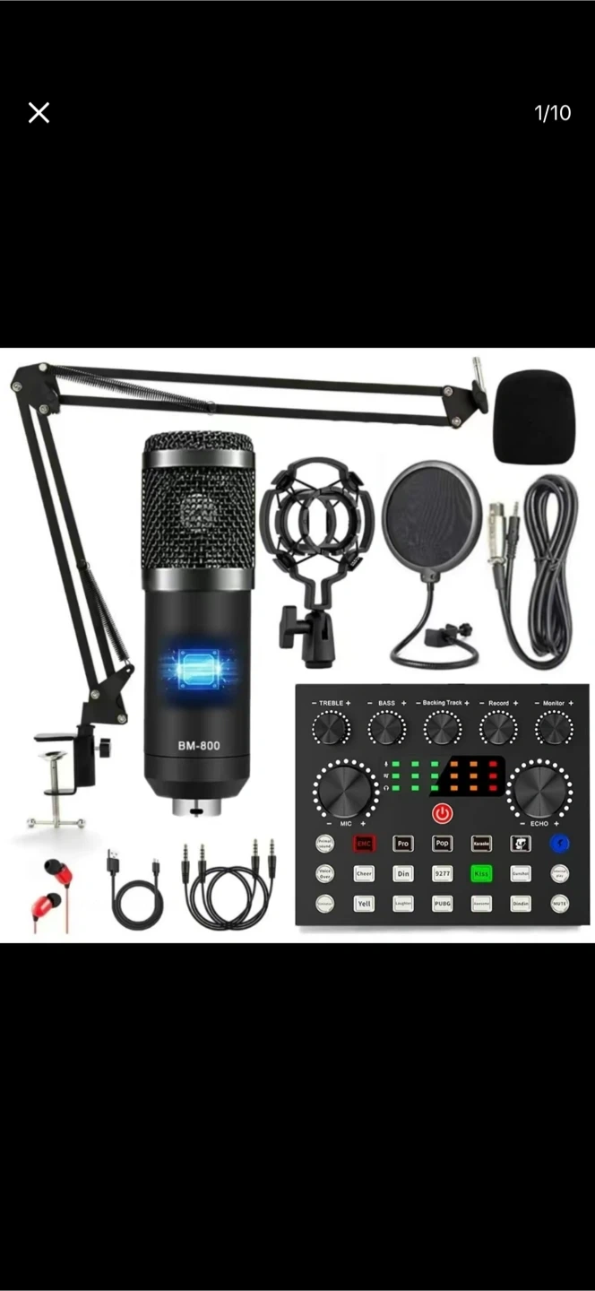 Selling a podcast microphone bundle with a multifunctional sound card! It features colorful volume indicators and 10 kinds of sound effects buttons. The condenser microphone is 16mm in diameter and has a professional sound chipset. It's made with superior quality metal material and offers high sensitivity with low noise.