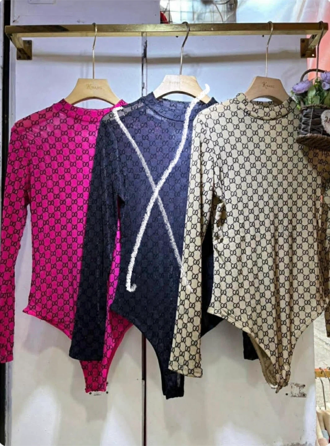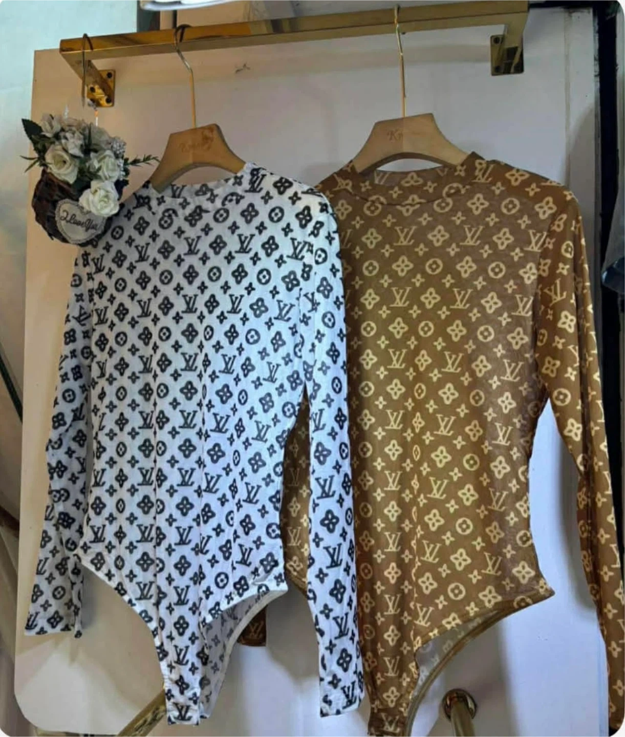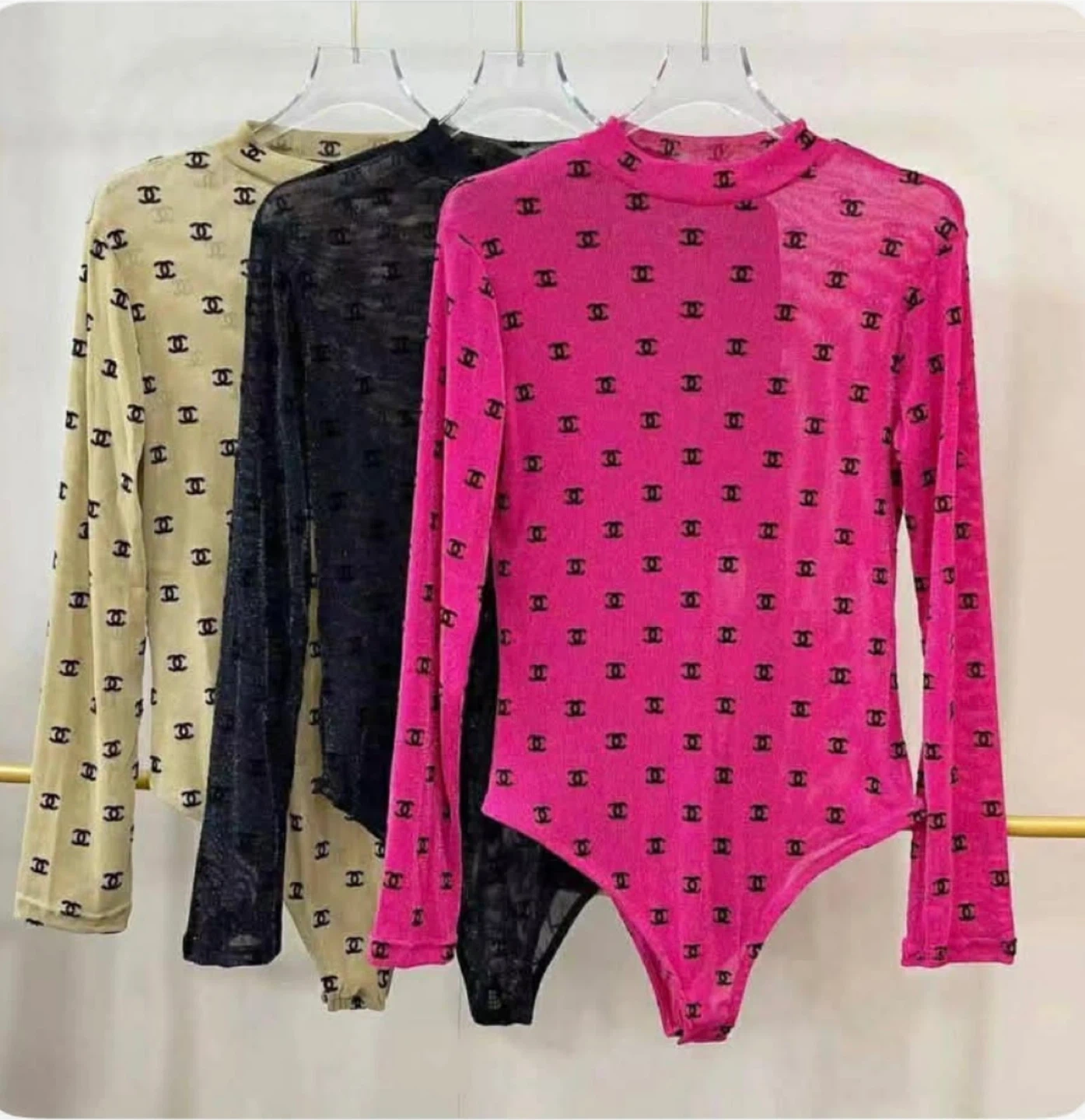 Sheer long sleeve bodysuit with all-over monogram print. Available in multiple colors. Material is lightweight mesh fabric.