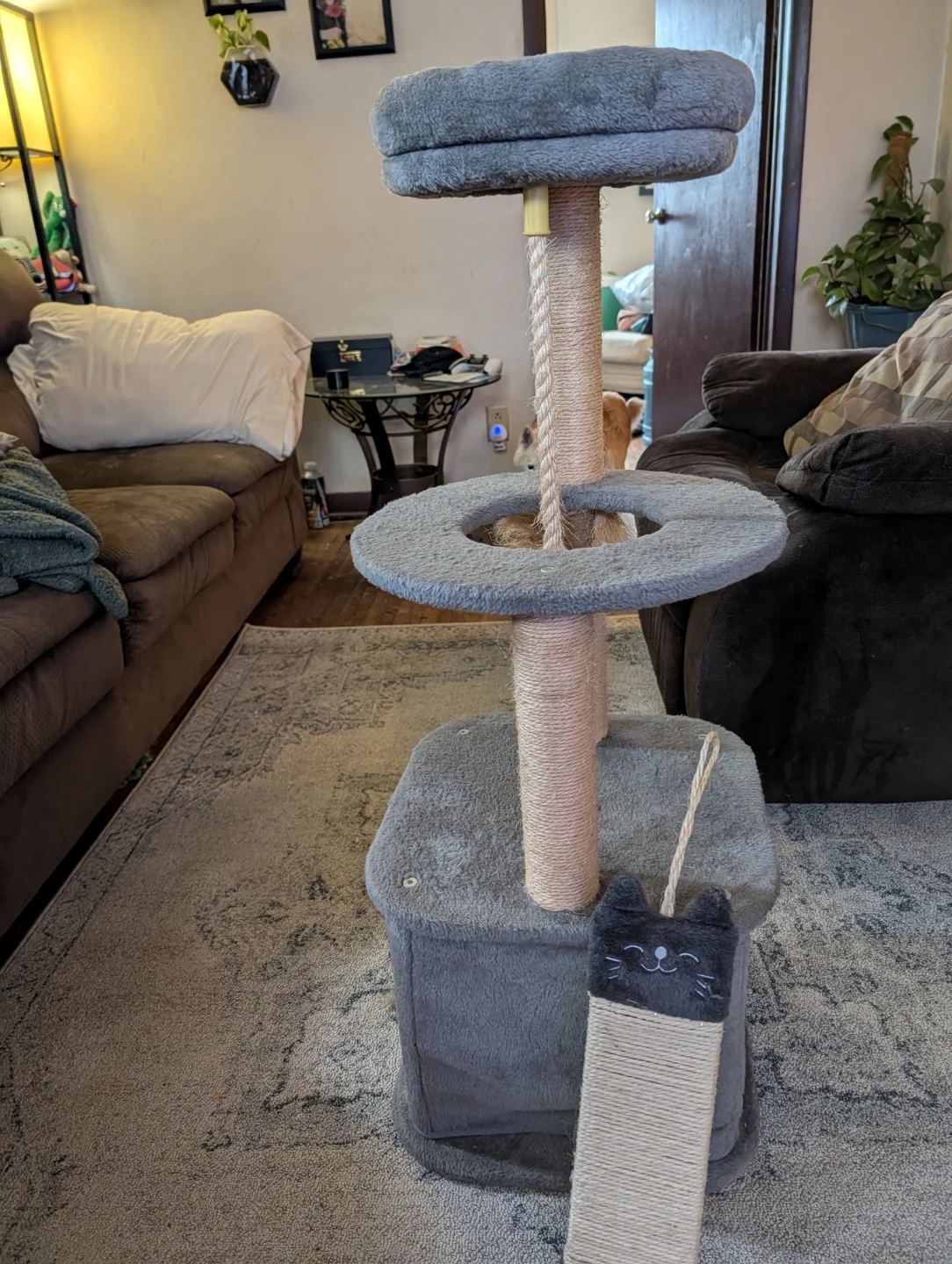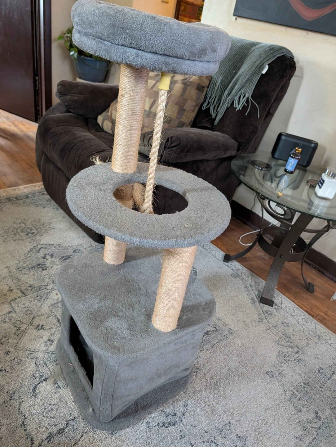 This cat tree features multiple levels and scratching posts for your feline friends. It includes a cozy cubby for napping and sisal rope for scratching. This is a great way to keep your cat entertained and off your furniture! Used condition.