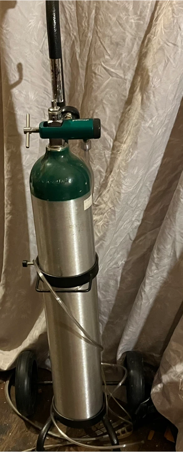 15Selling an oxygen tank with a cart. It appears to be in good condition and ready for use